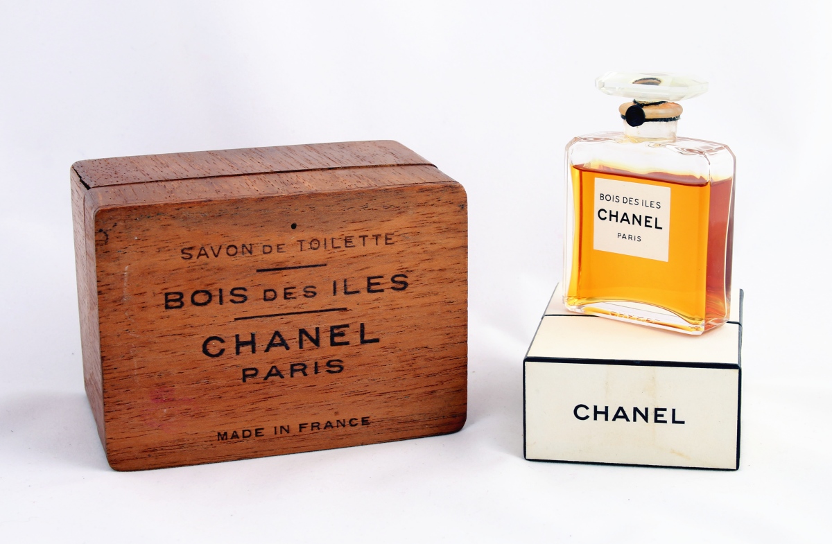 Lot comprenant un flacon modèle "carré Malévitch" en verre incolore pressé moulé contenant du parfum d'origine, et une boite à savon en teck titré de forme rectangulaire.