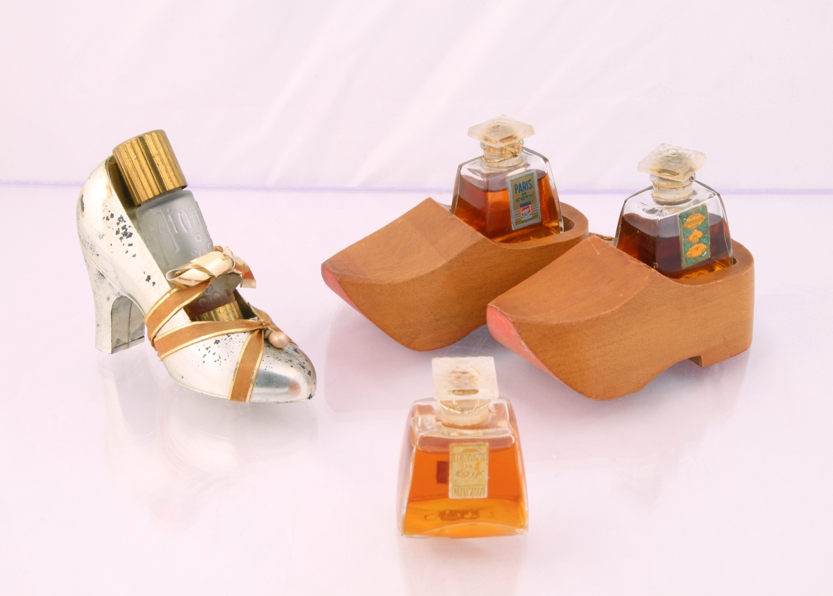 Assortiment de présentation fantaisie : une paire de sabots de Noël contenant chacun un flacon d'extrait avec leur étiquette, un flacon d'extrait pyramidal tronqué, et un escarpin en résine contenant un flacon d'extrait.