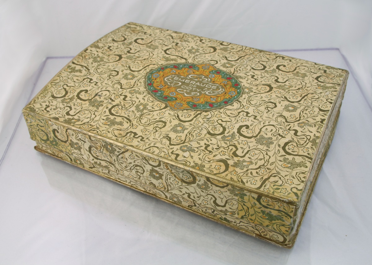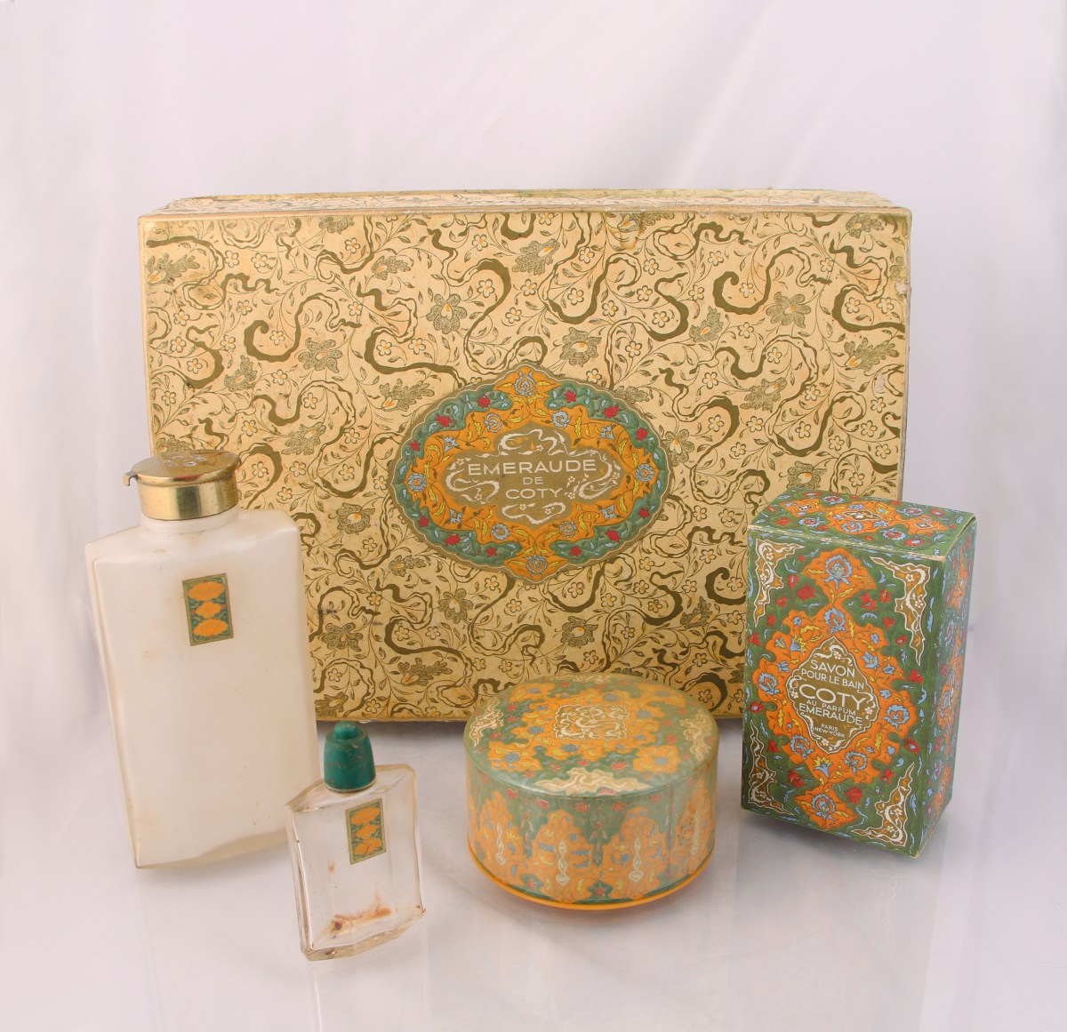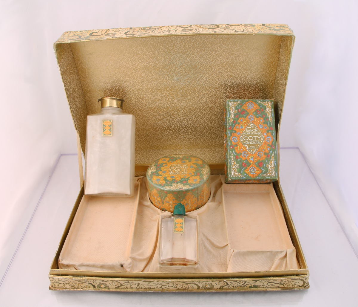 Important coffret export rectangulaire en carton gainé de papier illustré polychrome de motifs orientalistes, intérieur satin, titré, comprenant un flacon d'extrait, un flacon de talc, une boite de poudre parfumée, et un savon assorti.