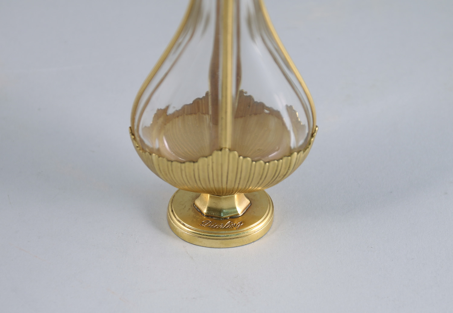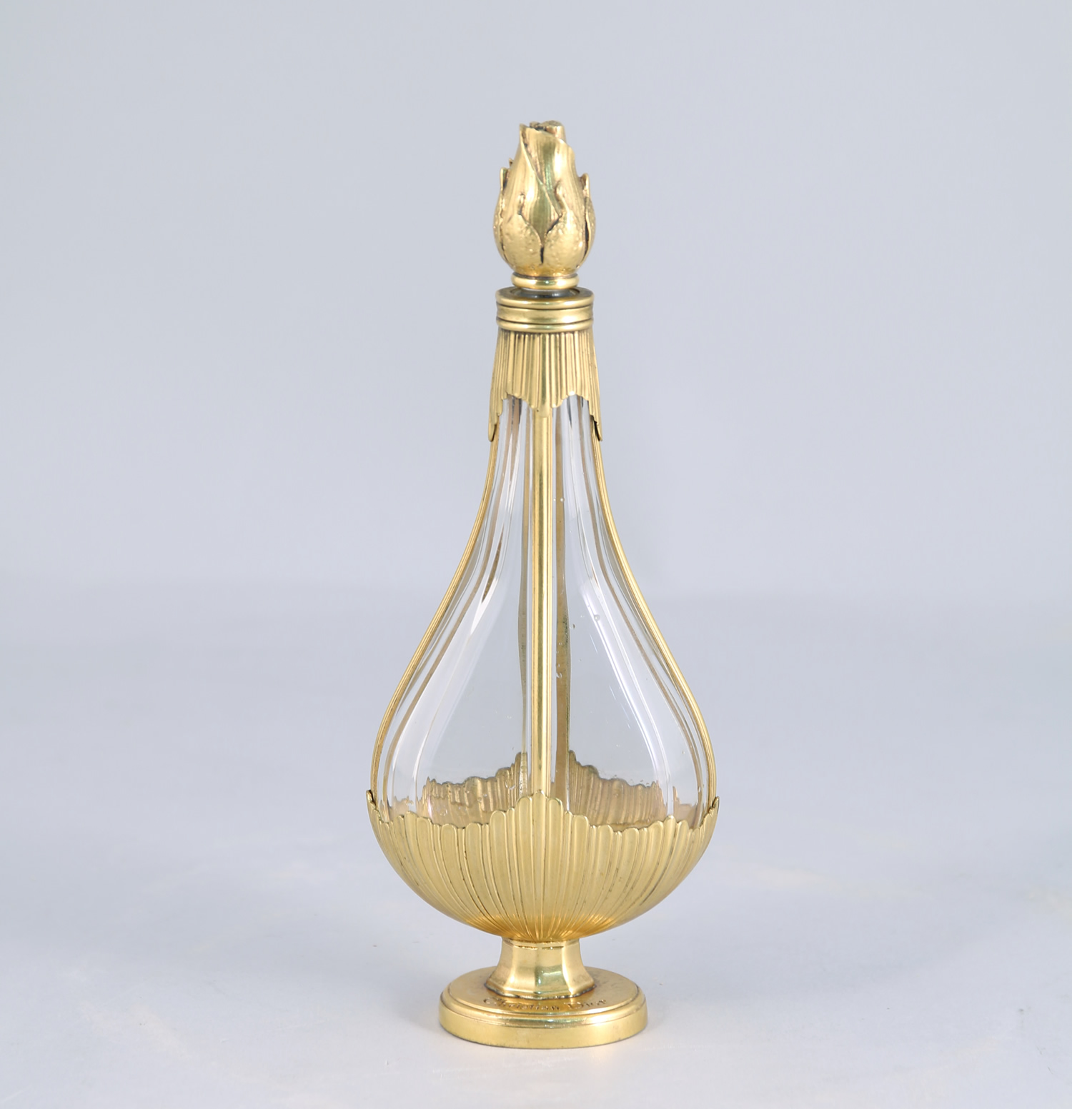 Luxueux flacon en cristal incolore pressé moulé de Baccarat carrossé de bronze doré figurant une amphore sur piedouche à décor de deux coquilles style Louis XV, surmonté de son bouchon en bronze ciselé figurant un bouton de rose. Titré sur le piedouche et numéroté. Monture en bronze crée par la Maison Charles à Paris.