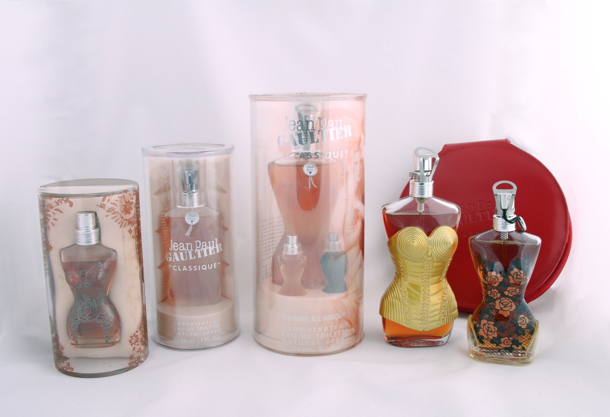 Lot comprenant cinq flacons modèles "buste de Madonna" contenant 30ml d'eau de toilette, 30 ml d'extrait, 100 ml d'eau de toilette, 100 ml d'eau de parfum et 50 ml d'eau de parfum.