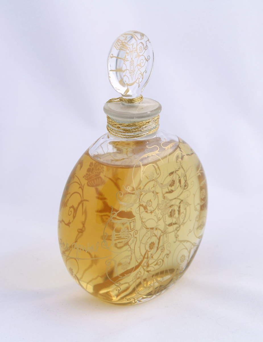 Flacon en cristal incolore pressé moulé de Baccarat de section cylindrique, sa panse "médaillon" bombée galbée et bouchon disque richement décorés de brocards or, numéroté. scellé avec PdO.