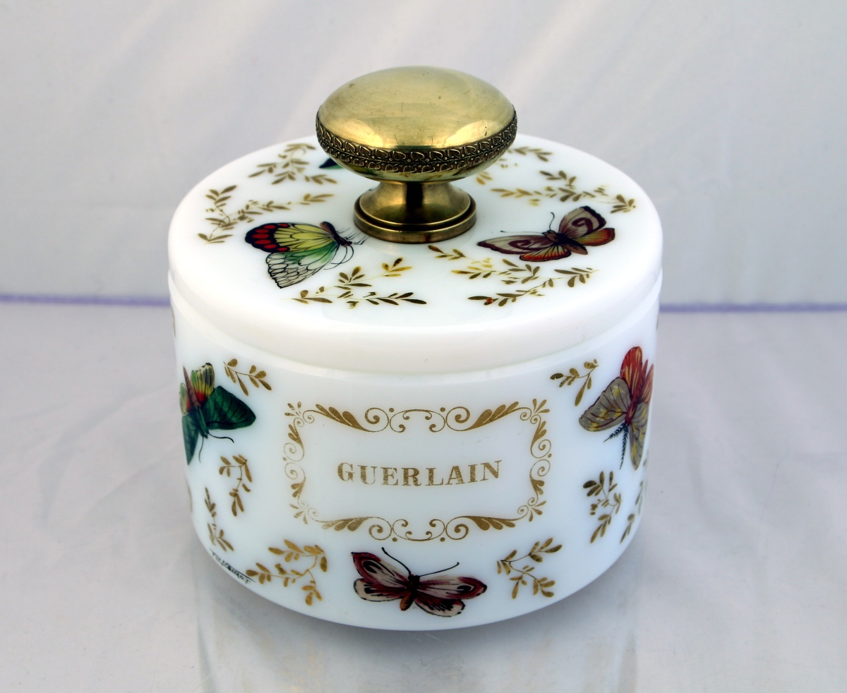 Rare et luxueux poudrier en opaline savonneuse de section cylindrique forme tambour, sa base et son couvercle décorés main d'une constellations de fleurettes dorées et de papillons multicolores, prise du couvercle en bronze doré ciselé.