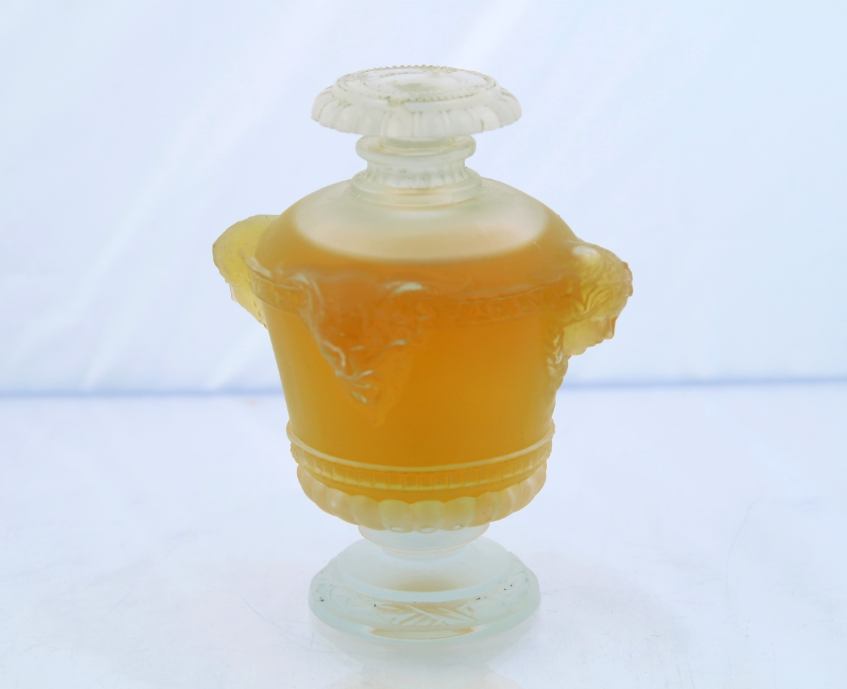 Flacon en verre incolore pressé moulé dépoli satiné figurant un Vase Médicis sur piedouche à décor en relief de deux têtes de nymphes et de deux têtes de faunes, son bouchon disque dentelé et perlé, (éclat au piedouche), numéroté.
