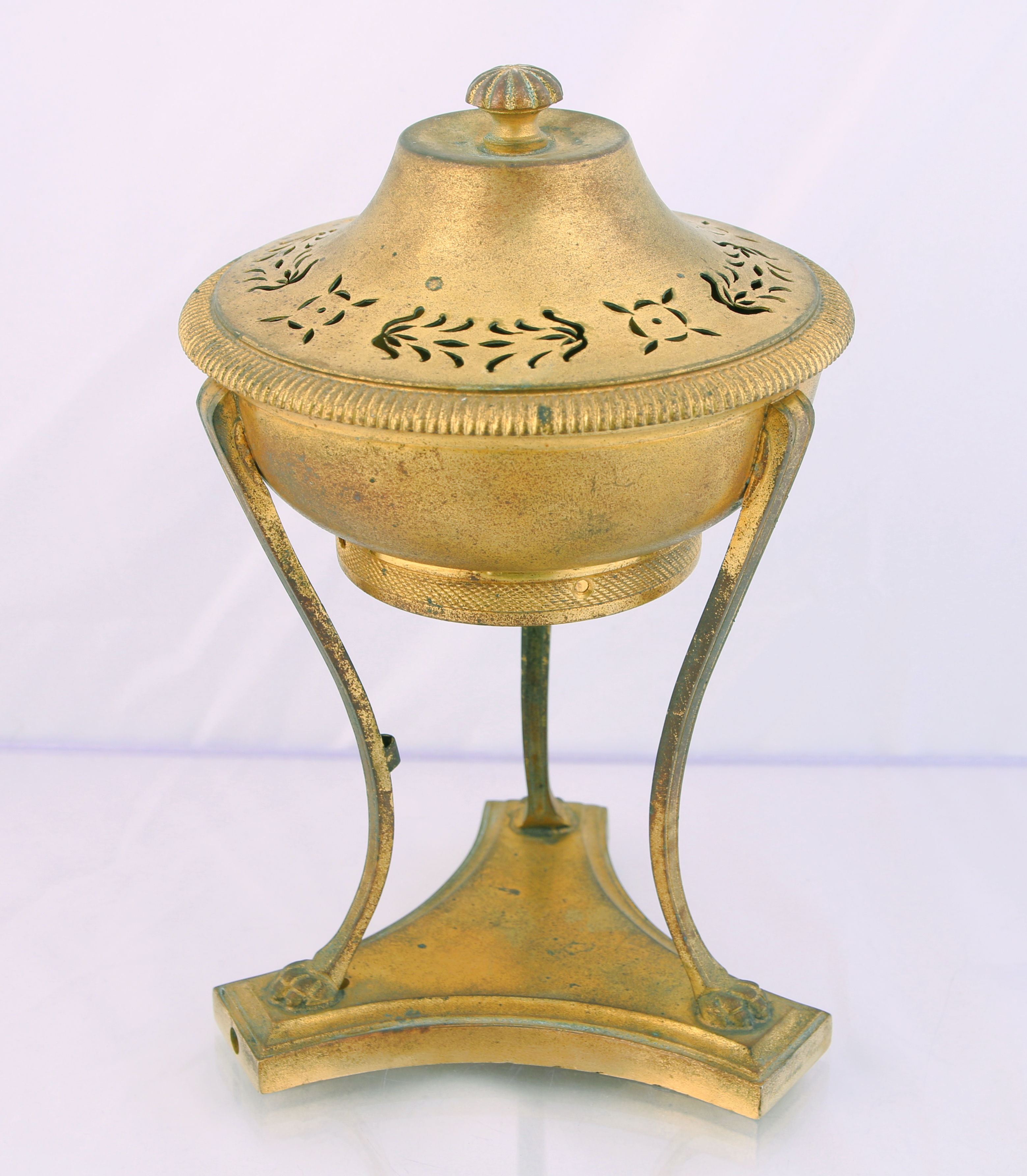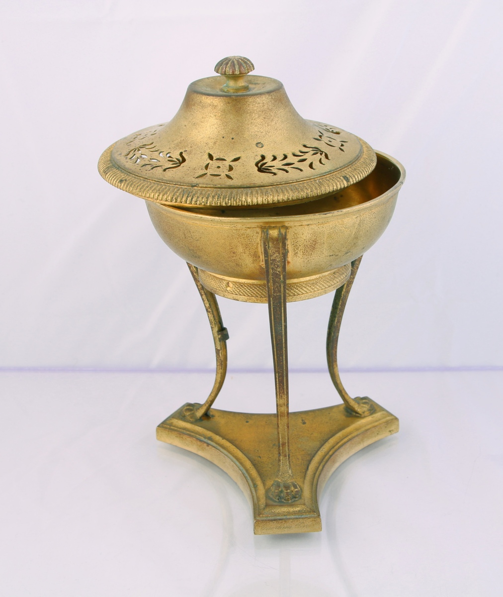 Rare brûle-parfum en bronze doré de style Directoire : la cassolette ouvragée reposant sur trois pieds curvex sur socle titré.