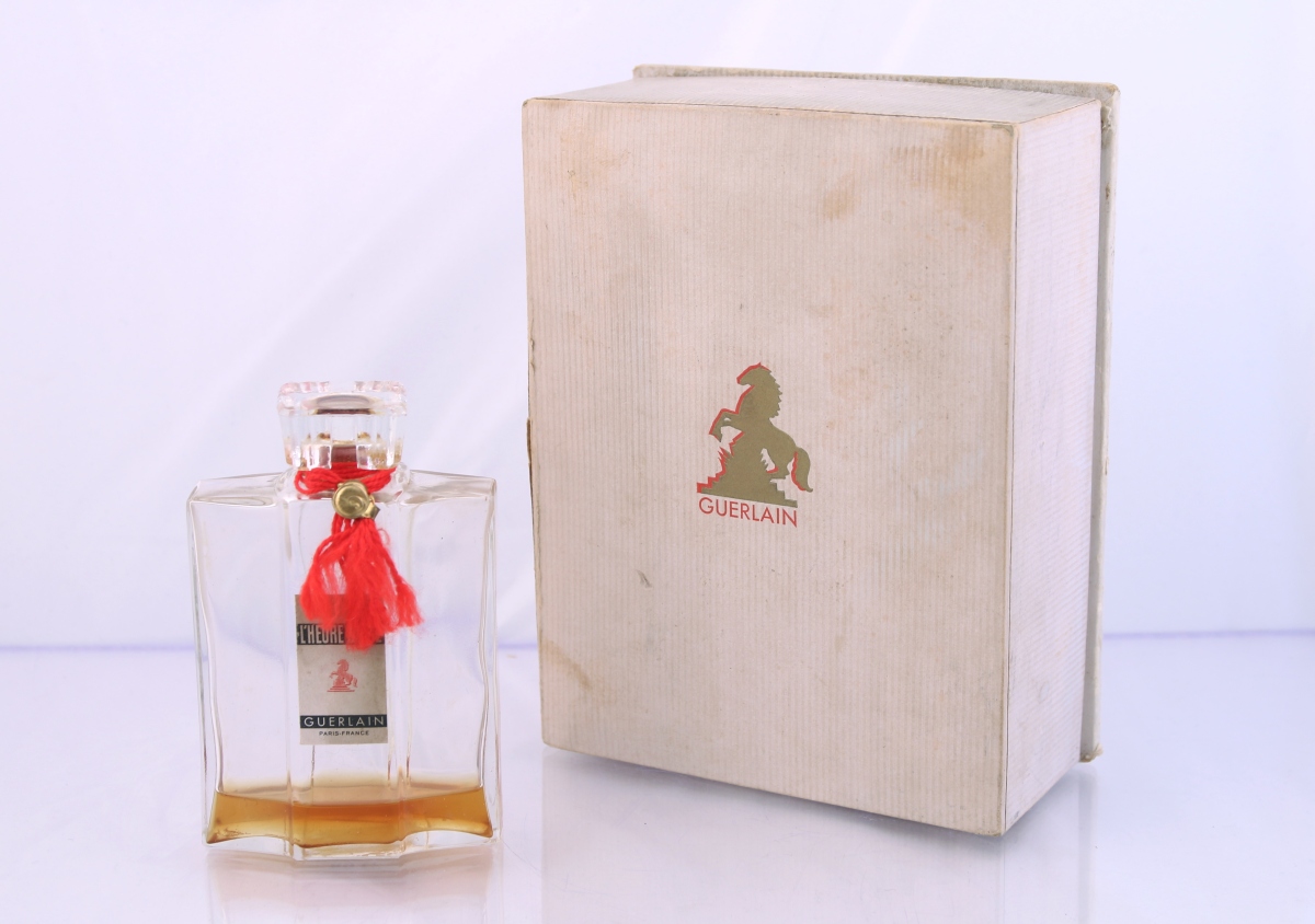 Présentation spéciale de guerre : coffret rectangulaire en carton gainé de papier blanc gaufré, intérieur papier rouge, siglé et titré, flacon tank en verre incolore pressé moulé de section rectangulaire, en forme de borne à godron central, avec son étiquette au cheval de Marly, et son bouchon carré cranté.