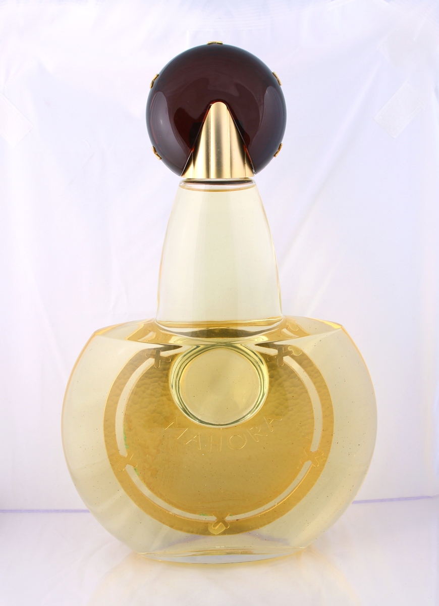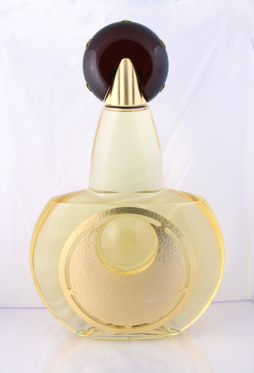 Flacon publicitaire décoratif en verre incolore pressé moulé , modèle "Totem".