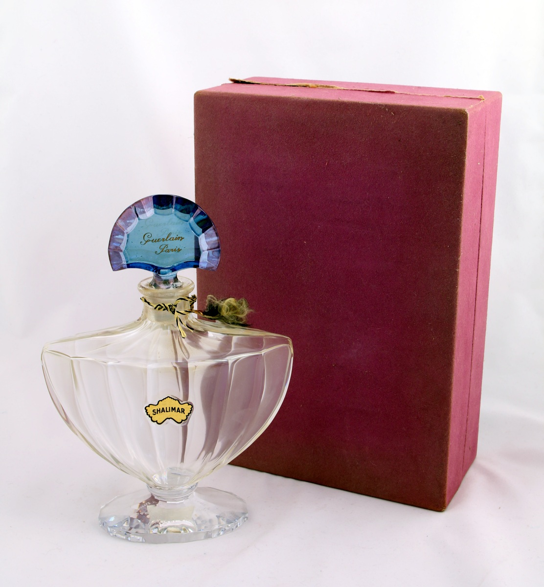 Présenté dans son coffret rectangulaire en peuplier gainé de papier feutrine mauve, titré, flacon en cristal incolore pressé moulé de Baccarat en forme d'urne côtelée sur piedouche facetté, son étiquette sur cartouche, coiffé de son bouchon "éventail" en cristal émaillé bleu titré. numéroté.