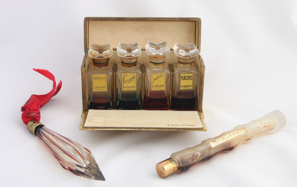 Lot comprenant deux flacons de sac modèles "pampille" et "baton de magicien" en verre incolore avec capsule de laiton titré, et un coffret rectangulaire en carton gainé de papier gaufré or et rose illustré contenant quatre flacons d'extrait modèles "flacon - bouchon convexe" avec leur étiquette , parfums "Tropiques" , "Flèches", "Peut Etre" , "Flèches".
