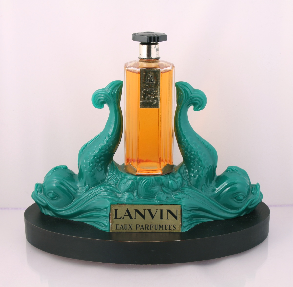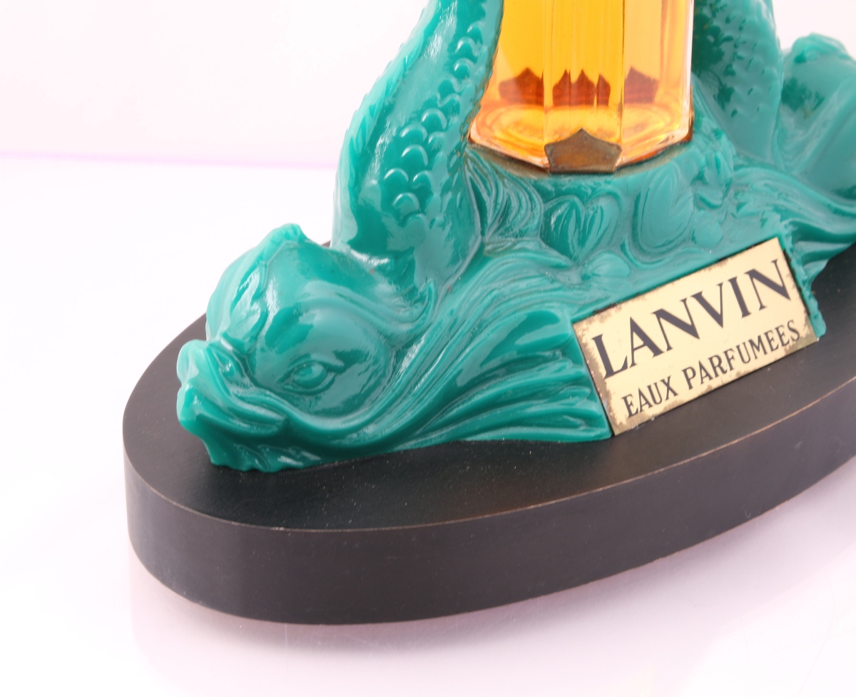 Rare présentoir en résine moulé figurant deux dauphins laqués verts, socle noir, avec flacon rainuré "eau de Lanvin".