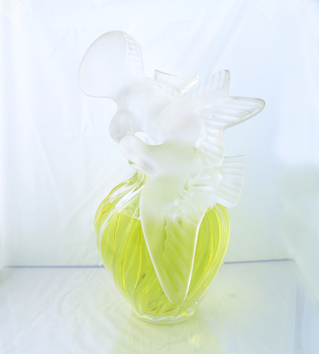 Flacon publicitaire décoratif version de 1951 en cristal incolore pressé moulé partiellement dépoli figurant une urne rainurée en spirales coiffé de son bouchon figurant deux colombes aux ailes déployées.