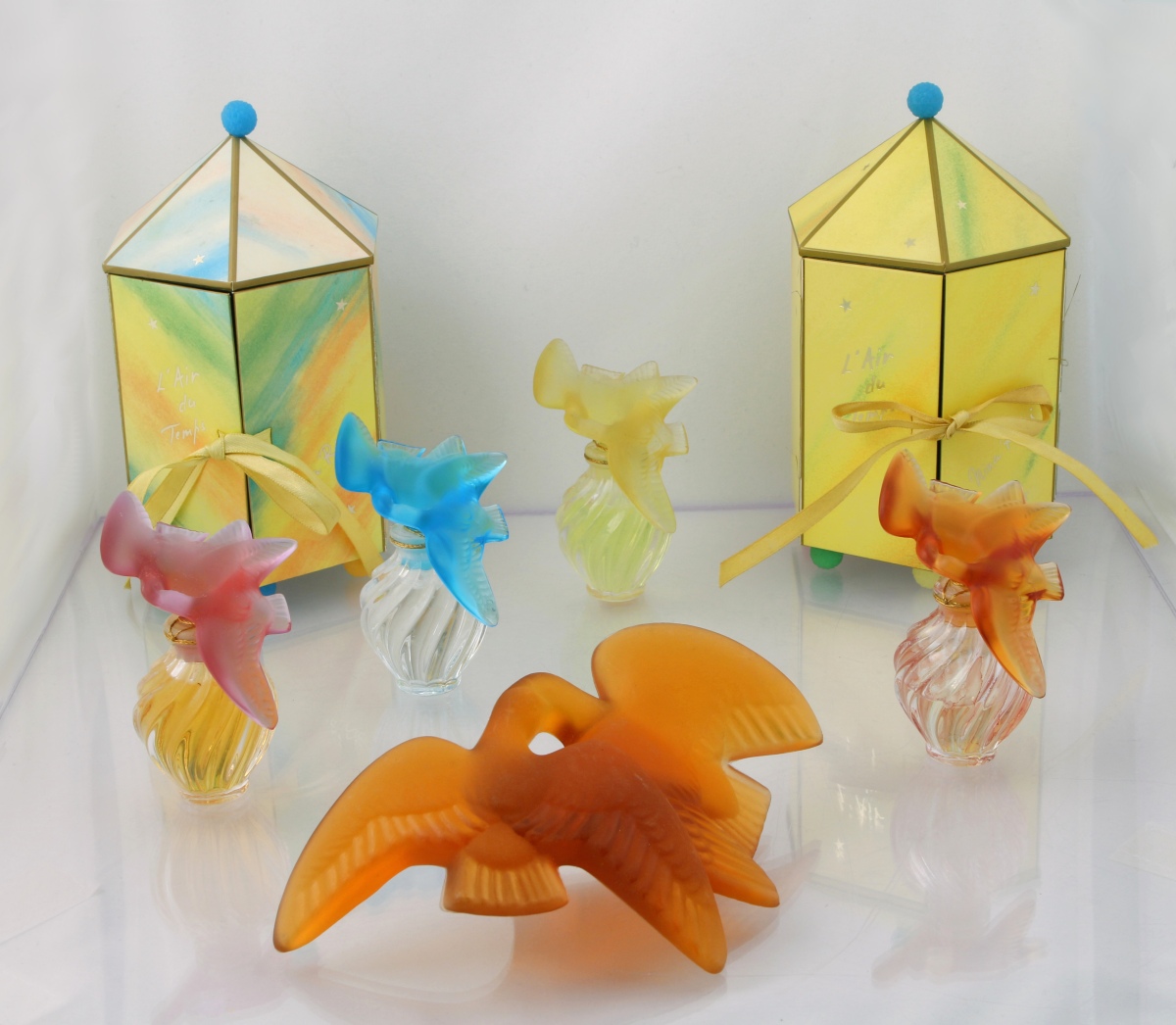 Lot comprenant quatre flacons en cristal Lalique modèles au bouchon deux colombes en cristal de couleur, deux présentés avec leur coffret carrousel en carton gainé de papier jaune, titré. signés Lalique. Couleurs des bouchons : bleu électrique, grenadine, cognac, jaune citron.
