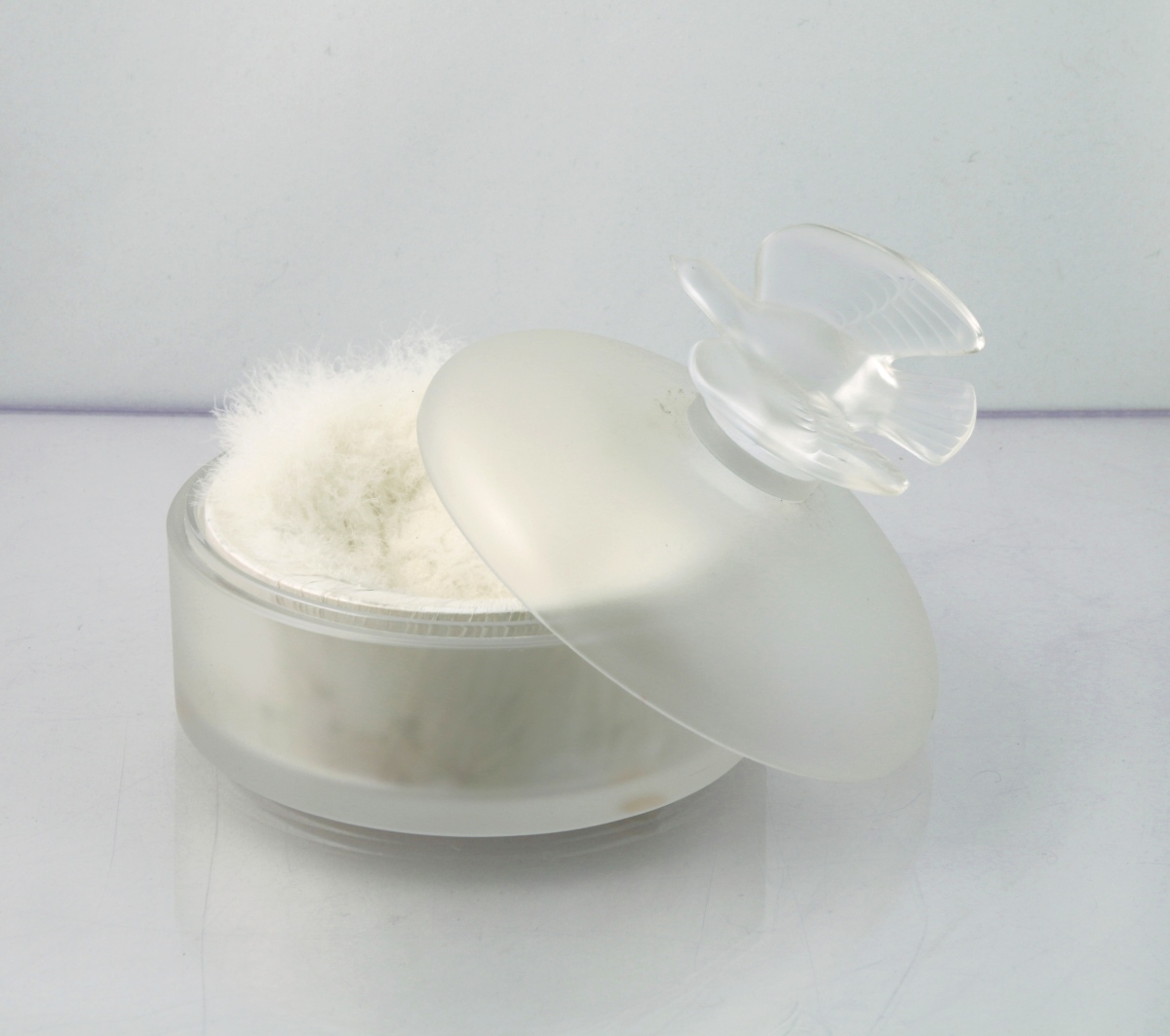 Poudrier cylindrique forme tambour en cristal incolore pressé moulé dépoli satiné, la prise de son couvercle figurant une colombe aux ailes déployées, (PdO), modèle créé et édité par Marc Lalique, signé.