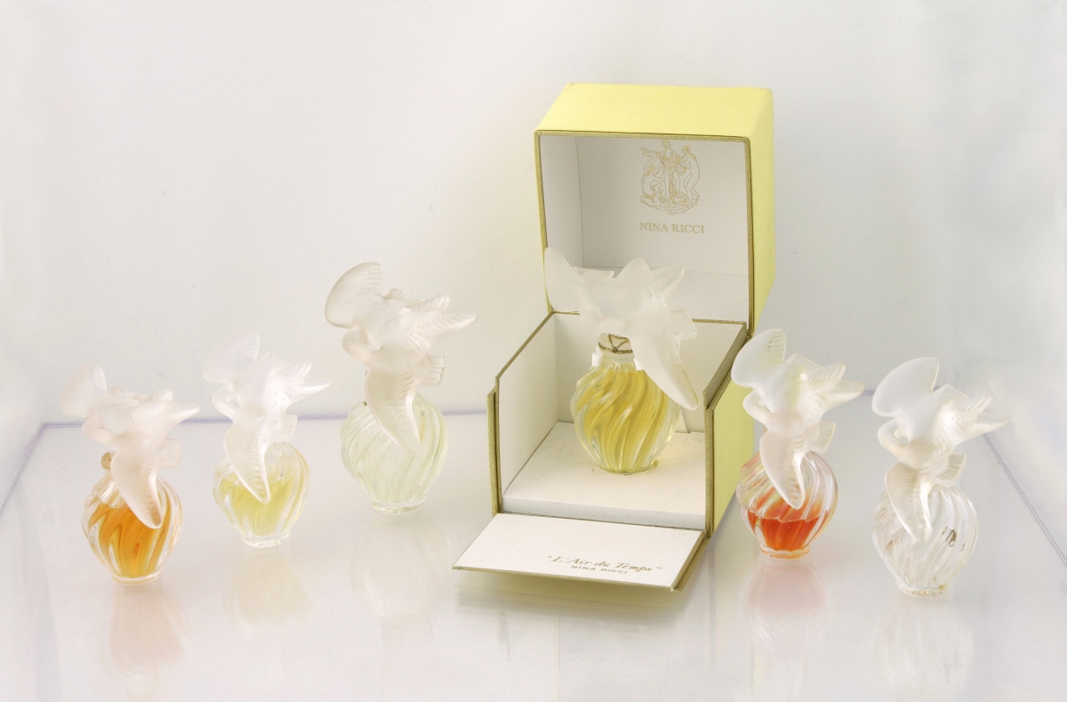 Série de six flacons en cristal incolore pressé moulé partiellement dépoli, modèles "urne rainurée - bouchon aux deux colombes", un avec son coffret cubique, dessinés par Marc Lalique, signés.