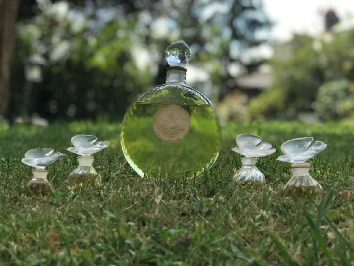 Lot comprenant quatre flacons en cristal incolore pressé moulé partiellement dépoli, modèles "urne rainurée - bouchon à une colombe", et un flacon "médaillon" en verre incolore pressé moulé avec bouchon boule et étiquette (défraichie).