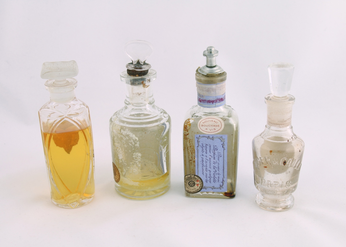 Lot comprenant quatre flacons en verre incolore pressé moulé avec leur étiquette, parfums "Salvia", "Violette de Parme", "Extrait Double" et Brillantine surfine.