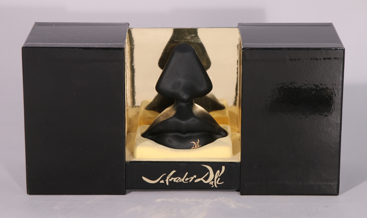 Présenté dans son coffret cubique en carton gainé de papier noir et or titré à fermeture coulissante, flacon en verre opaque noir figurant le nez et la bouche de la Vénus de Cnide dessiné d'après un tableau du maitre.