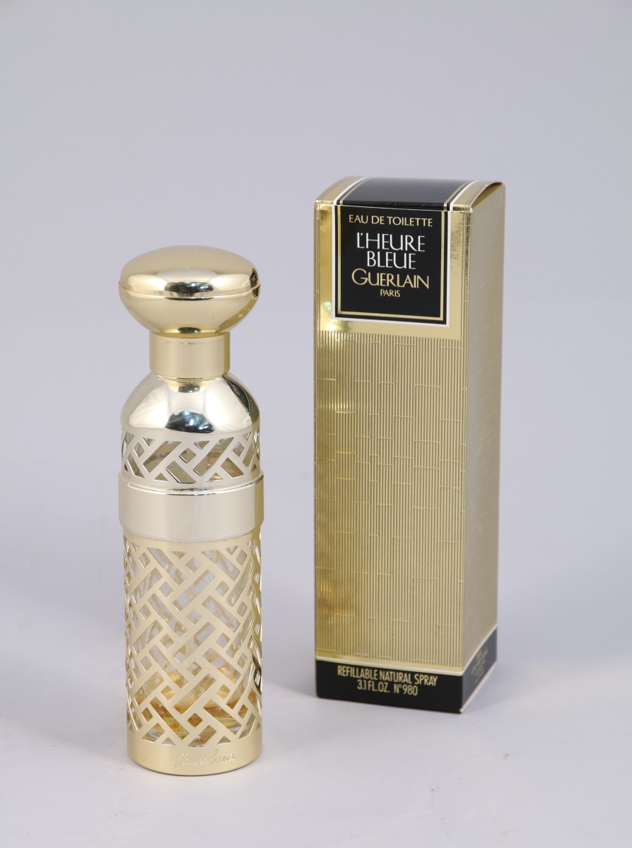 Lot comprenant les flacons "Vison" et "Vison Noir" de Robert Beaulieu; le flacon "L'Insolent" de Charles Jourdan et le flacon "L'Heure Bleue" de Guerlain.