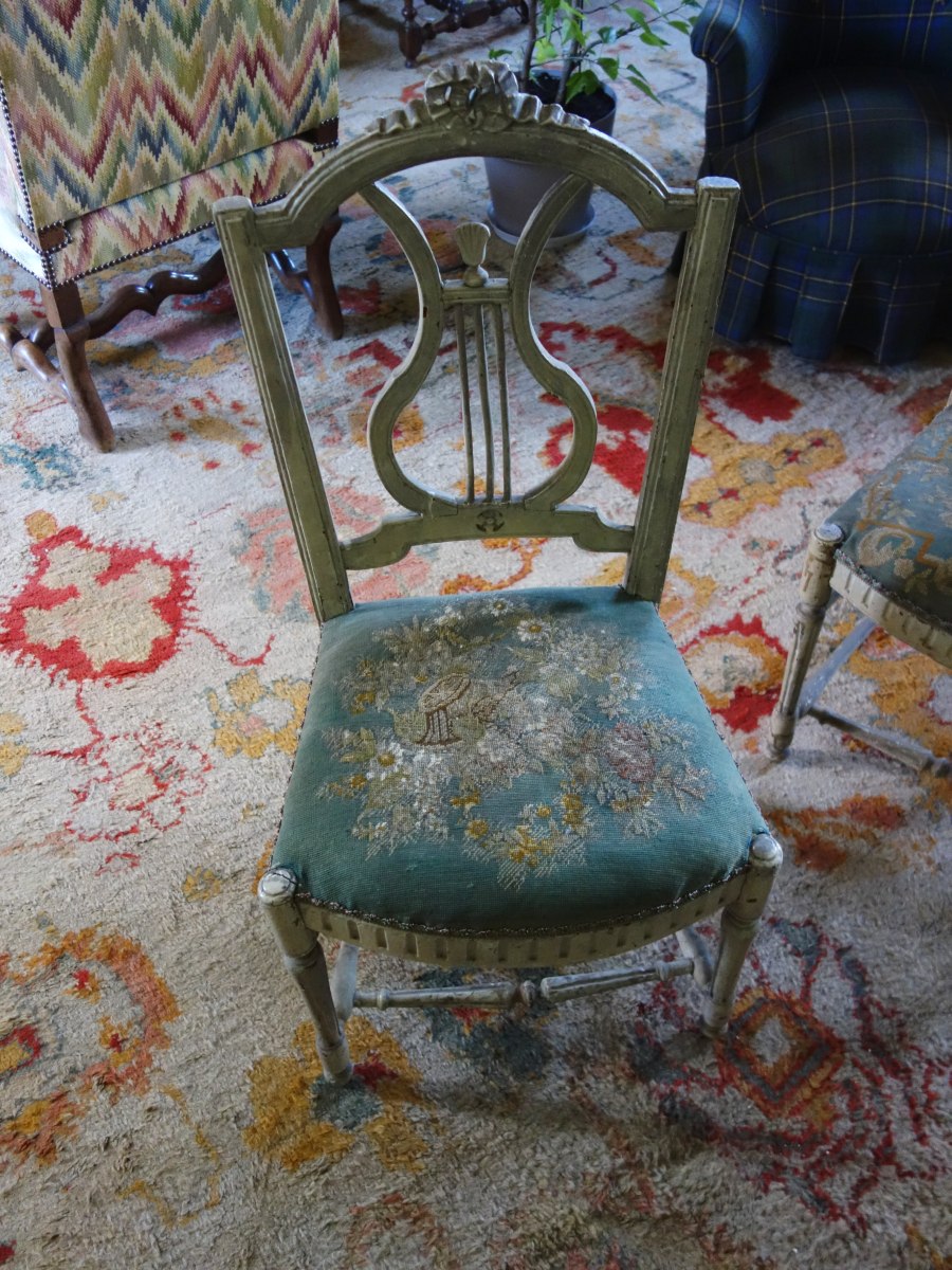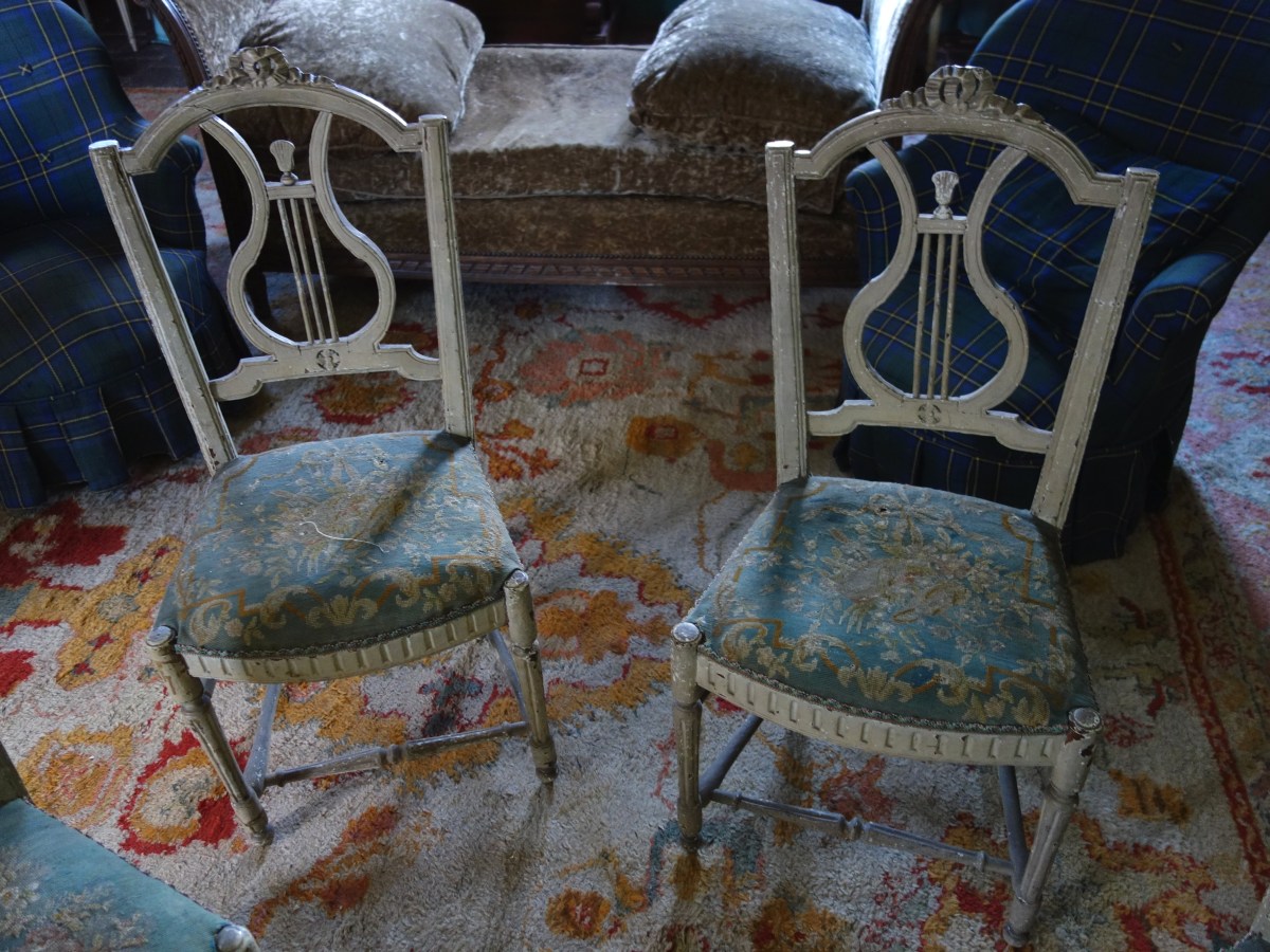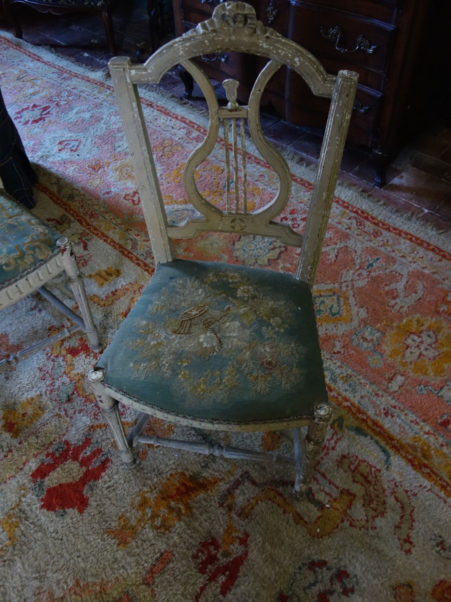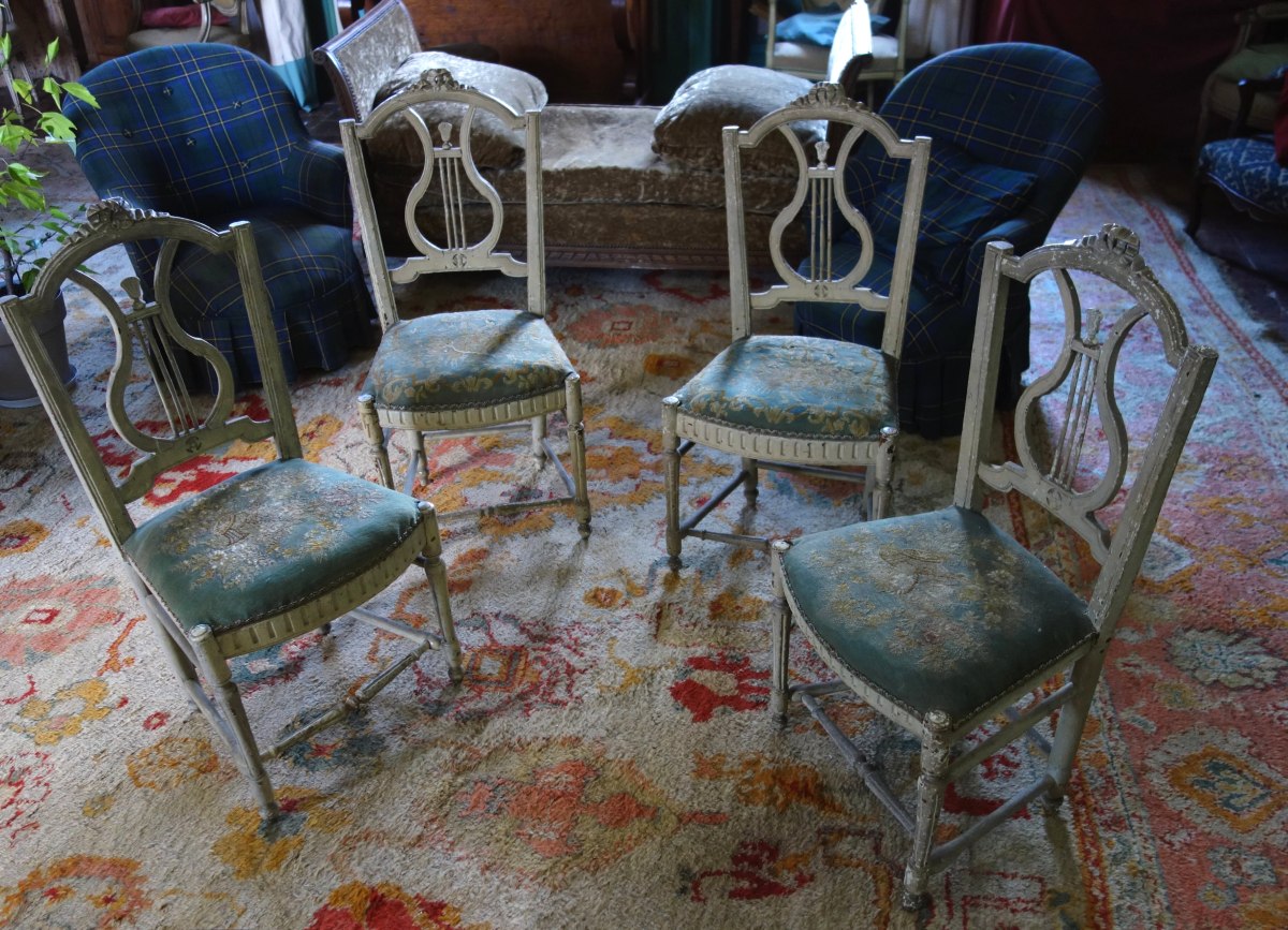 SUITE DE QUATRE CHAISES LYRE en bois mouluré, sculpté et laqué. Composées de dossier ajouré, reposant sur des pieds fuselés à cannelures, décor de rubans noués et ajourés.