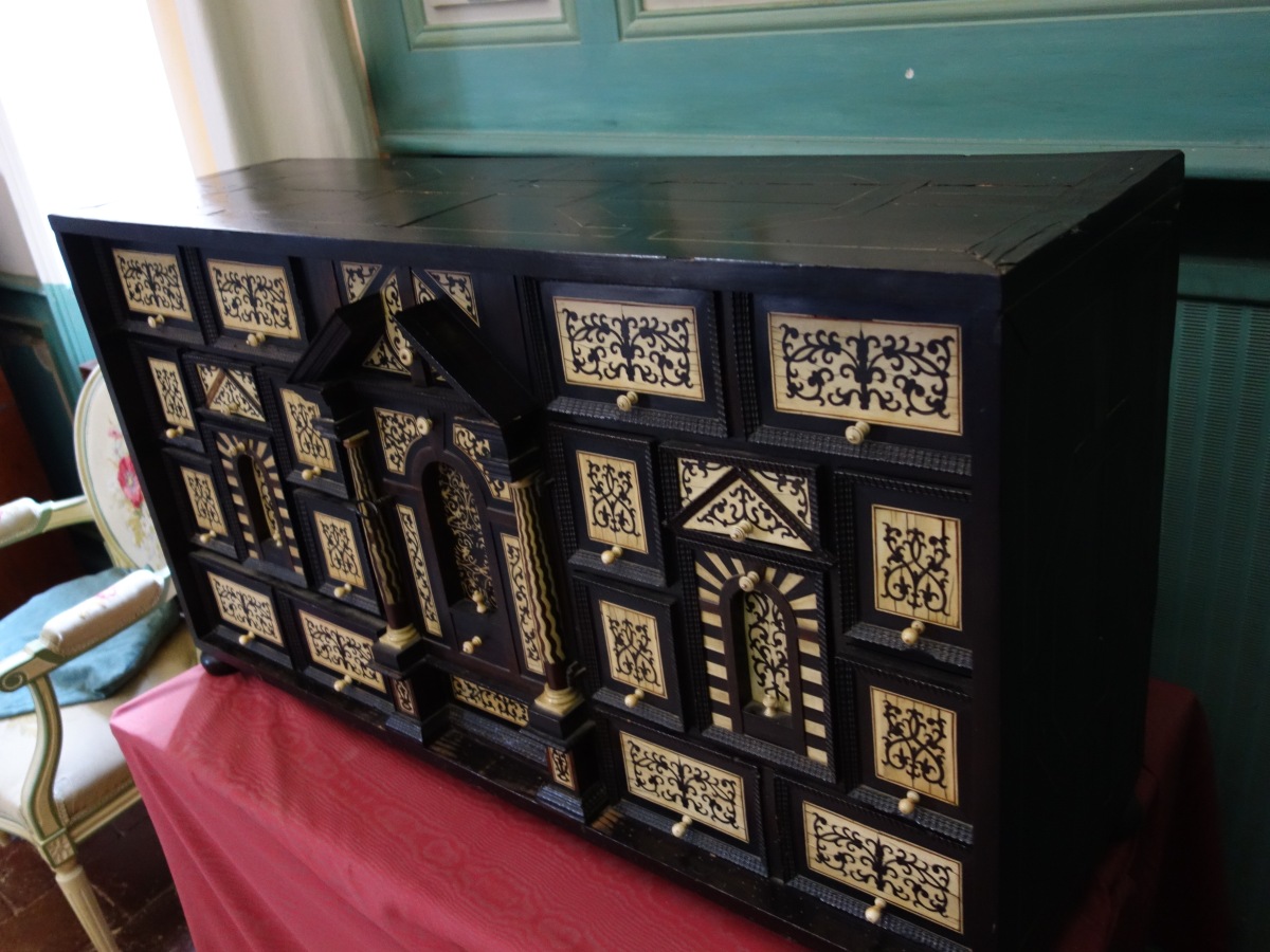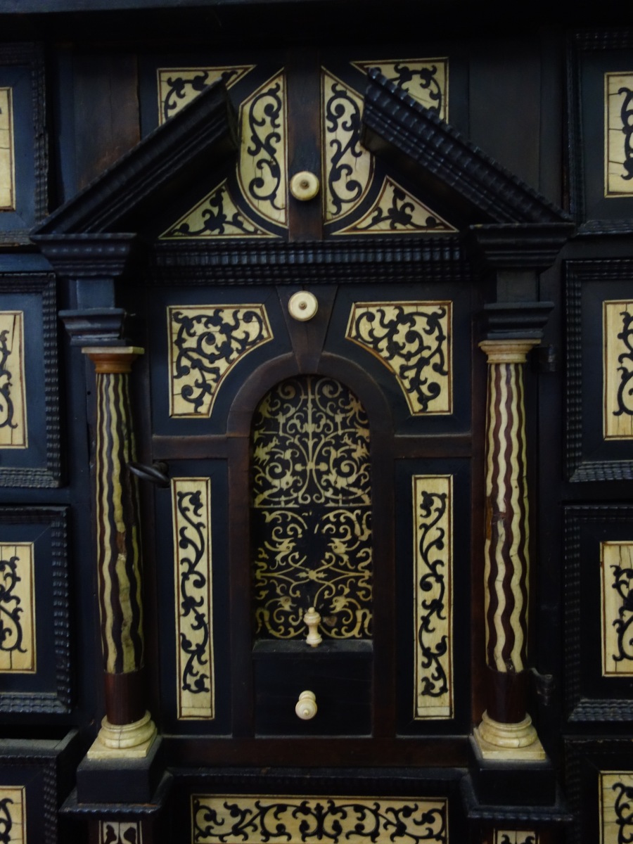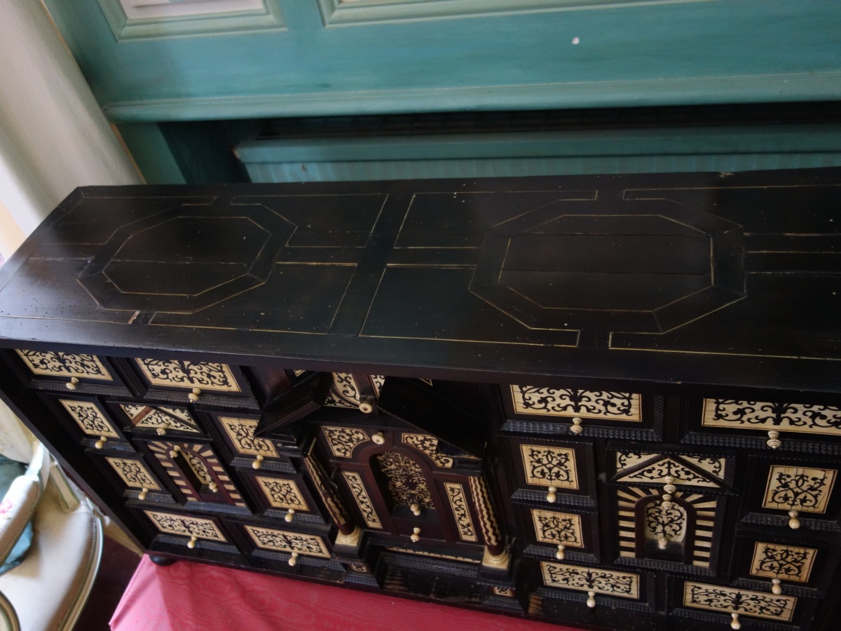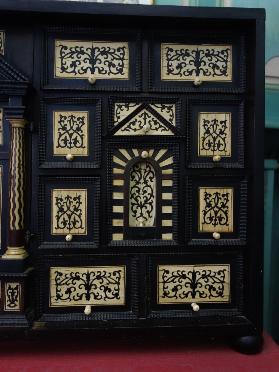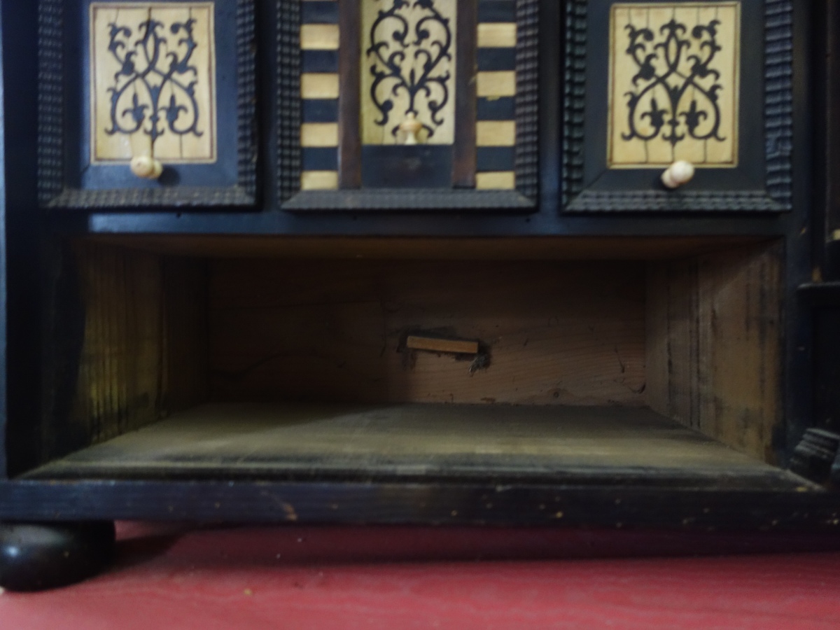 GRAND CABINET à poser en ébène et bois noirci à décor de motifs géométriques en ivoire. Il ouvre à 19 tiroirs encadrant un vantail à colonnes soutenant un fronton, découvrant une niche en théâtre.