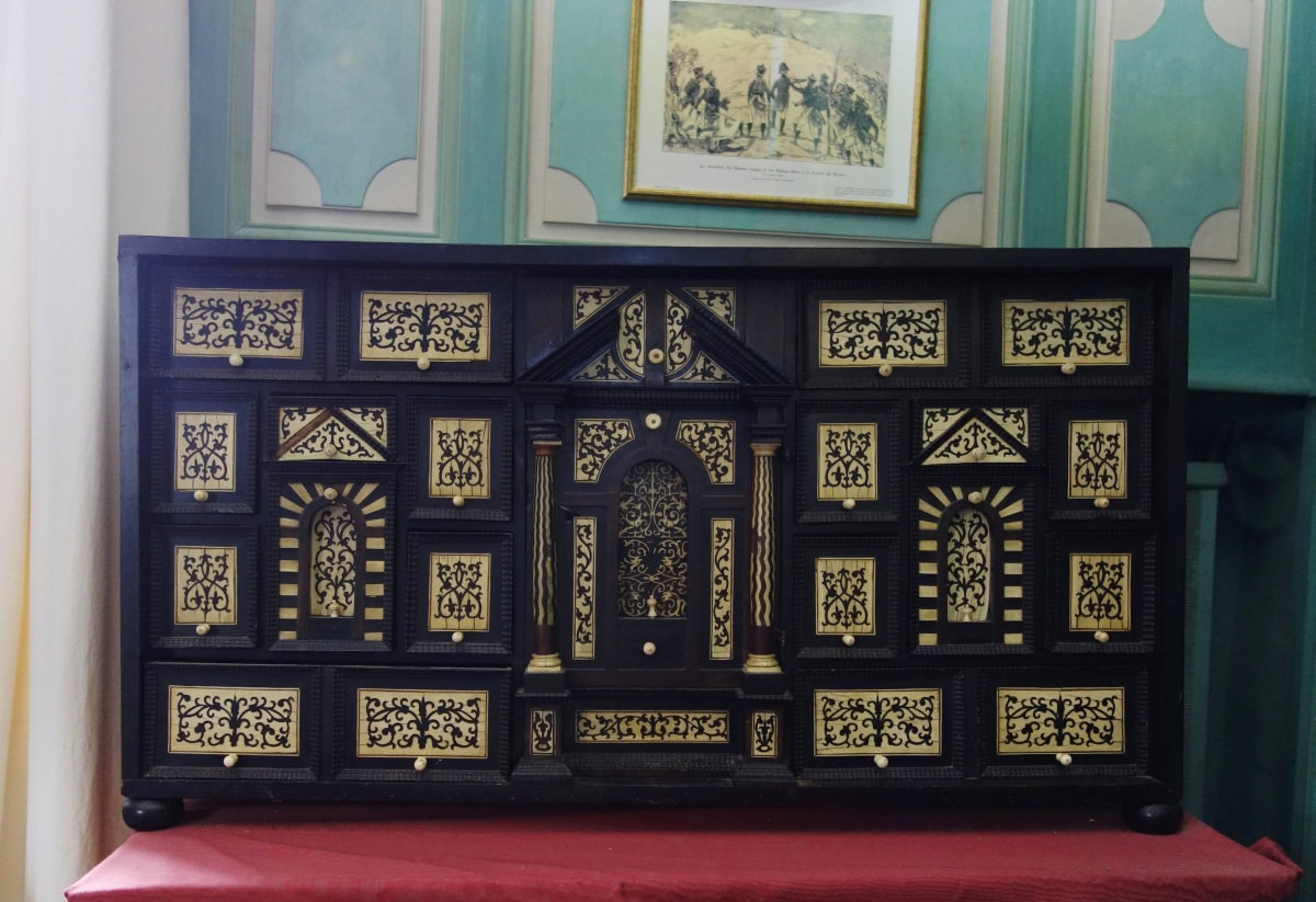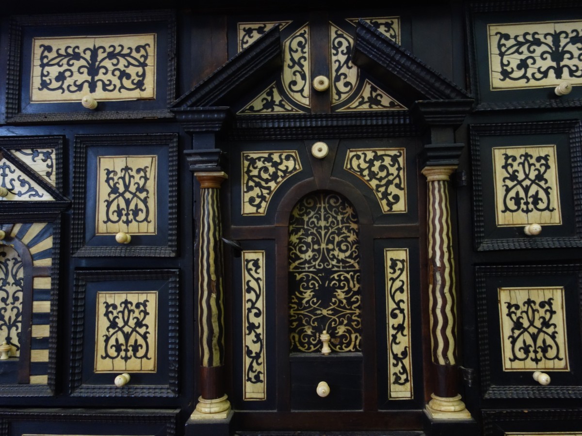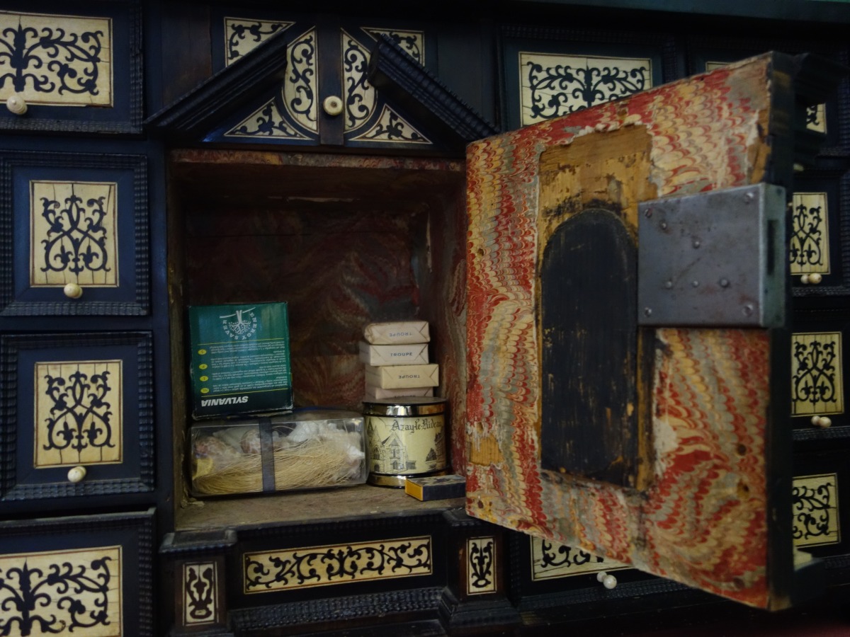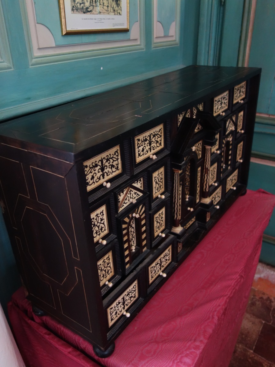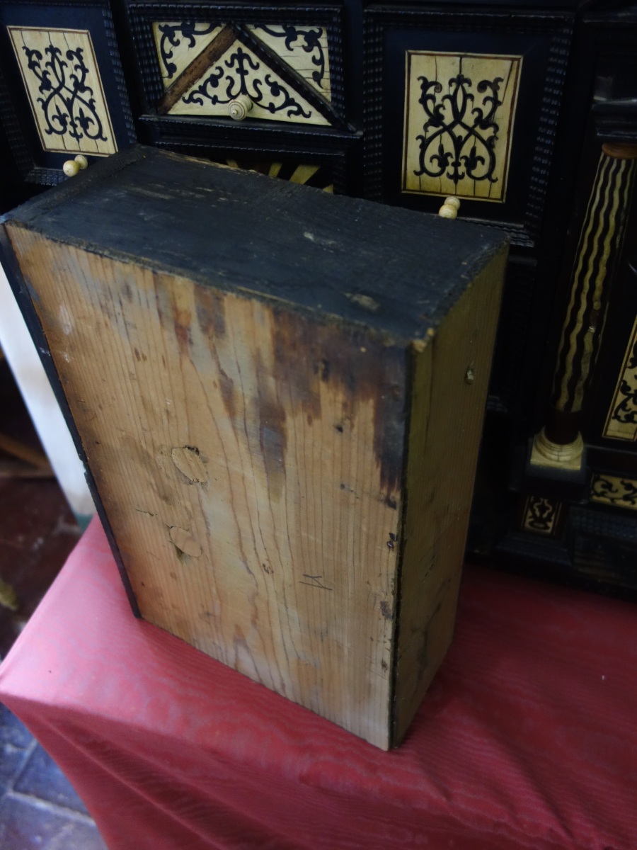 GRAND CABINET à poser en ébène et bois noirci à décor de motifs géométriques en ivoire. Il ouvre à 19 tiroirs encadrant un vantail à colonnes soutenant un fronton, découvrant une niche en théâtre.