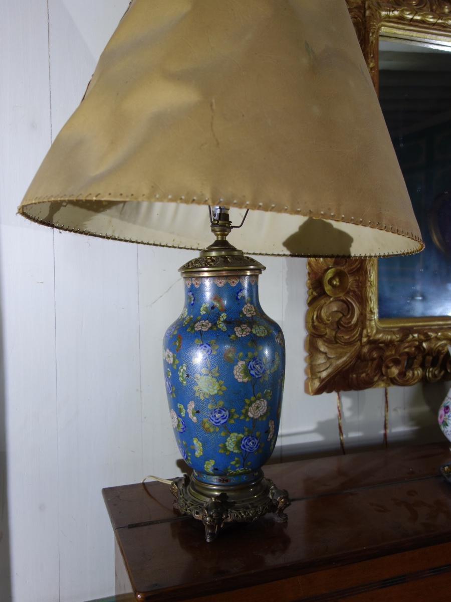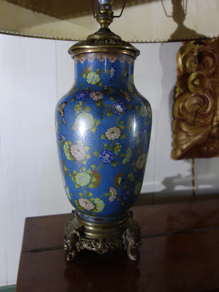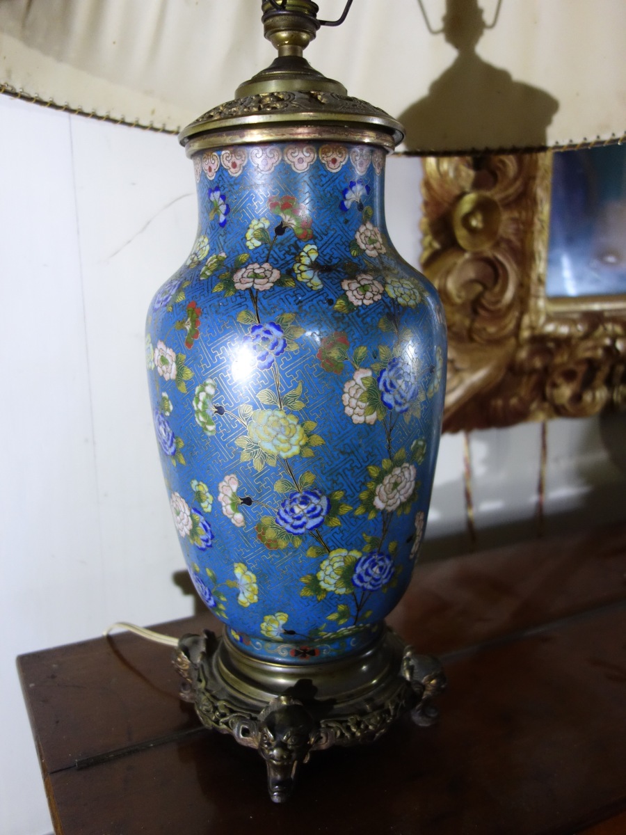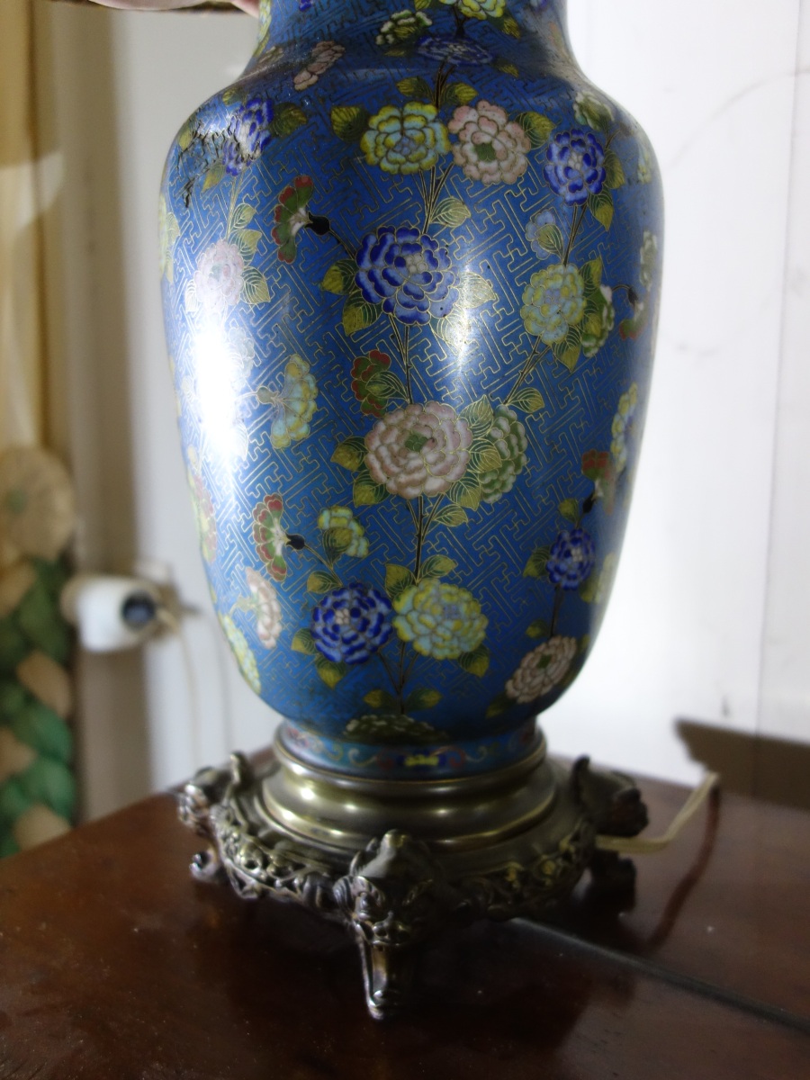 CHINE, XIXe. VASE en émaux cloisonnés. Monture de bronze doré à quatre pieds en tête de chimère. Electrifié.