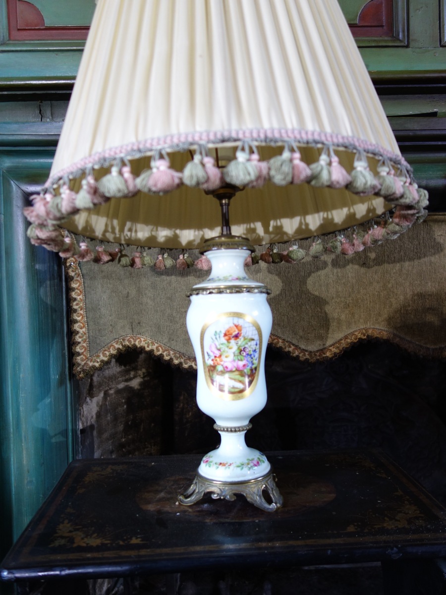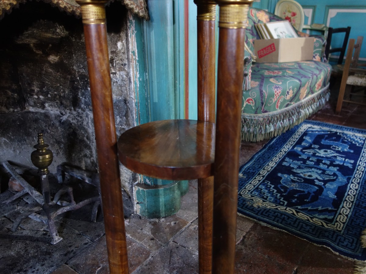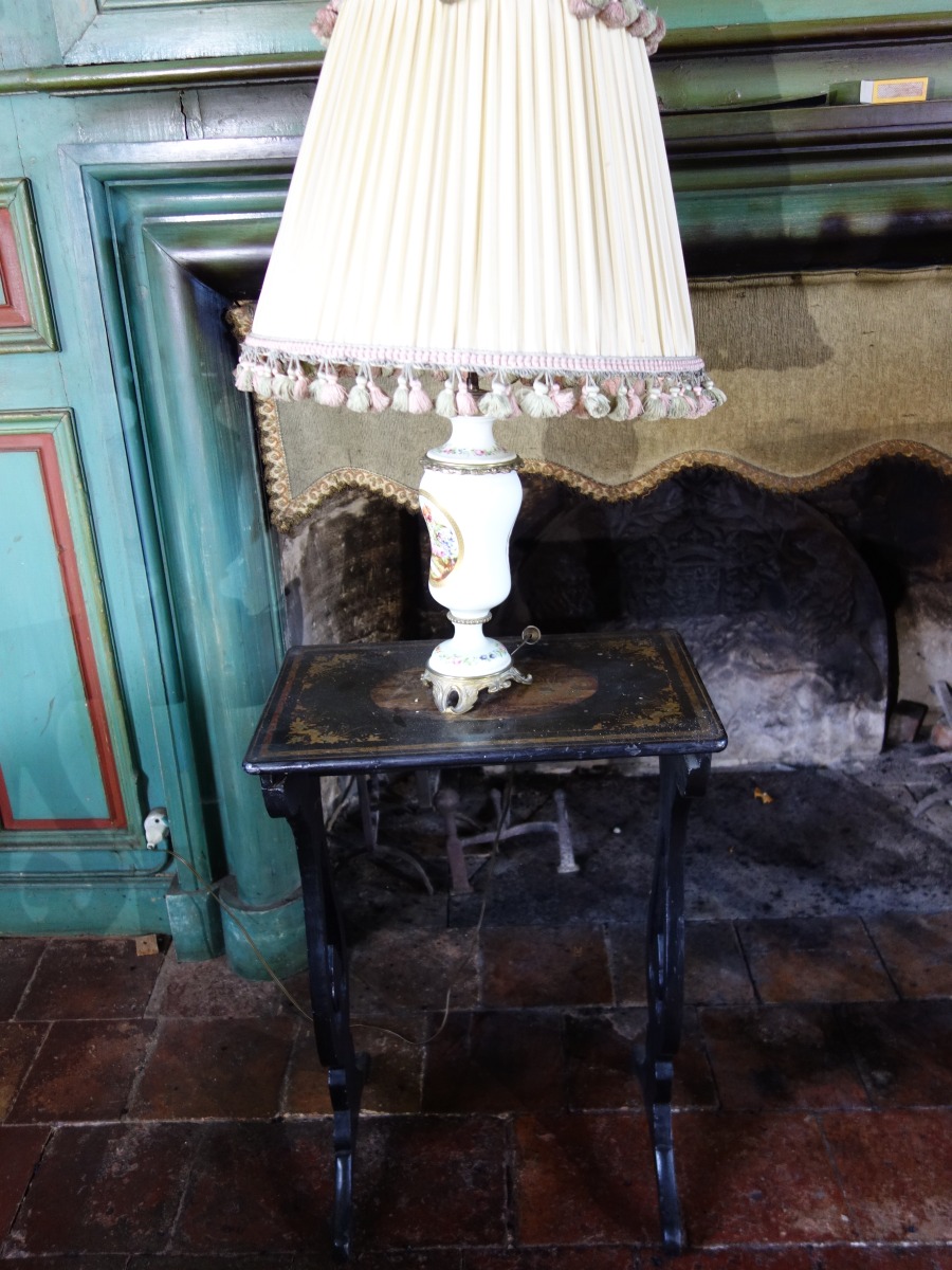 LOT comprenant : une BARBIÈRE en acajou et placage d'acajou. Epoque Empire (manque le bassin), lots de BIBELOTS et SOUVENIRS, une TABLE en AUGE sur un piètement lyre et une TABLE PORTEFEUIL en acajou XIXe siècle, divers LUMINAIRES, un BAROMETRE moderne et petits meubles.