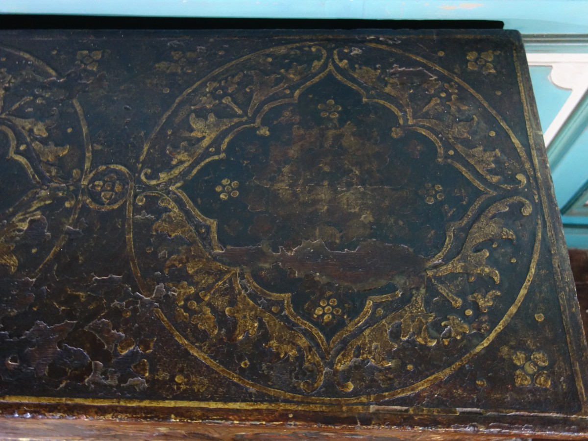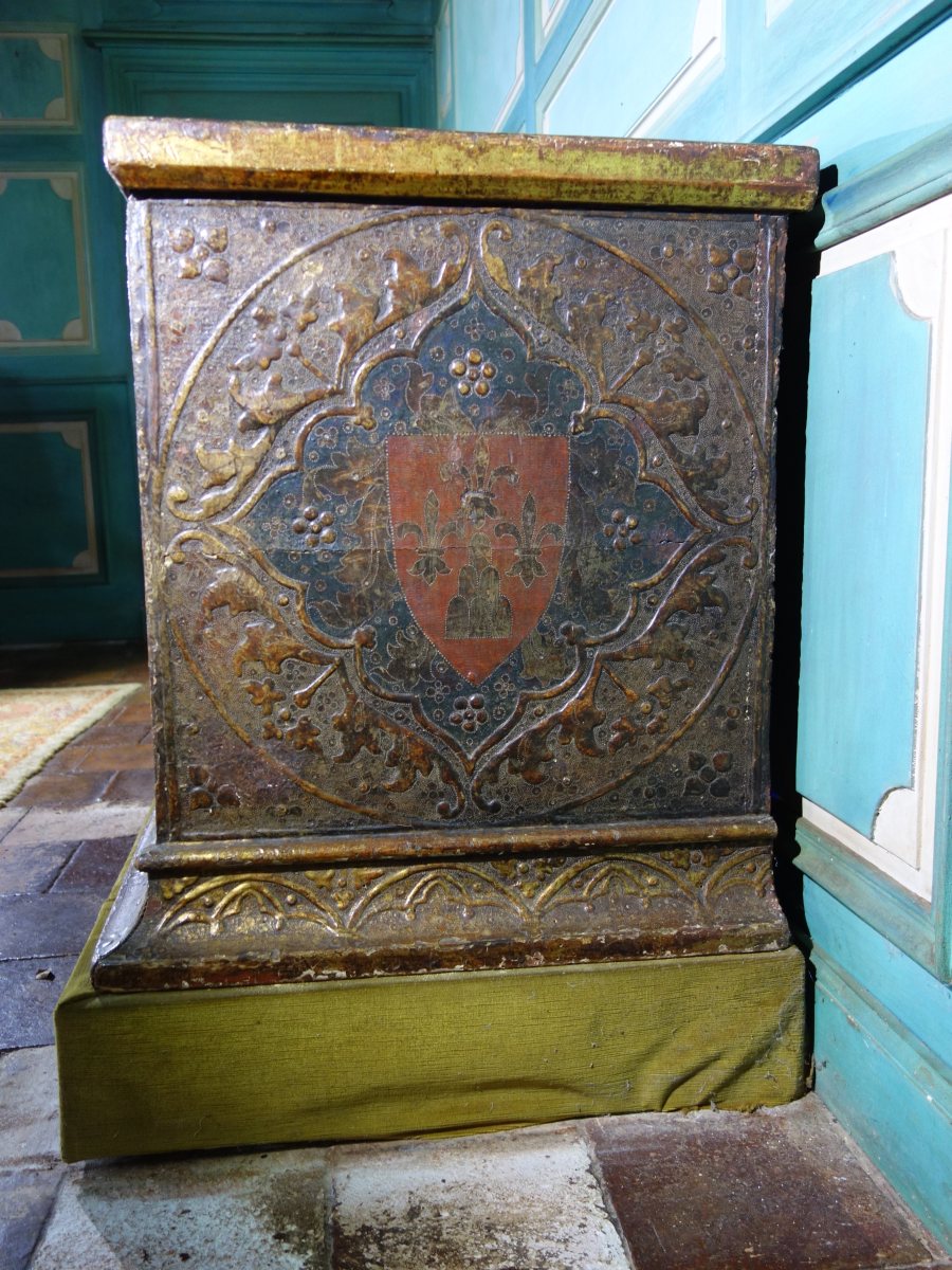 COFFRE en bois à décor polychrome et or, à décor sur quatre faces, représentant en façade trois scènes de chevalier, encadrées d'armoiries.