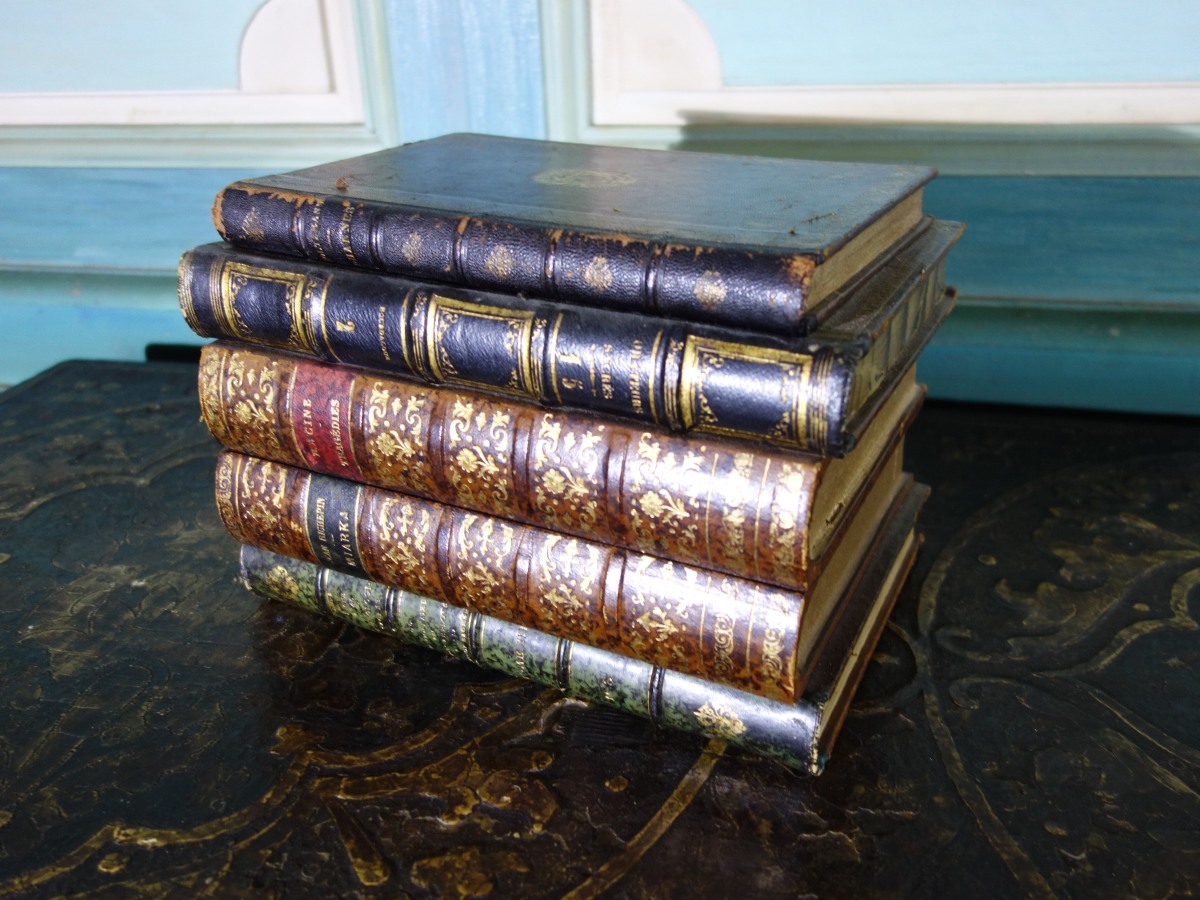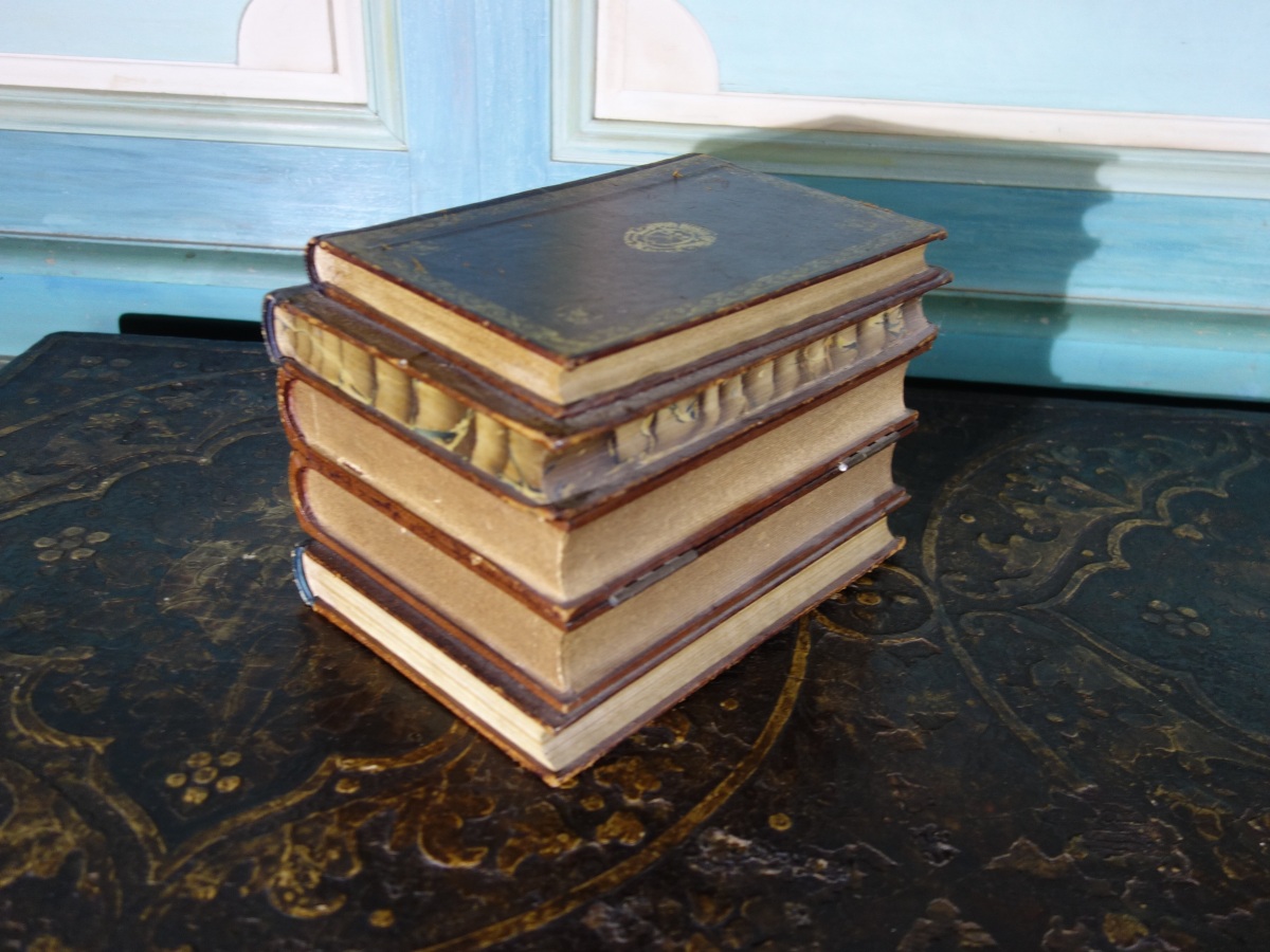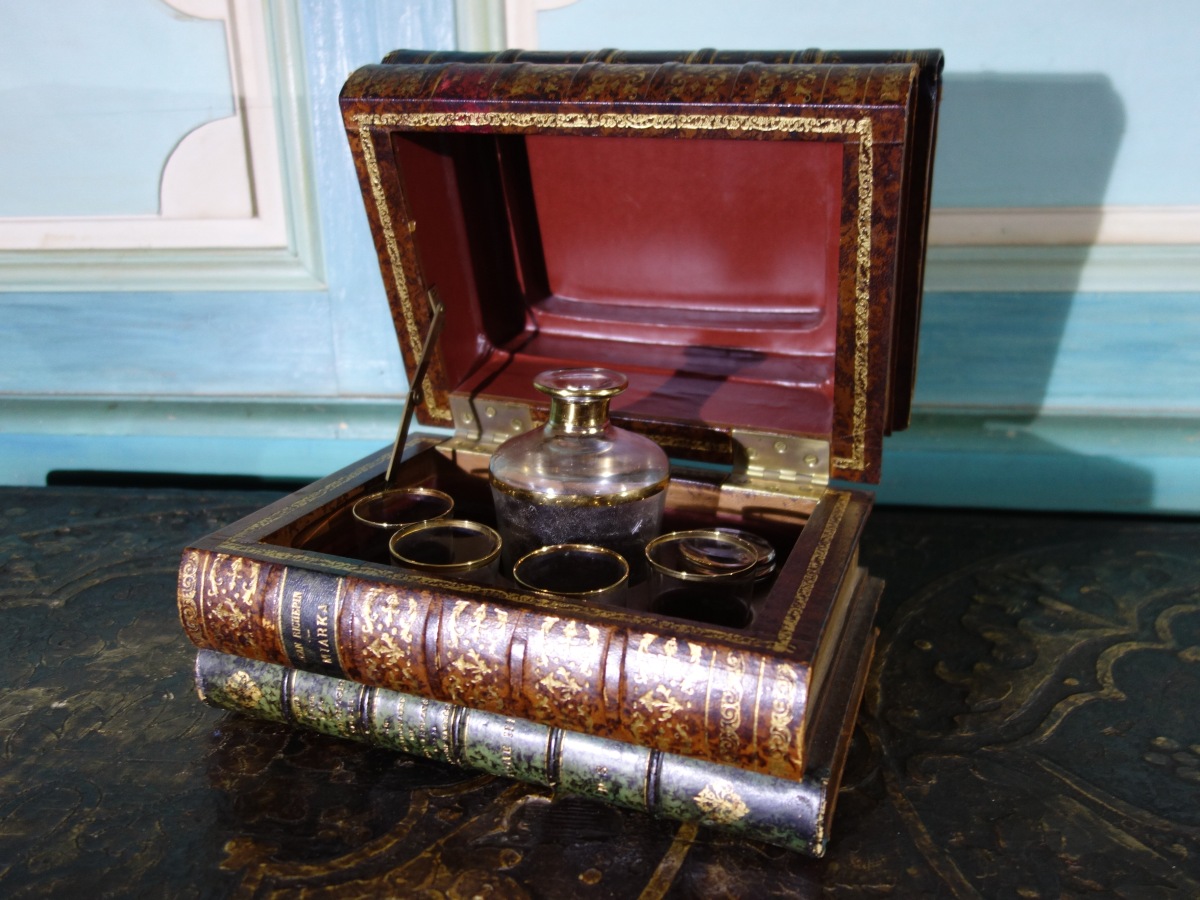 CAVE à LIQUEUR sécrète cachée dans une pile de six livres reliés.