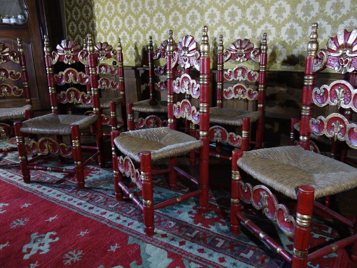 SUITE de Huit CHAISES en bois polychrome rouge et or.