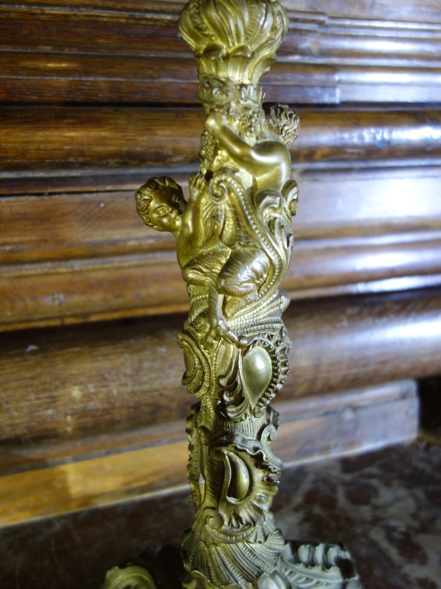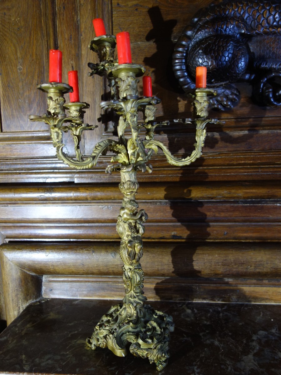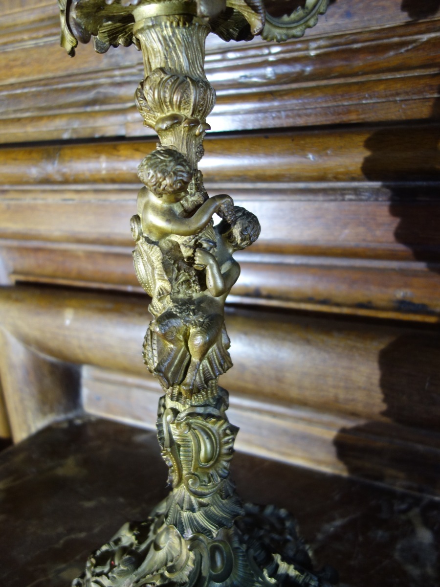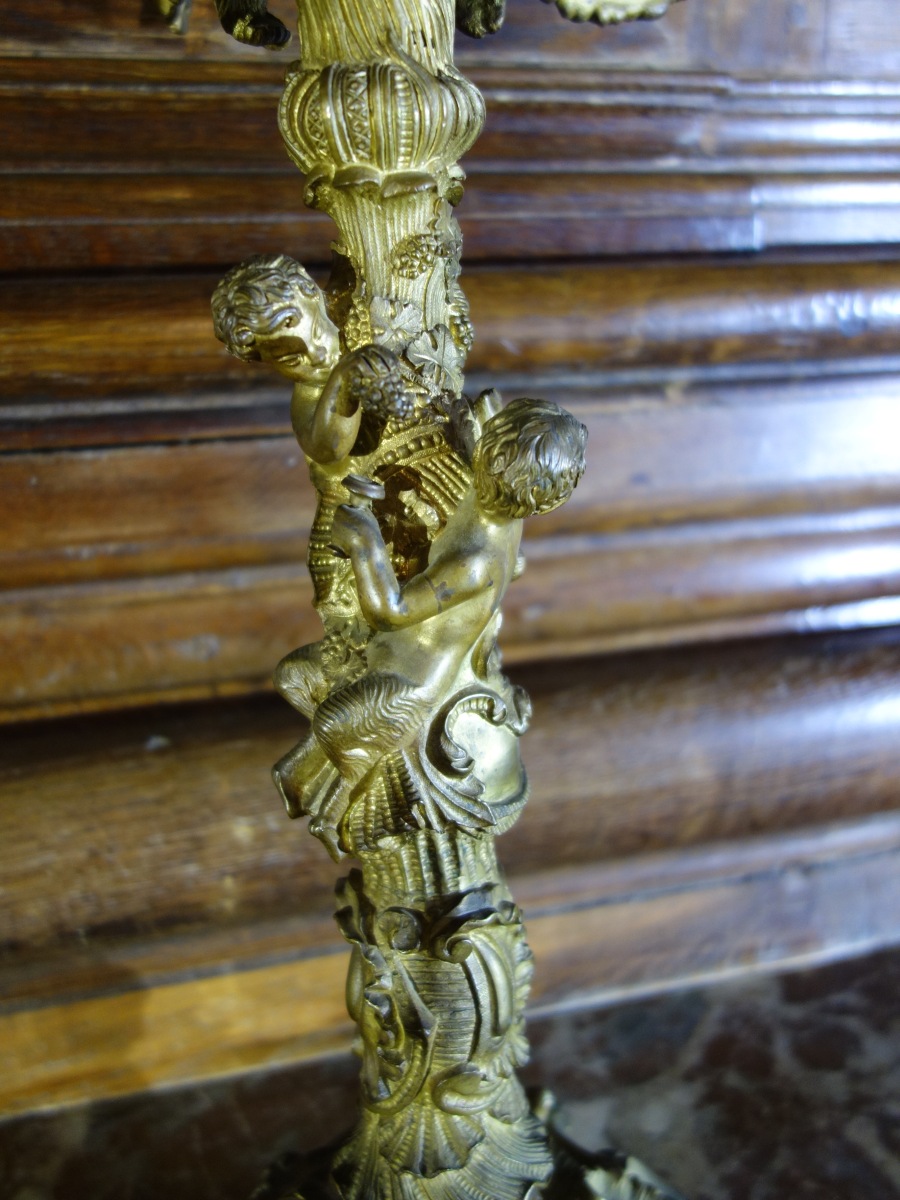 Grande paire de CANDÉLABRES en bronze à six bras de lumières, les futs en haut relief sont composés de puttis vendangeurs.