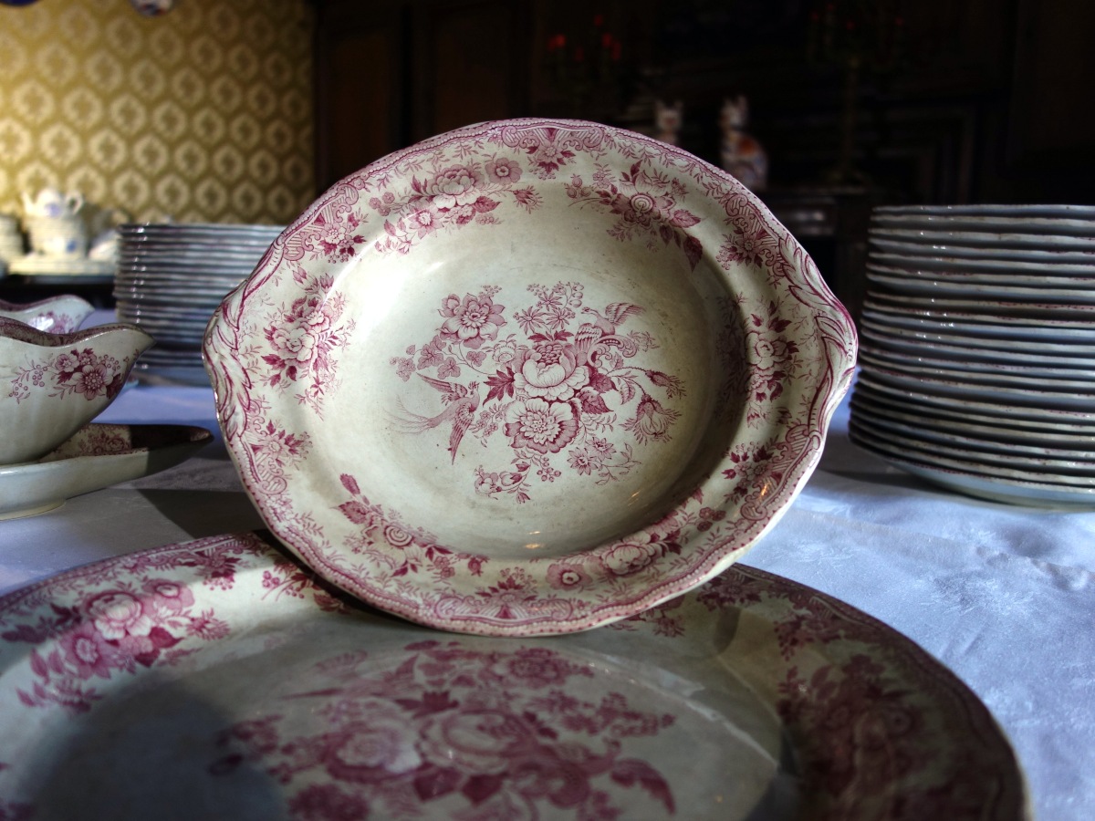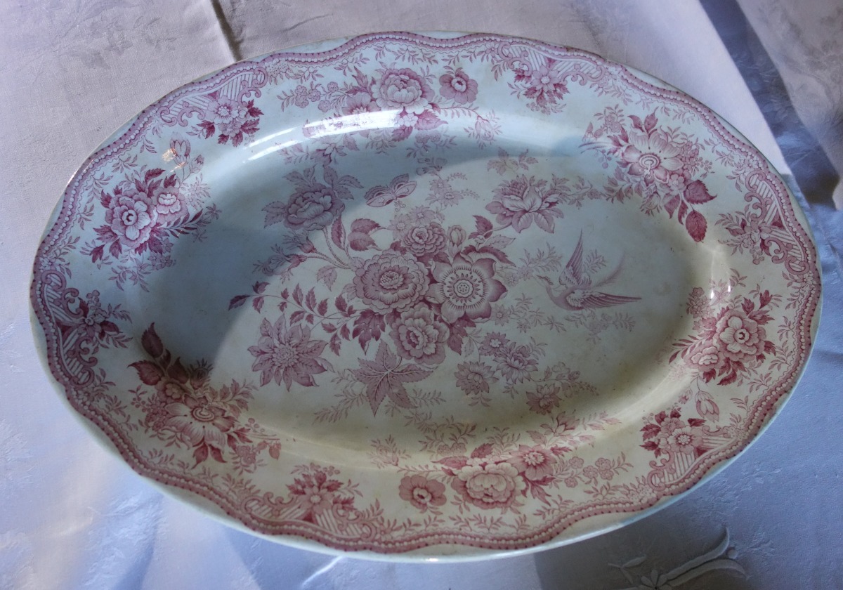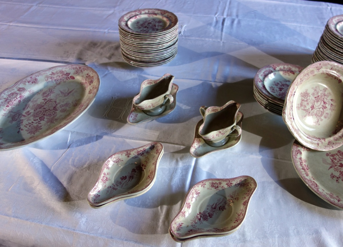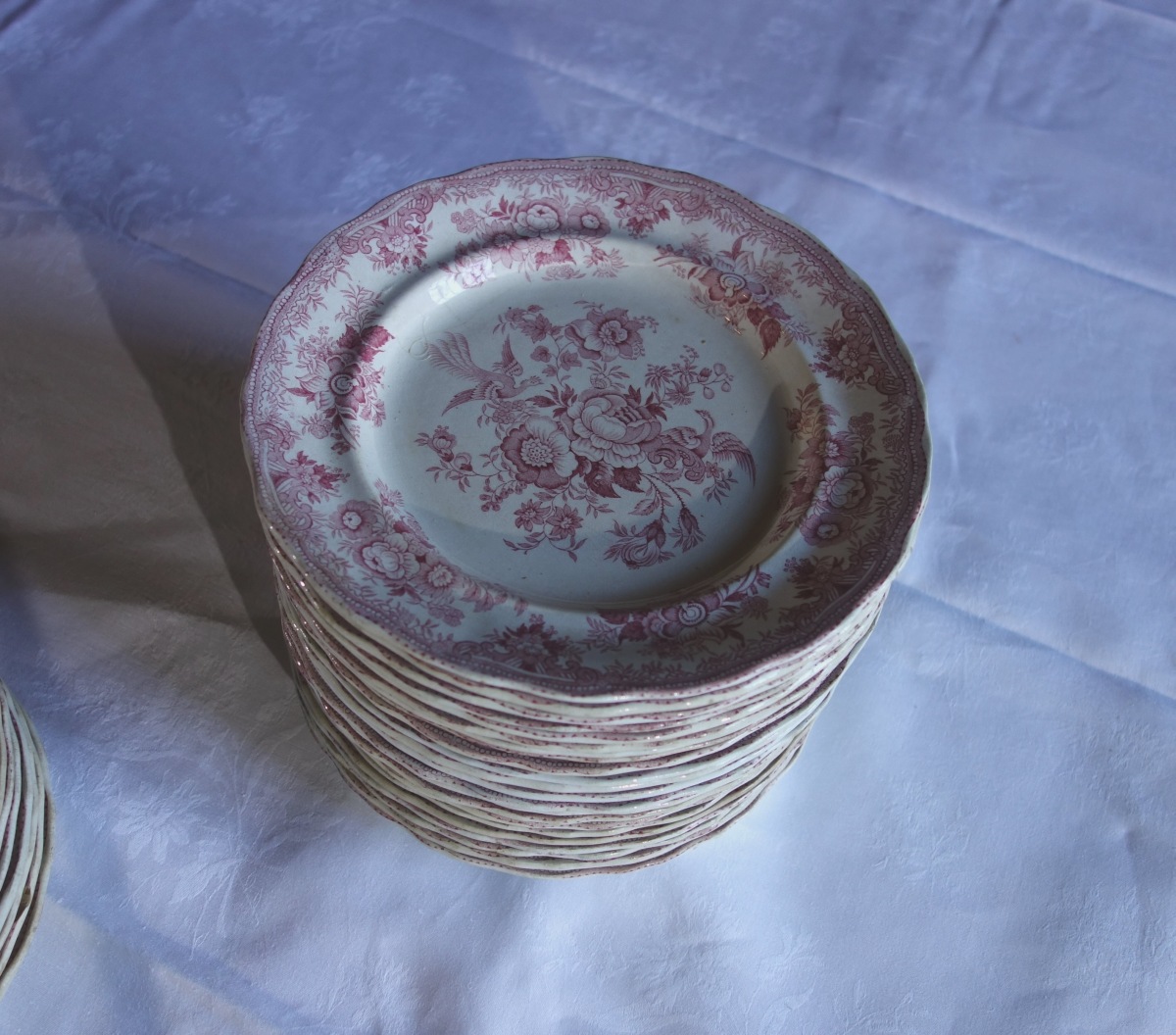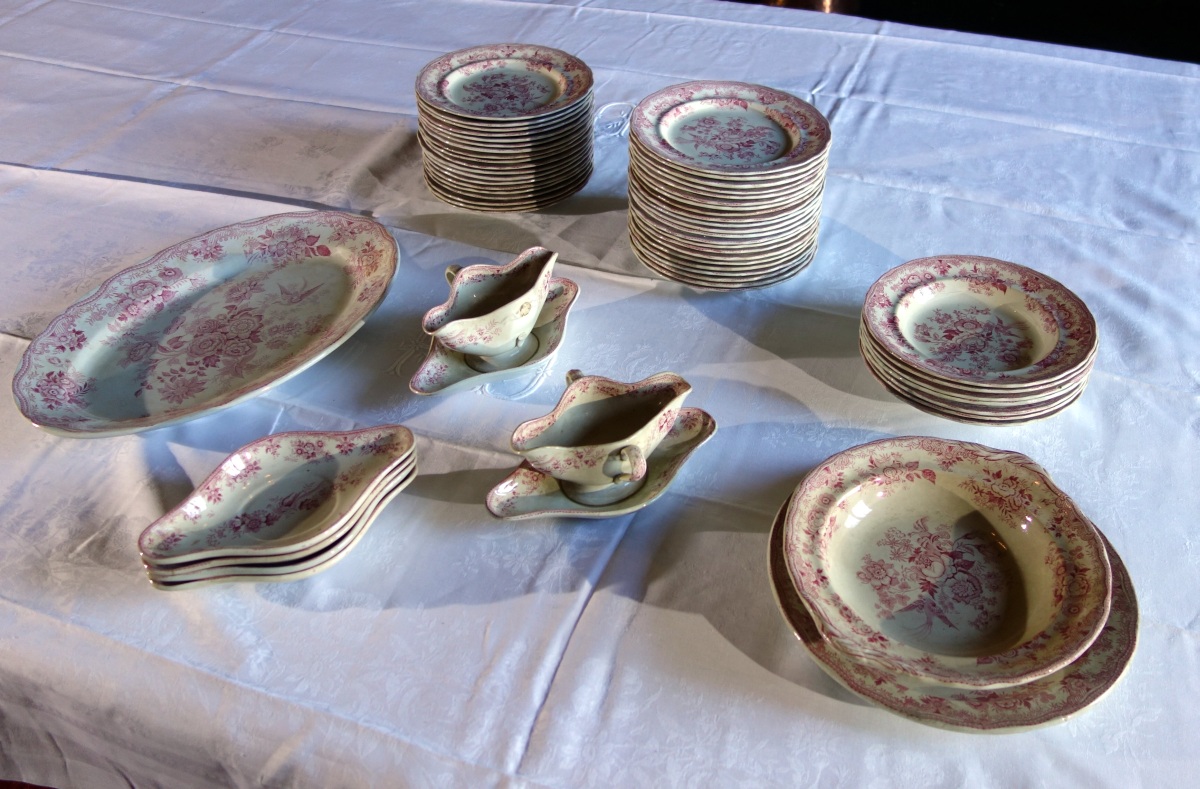J.F. WILHMAN. SERVICE « asiatic » en faïence anglaise émaillée rose et blanche, au décors fleuri avec des oiseaux, d’environ 56 pièces, notamment :