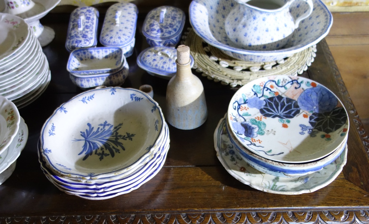 Réunion de VAISSELLE en céramique, notamment : service à dessert en porcelaine peinte de bouquets de fleurs avec assiettes et coupes sur talon, service de nuit en faïence bleue et blanche, cinq assiettes fleurdelisées..