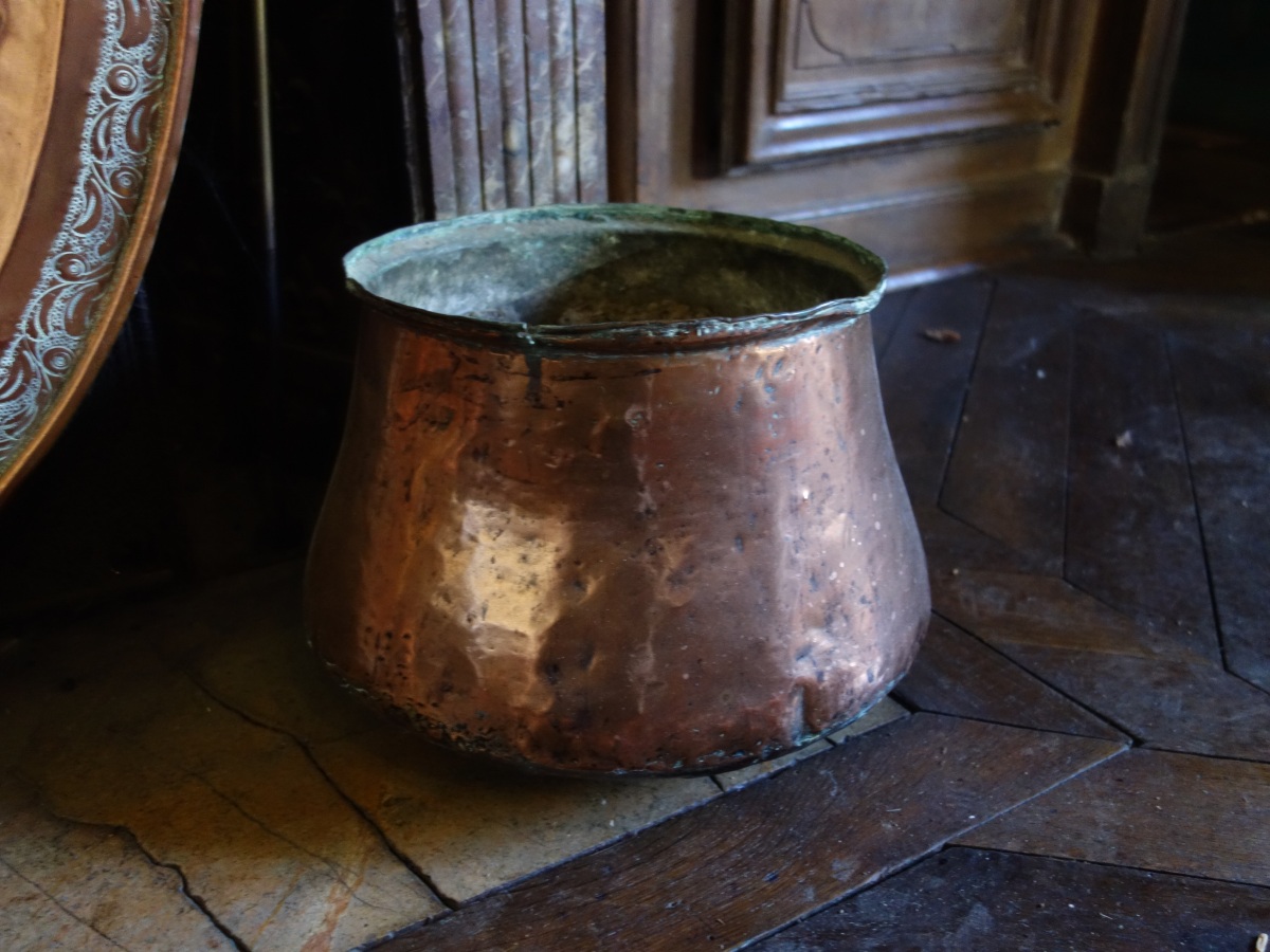 GRAND PLATEAU. NORD AFRICAIN en cuivre à décor gravé de motifs floraux (Diam. 95 cm) et deux MARMITES en cuivre.