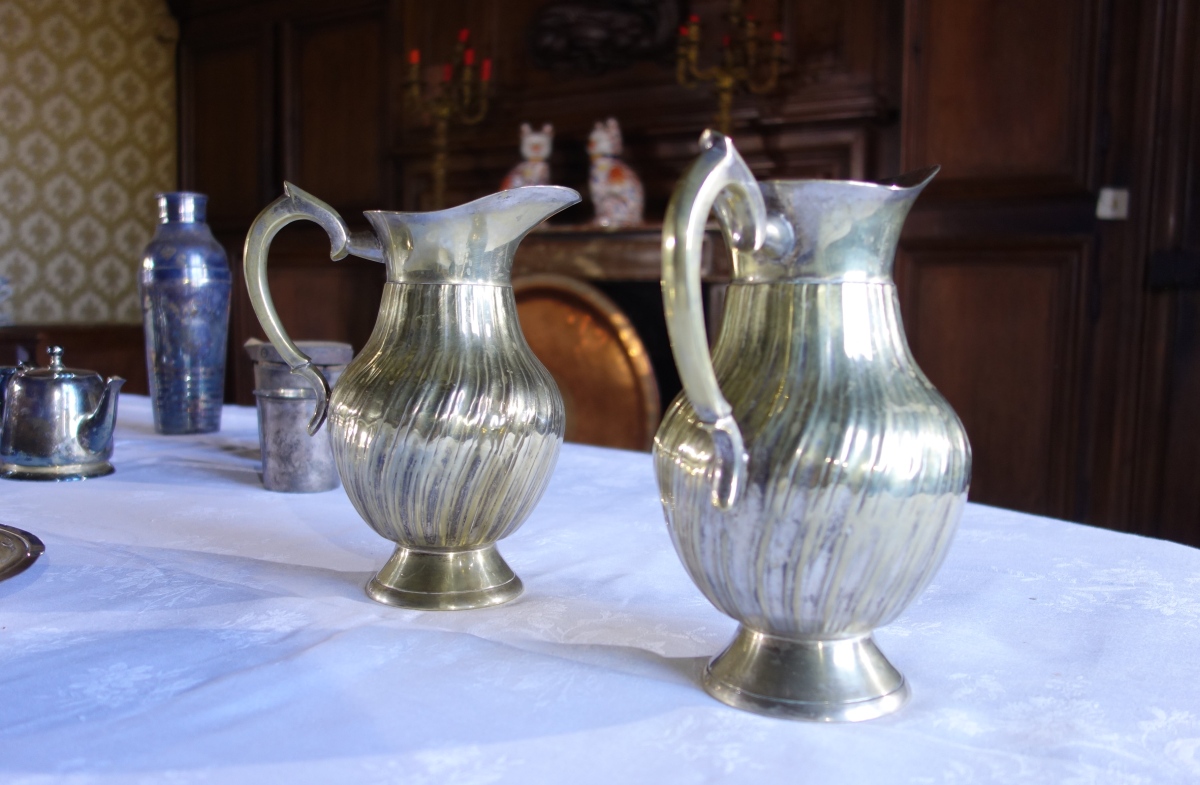 10 pièces de SERVICE en métal argenté, comprenant : 1 plateau, 1 plat ovale, 2 pichets, 3 verseuses dont 1 égoïste, 1 shaker et 2 timbales.
