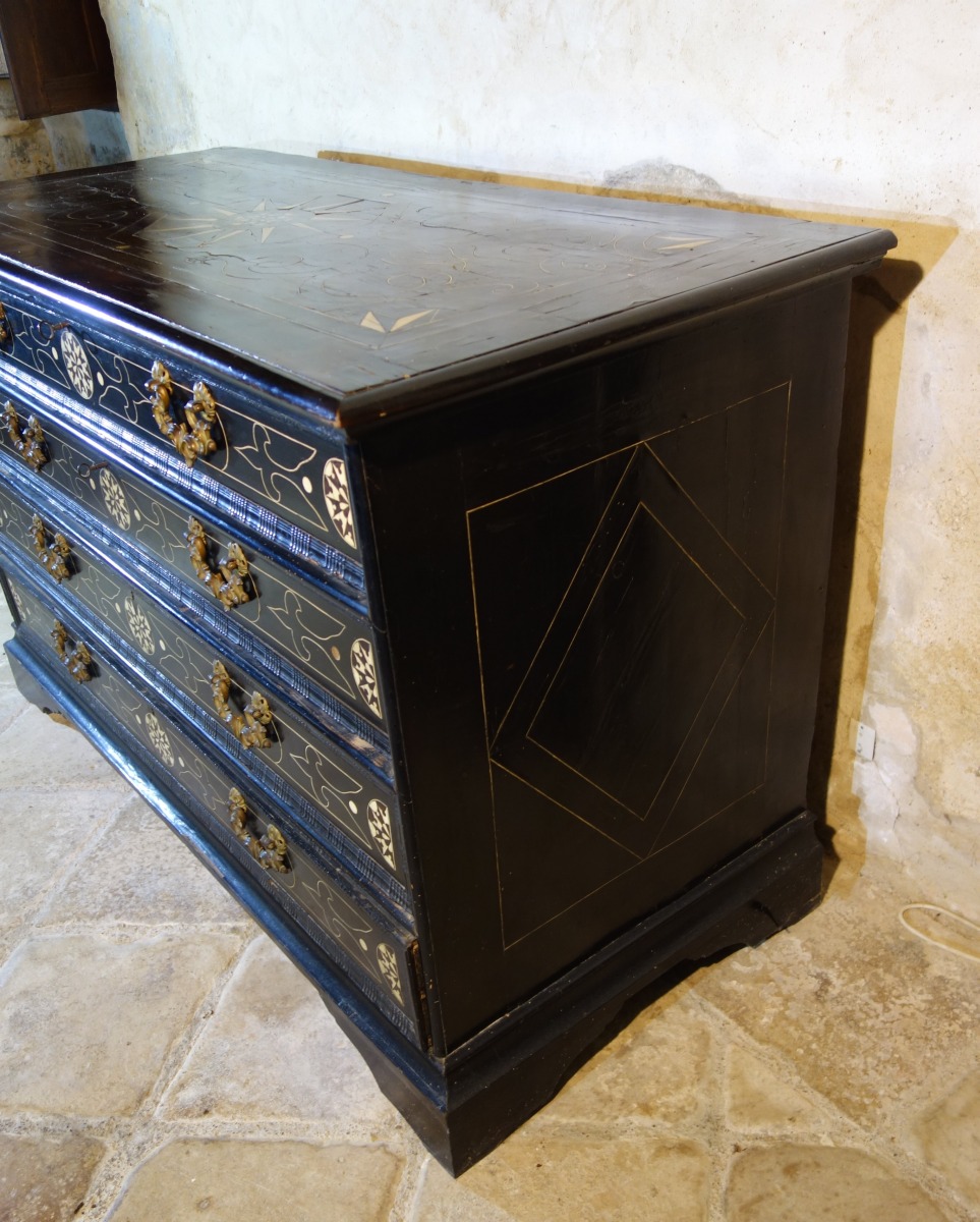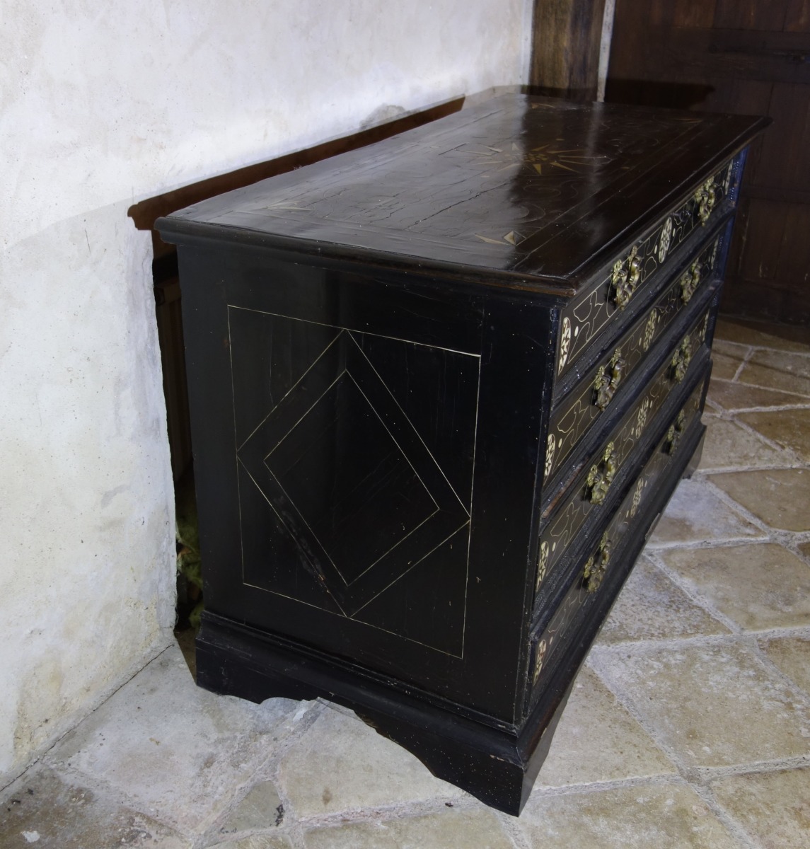 COMMODE en bois noirci incrusté d'ivoire, ouvrant par quatre tiroirs. Le dessus présente un décor central formé par une rose des vents encadrée de réserves, soulignées de filets formant l'encadrement, les tiroirs sont centrés de rosaces encadrées de fleurs de lys stylisées. Ornementation de poignées tombantes en bronze.