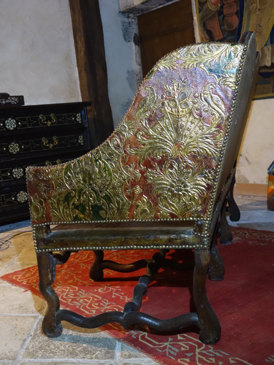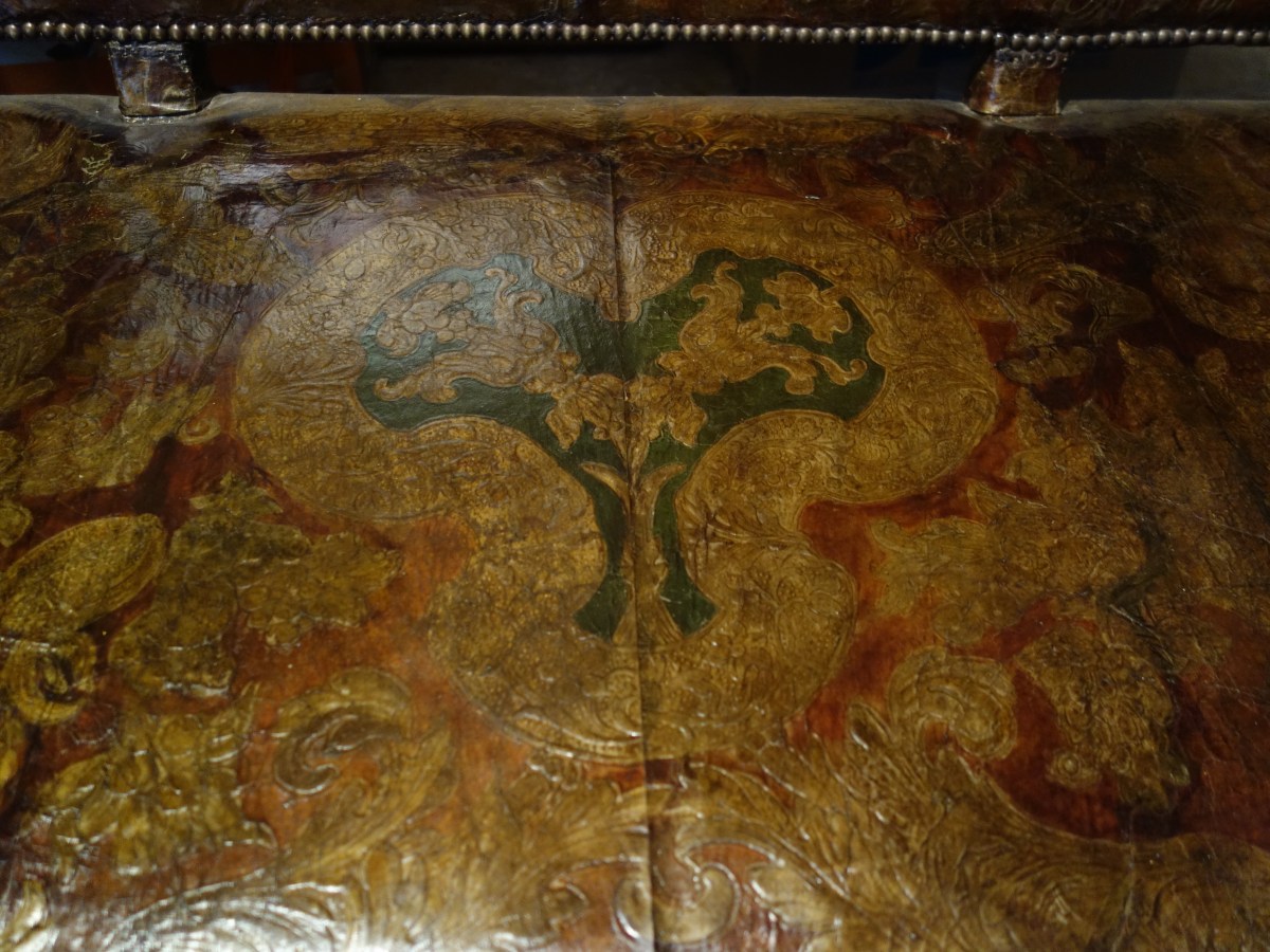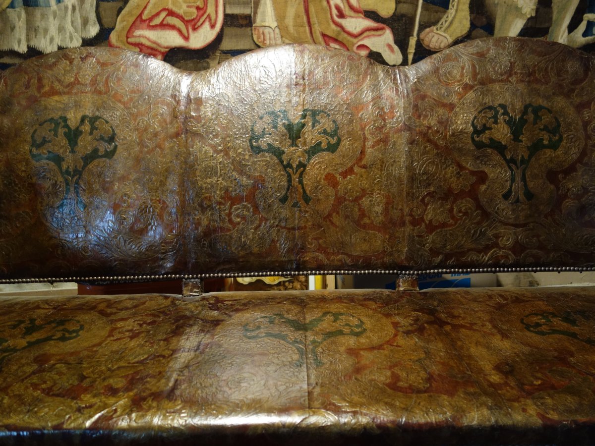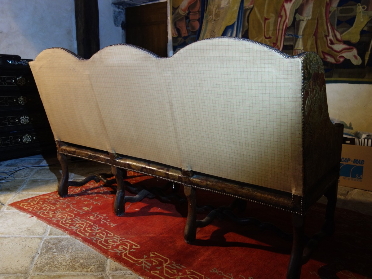 CANAPÉ trois places en confessionnal garni de cuir de Cordoue....