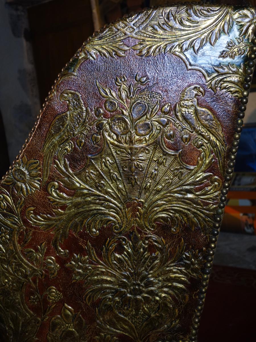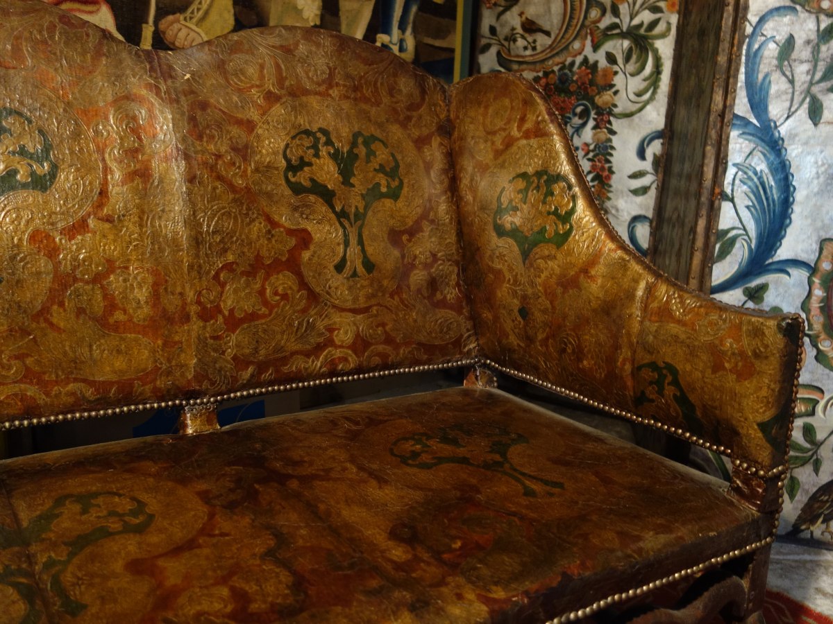 CANAPÉ trois places en confessionnal garni de cuir de Cordoue. Le piètement ""os de mouton"" repose sur huit pieds réunis par une entretoise en ""H"". Décor polychrome de motifs rayonnants et d'oiseaux perchés sur des palmettes.