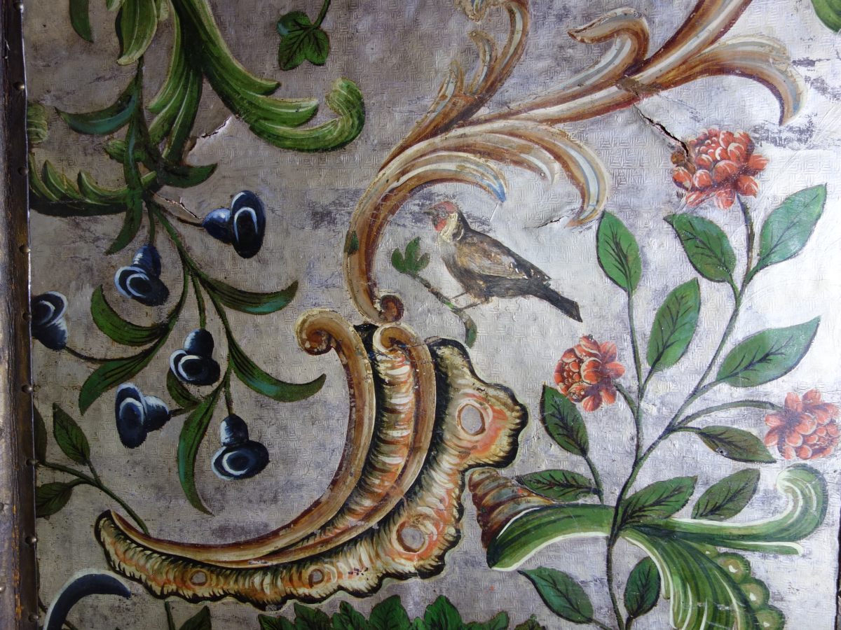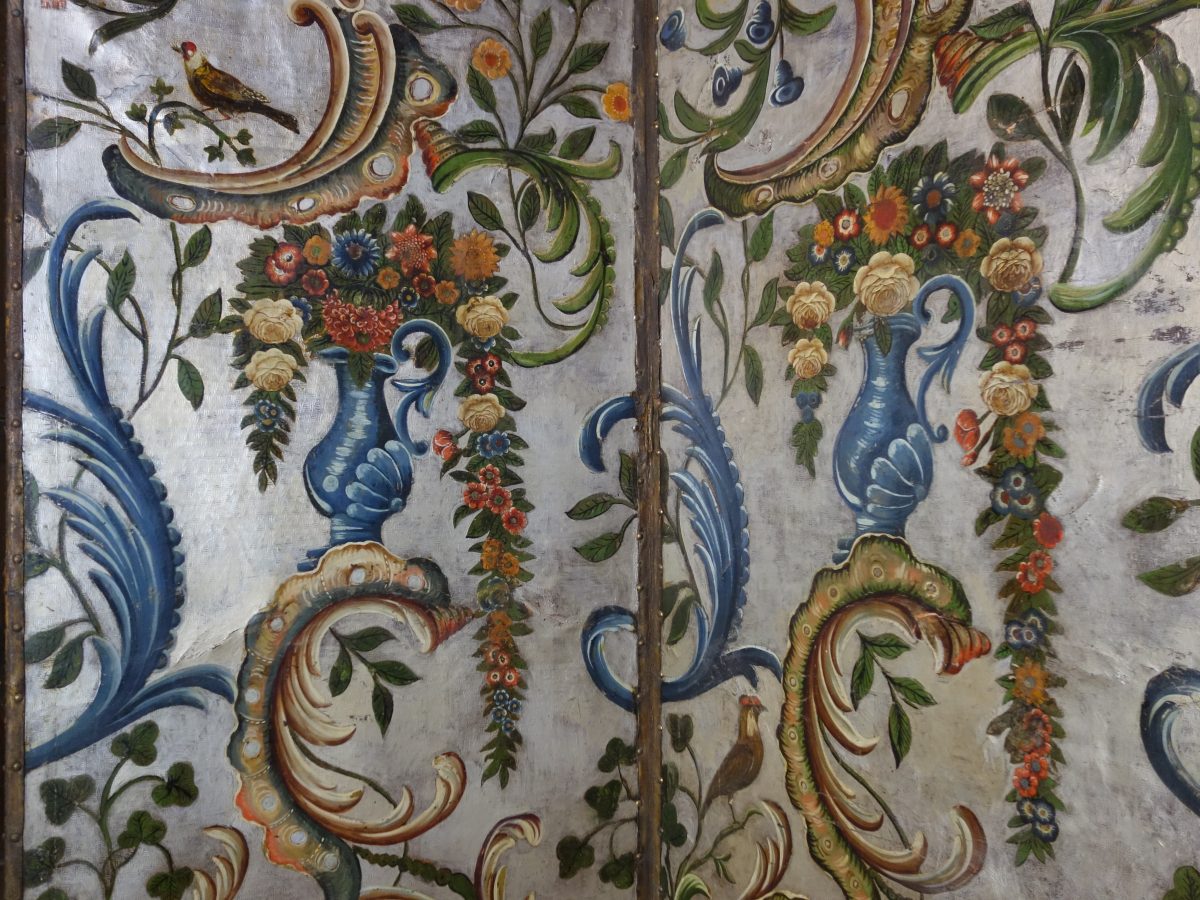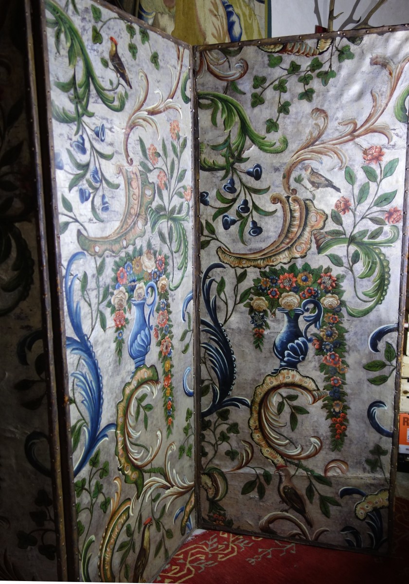PARAVENT à quatre feuilles en cuir à décor polychrome d'aiguières fleuries, enroulements d'acanthe animés d'oiseaux.