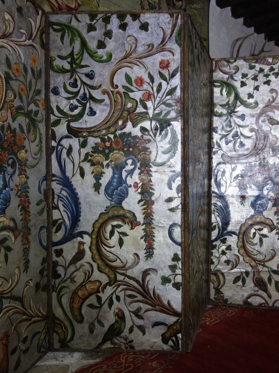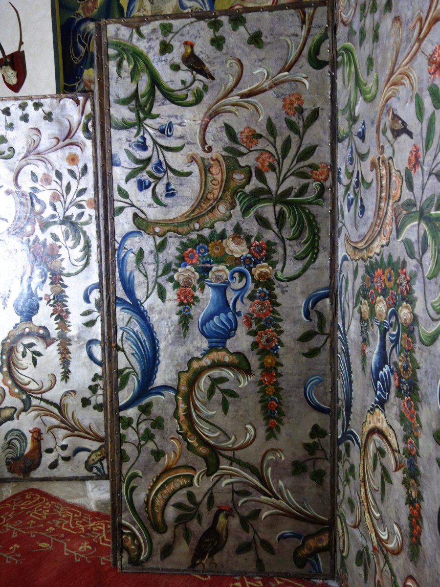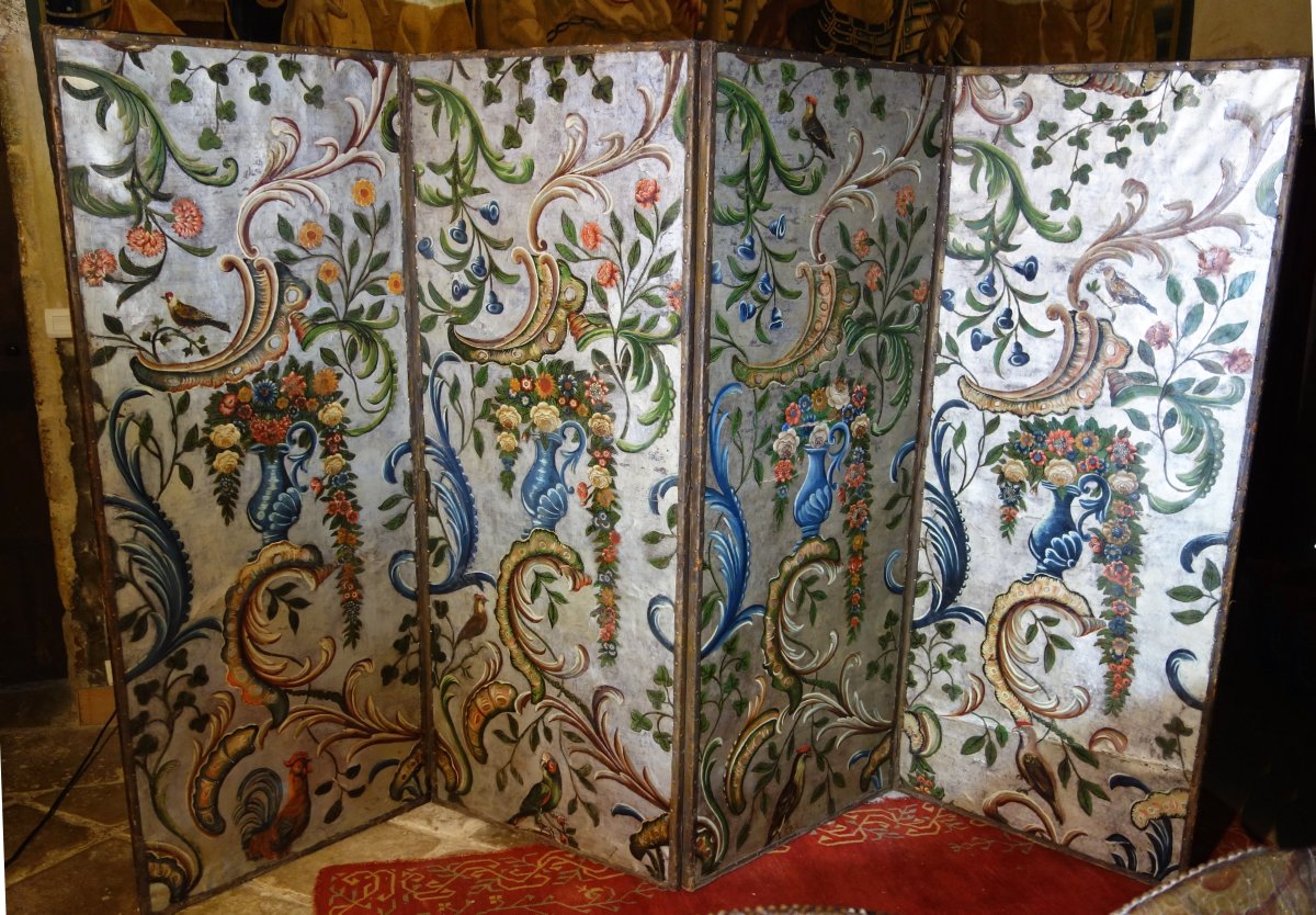 PARAVENT à quatre feuilles en cuir à décor polychrome d'aiguières fleuries, enroulements d'acanthe animés d'oiseaux.