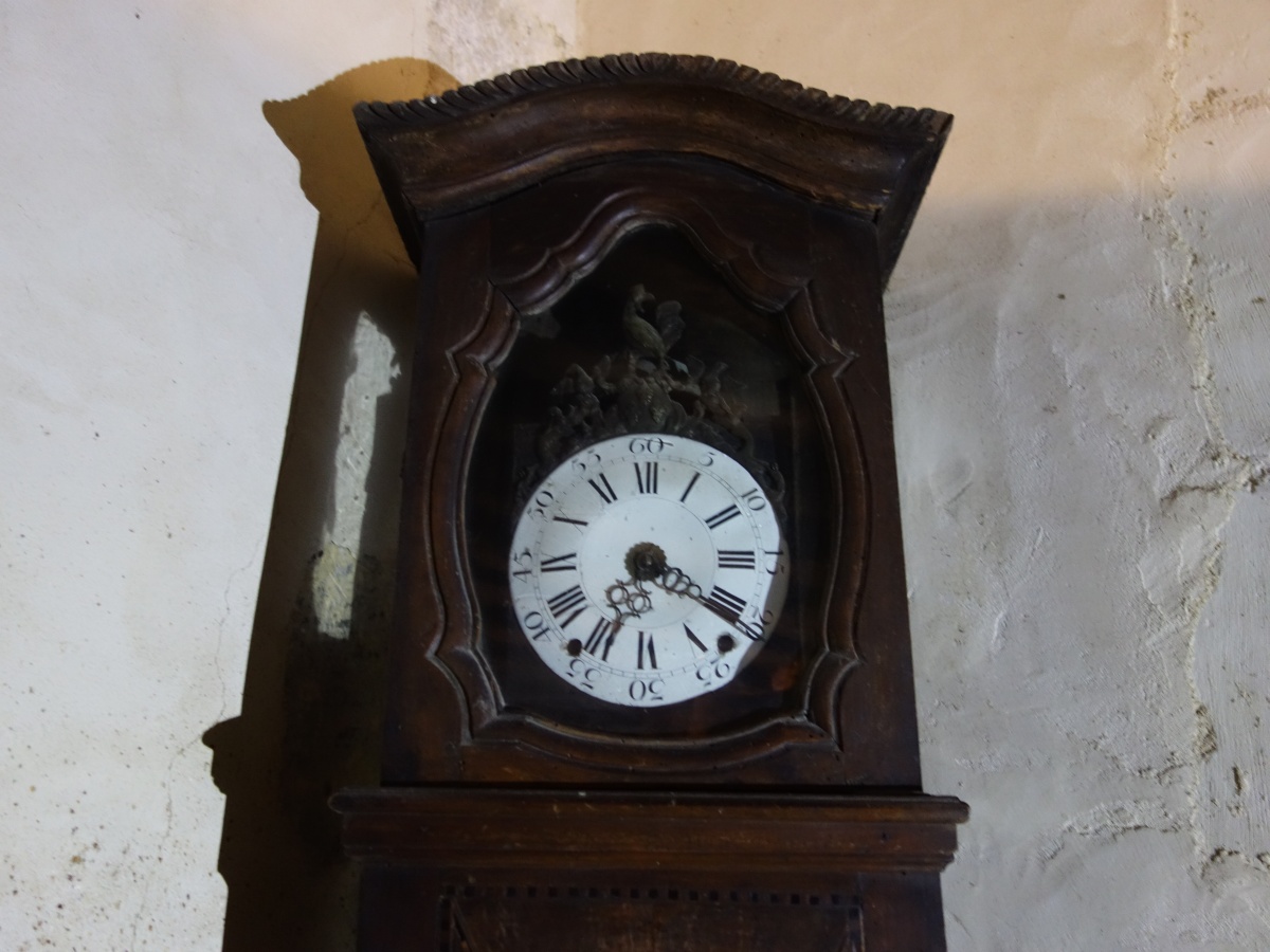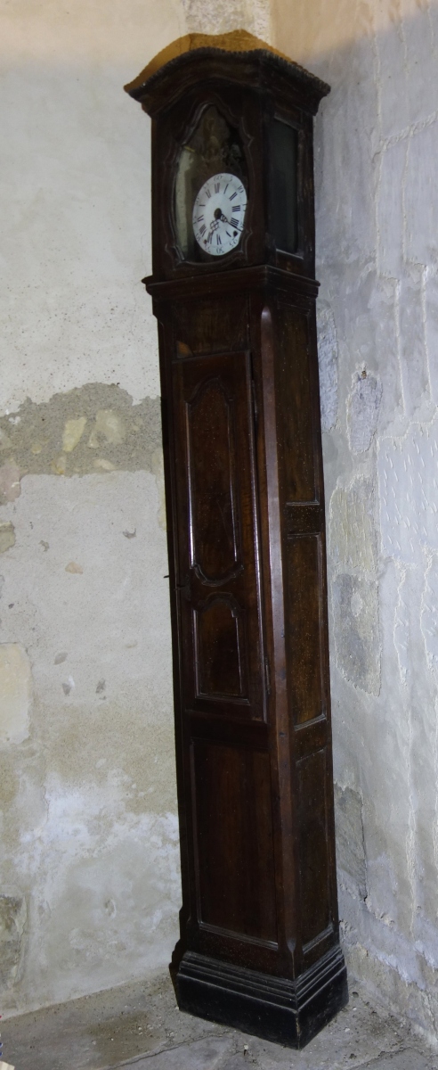 PENDULE COMTOISE en noyer mouluré composée d'une tête de poupée vitrée à cadrant d'horloge en émail, la partie inférieure ouvre part une porte à panneau. La partie basse est rectangulaire reposant sur une plinthe.