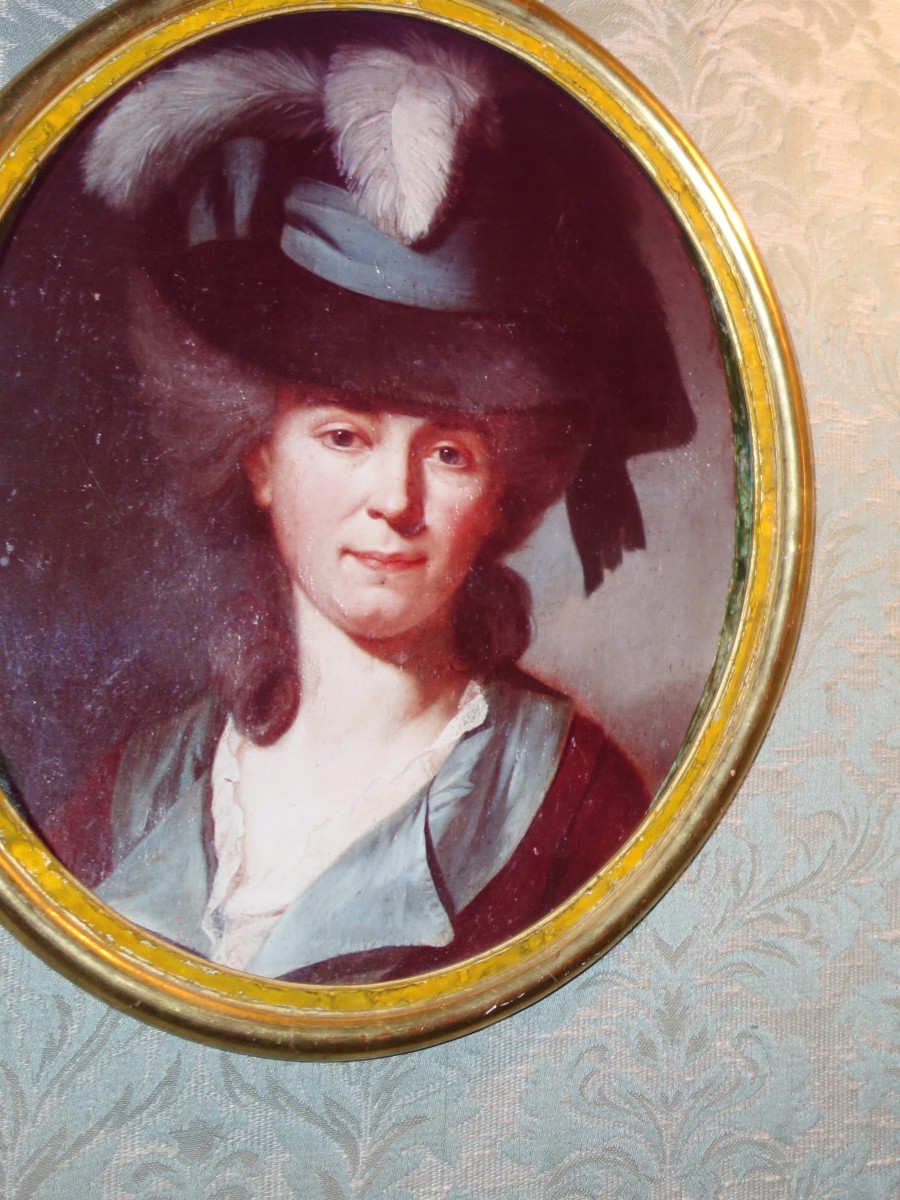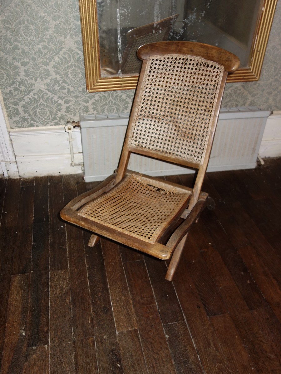 JOINT : Deux CADRES ovales en bois doré ornée de reproductions photographiques (40 x 34 cm) et une CHAISE BASSE CANNEE