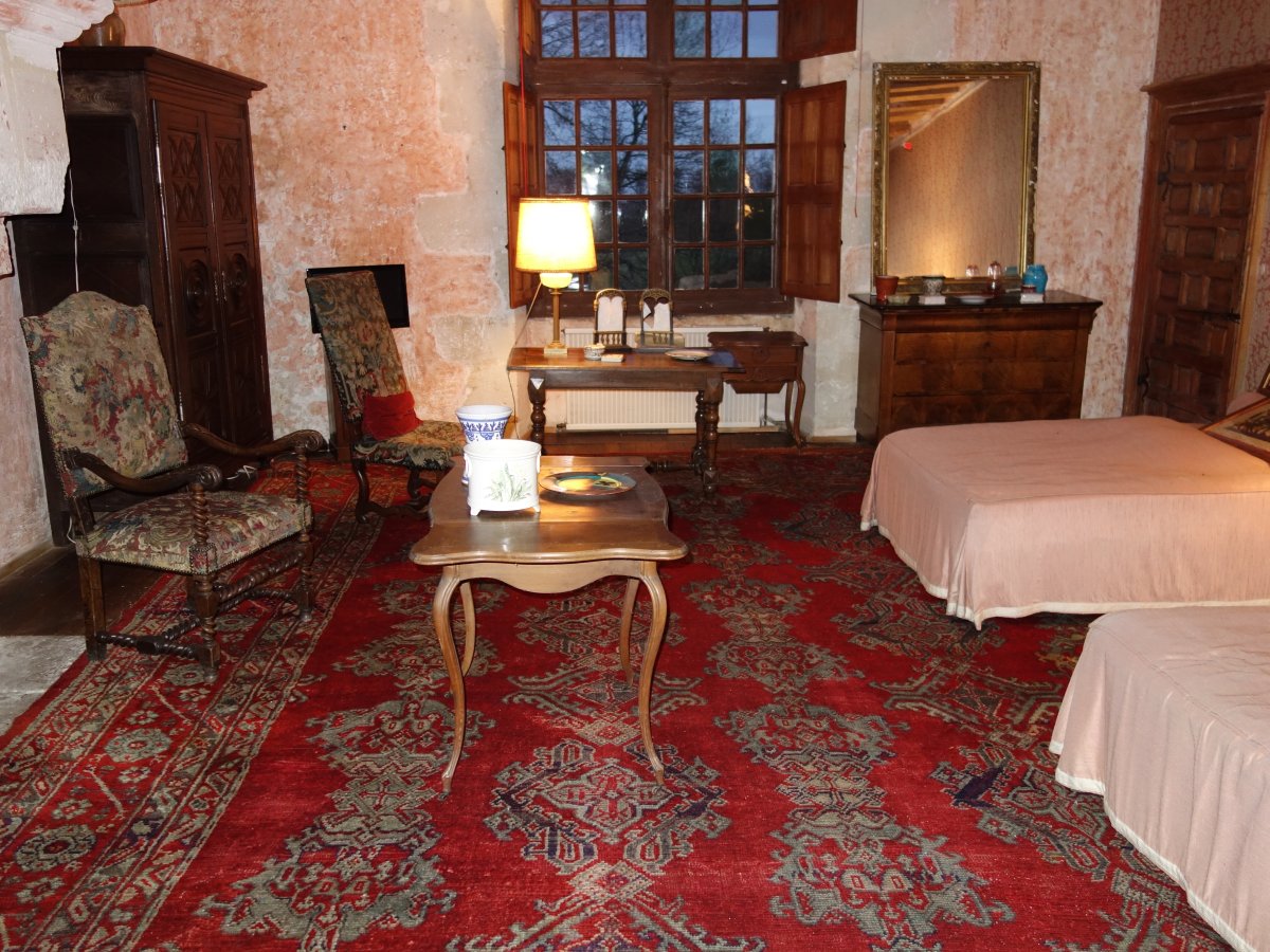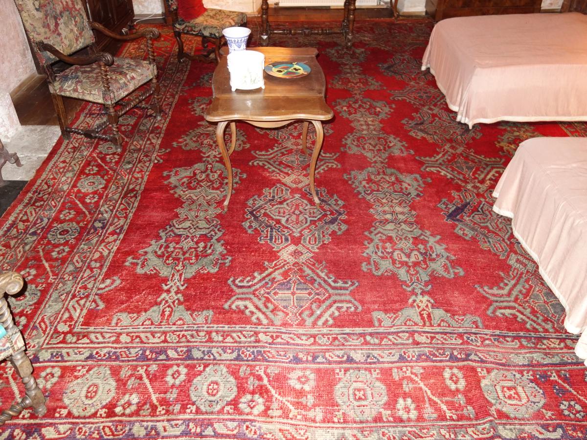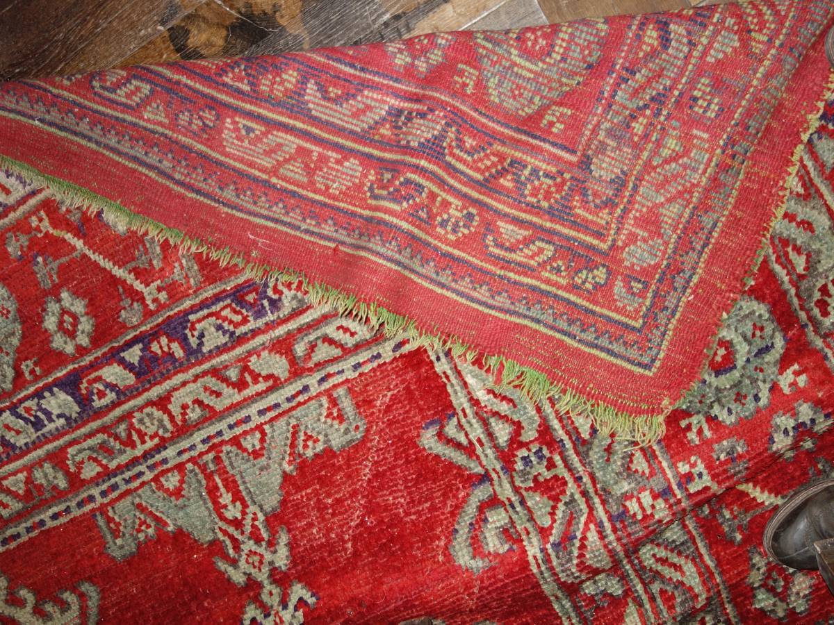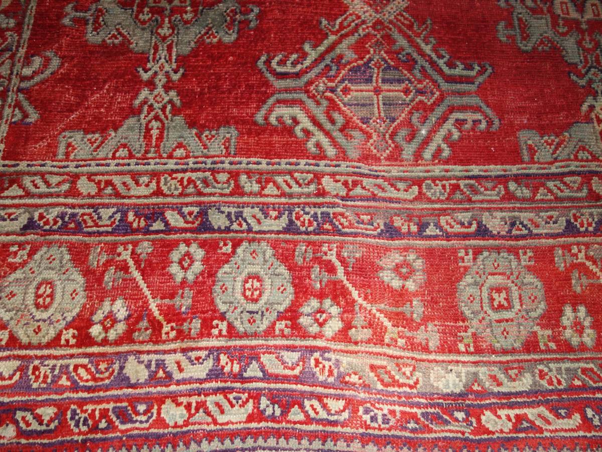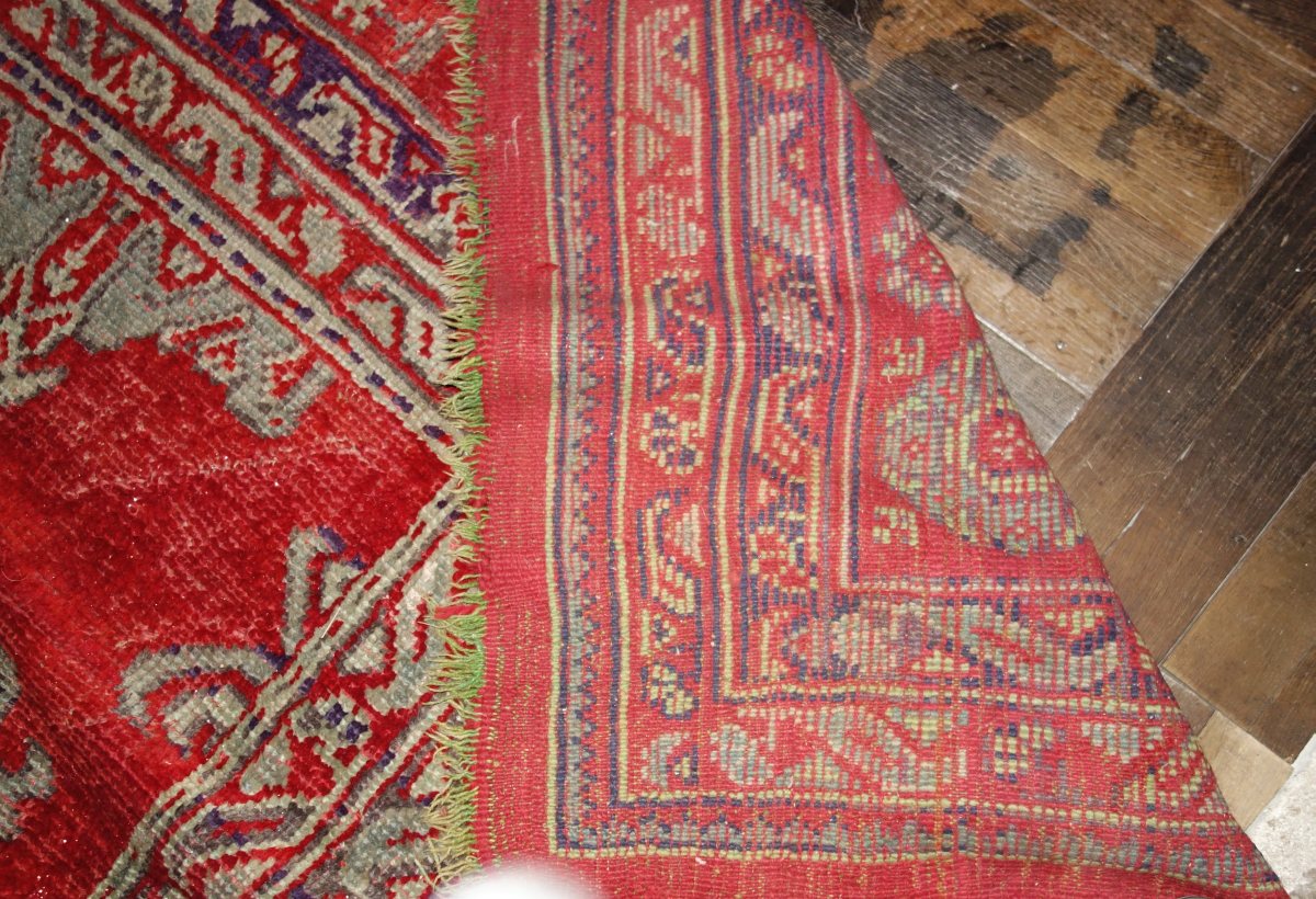 TAPIS Smyrne, vers 1900, fond rouge, décor de frises de médaillons turquoises, bordure de fleurs entre des galons (usures notamment aux extrémités)