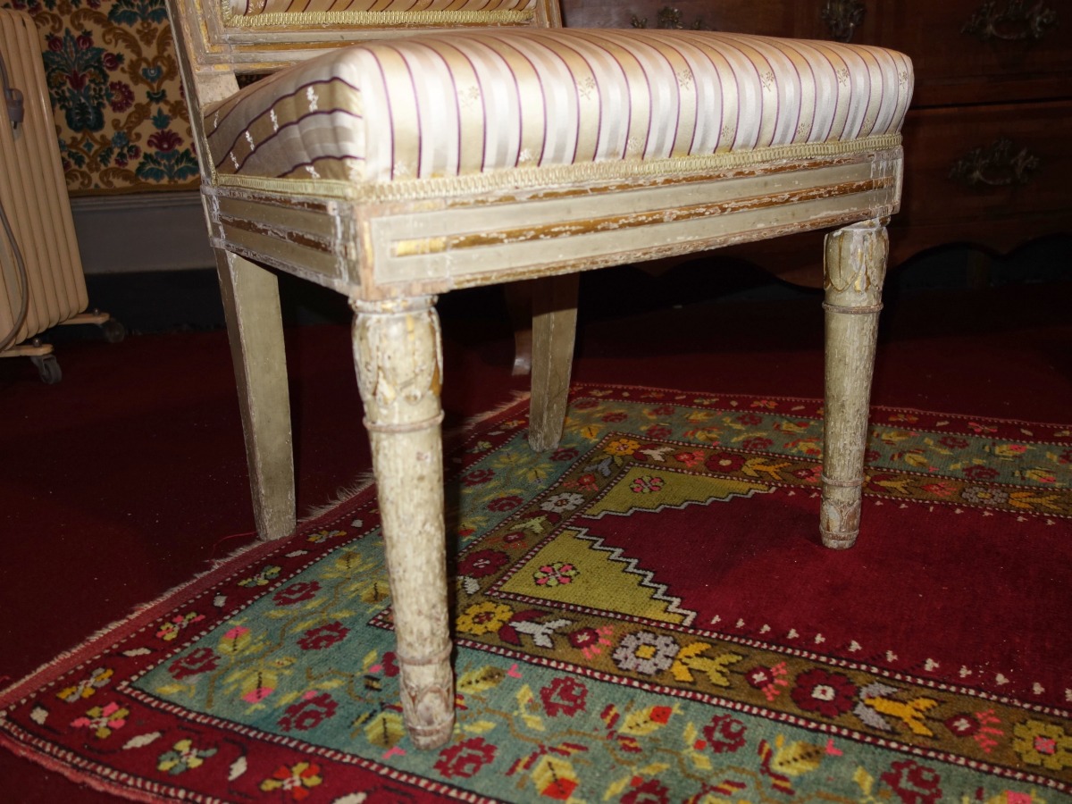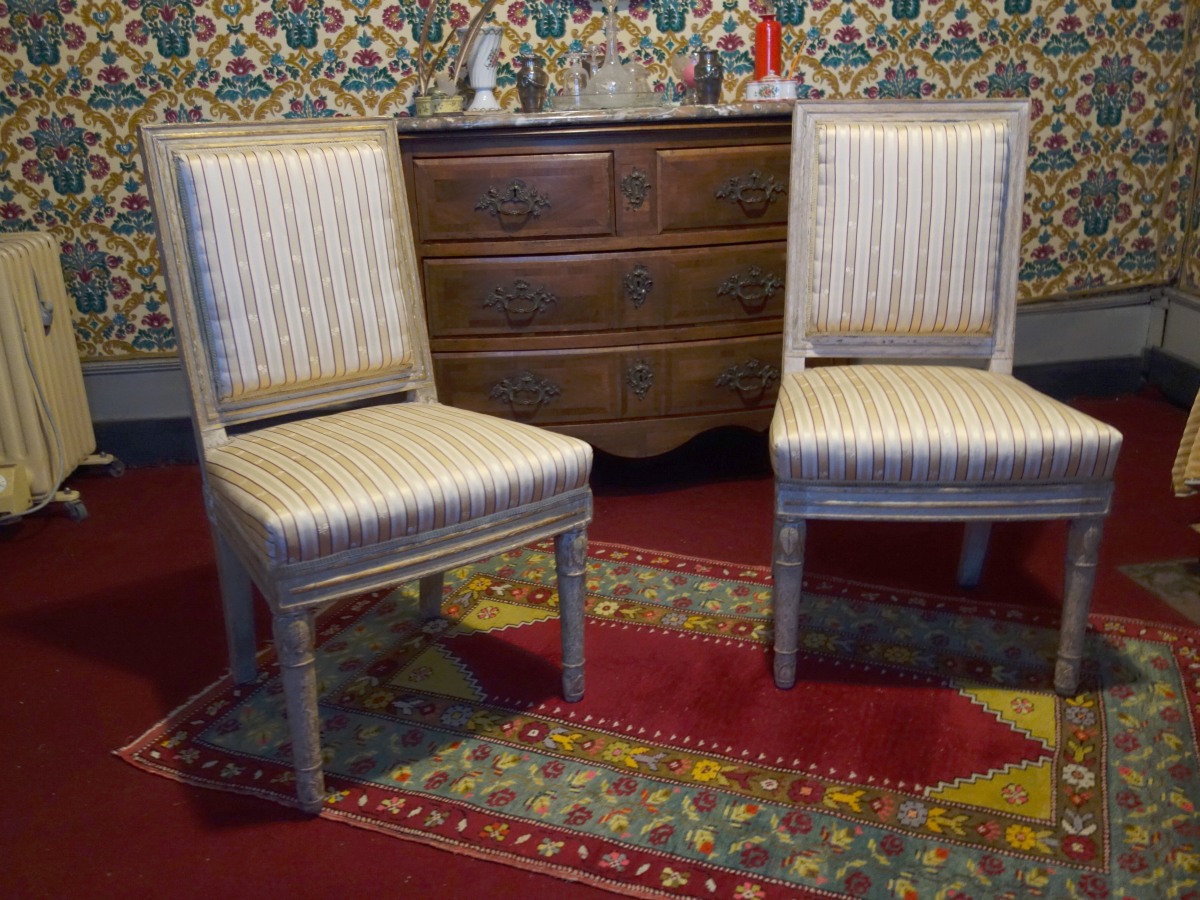 PAIRE de CHAISES à dossier plat de forme rectangulaire en bois laqué et doré, reposant sur des pieds avant fuselés.