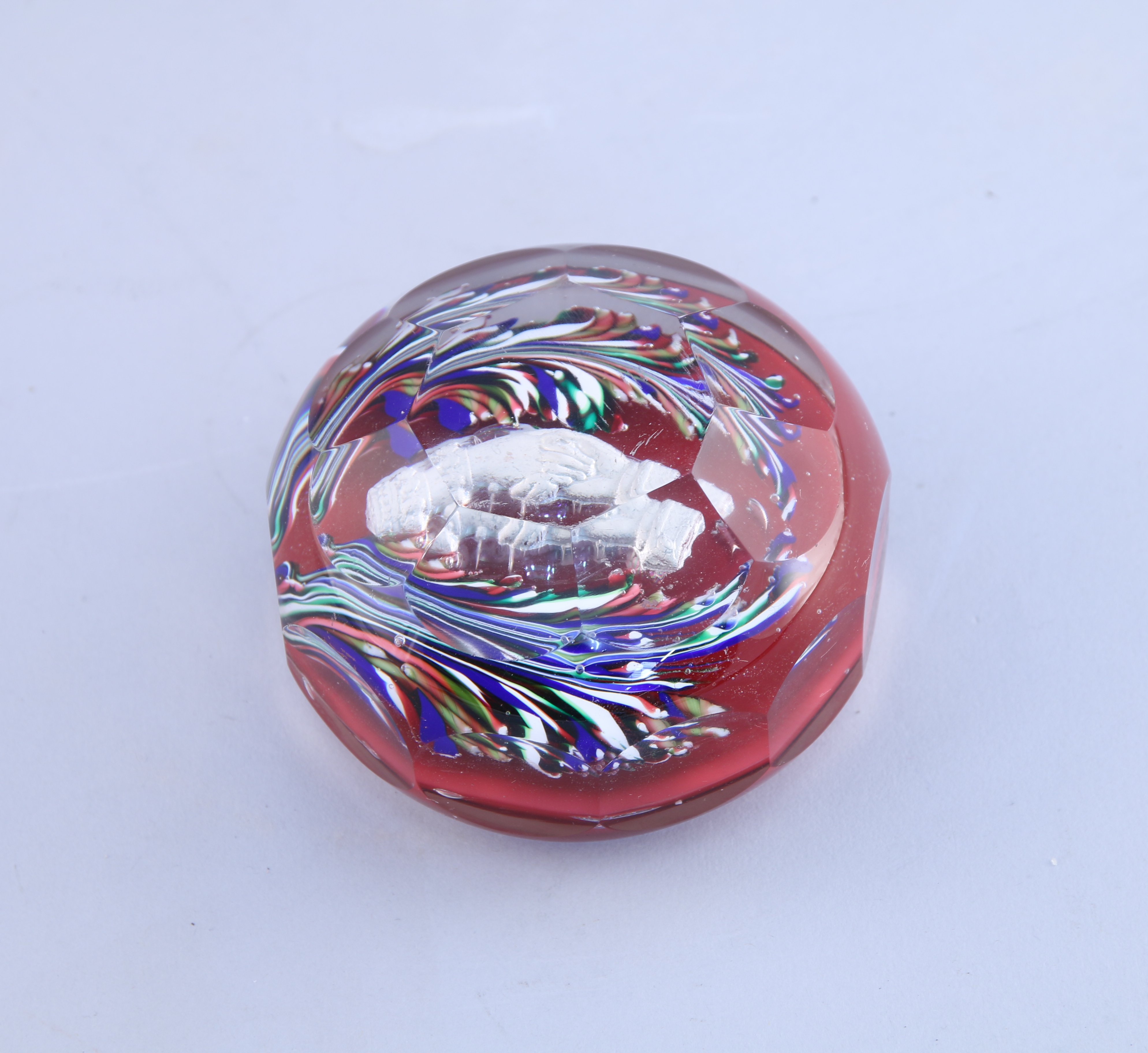 en verre, le fond rouge orné au centre d'un cristallo-cérame représentant la Concorde symbolisée par une poignée de mains, entouré de branches végétales multicolores. Milieu XIXe siècle ?
