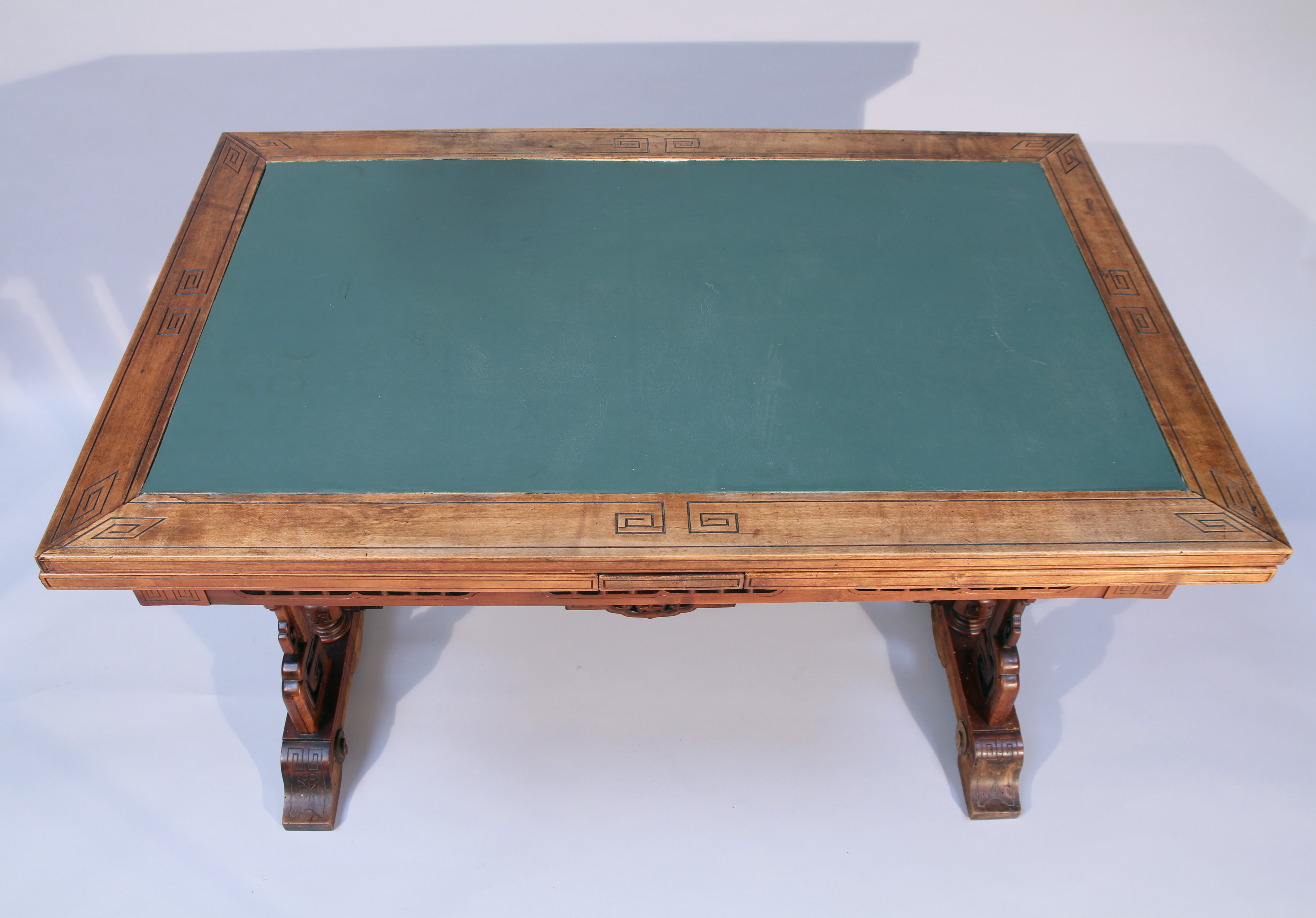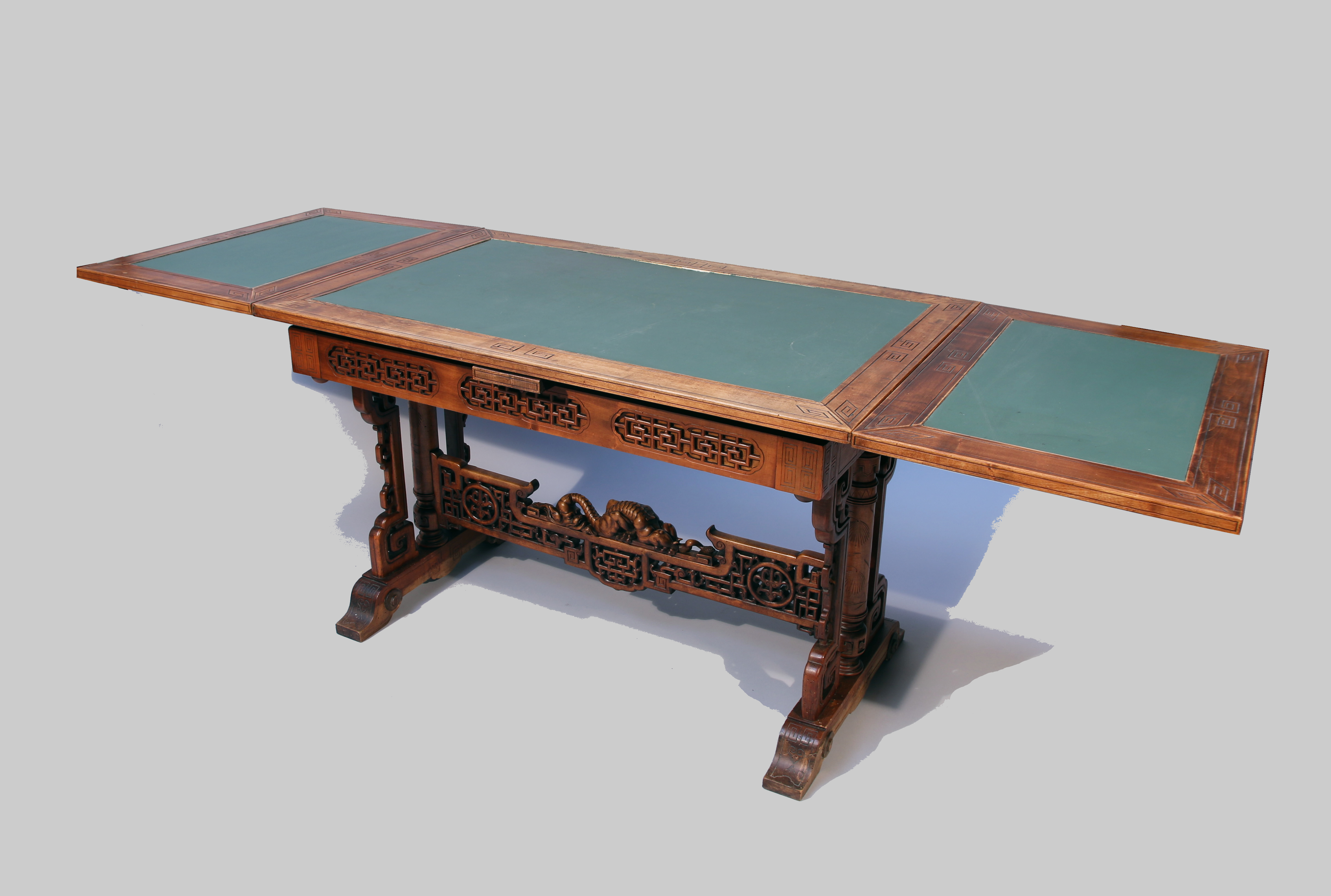 TABLE de BIBLIOTHÈQUE en bois sculpté et gravé. Le plateau de forme rectangulaire est foncé d'un cuir vert rapporté. Il s'ouvre en partie latérale par deux tirettes ornées de façon similaire et deux tiroirs. Ceinture gravée de filets à la grecque et centrée de fleurs et bambous. Deux pieds patins ajourés d'enroulements japonisants sont réunis par une entretoise ornée d'un spectaculaire dragon sculpté en ronde bosse.