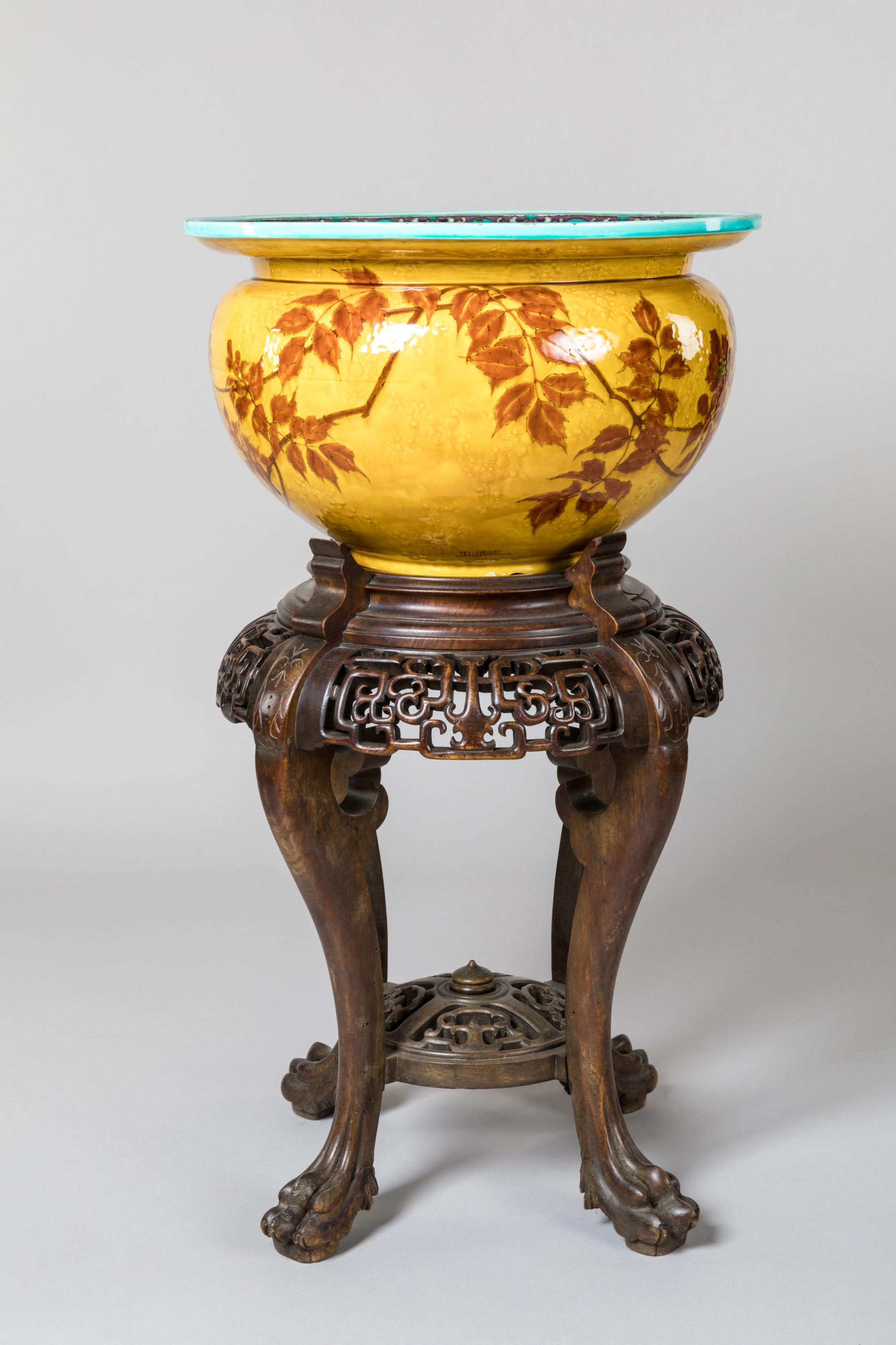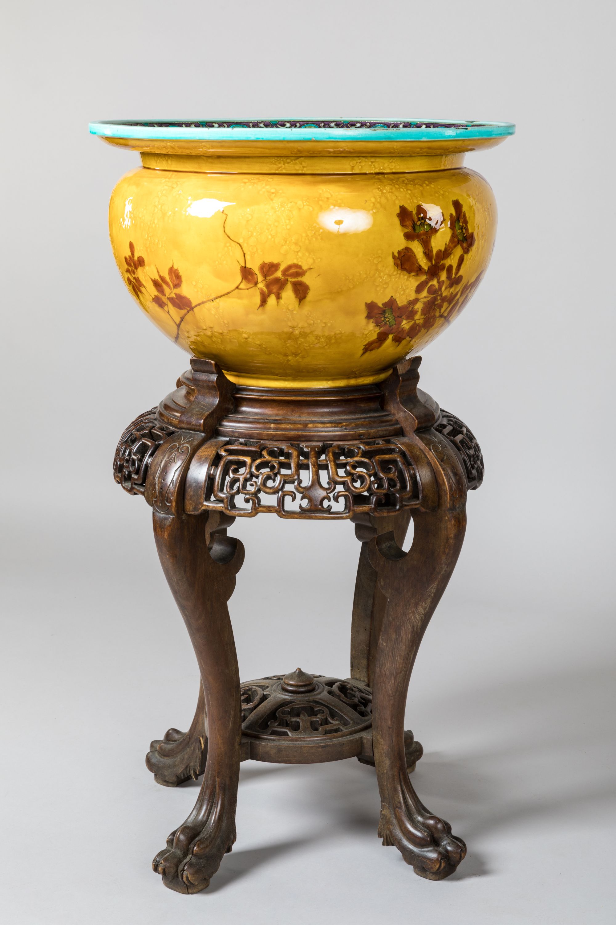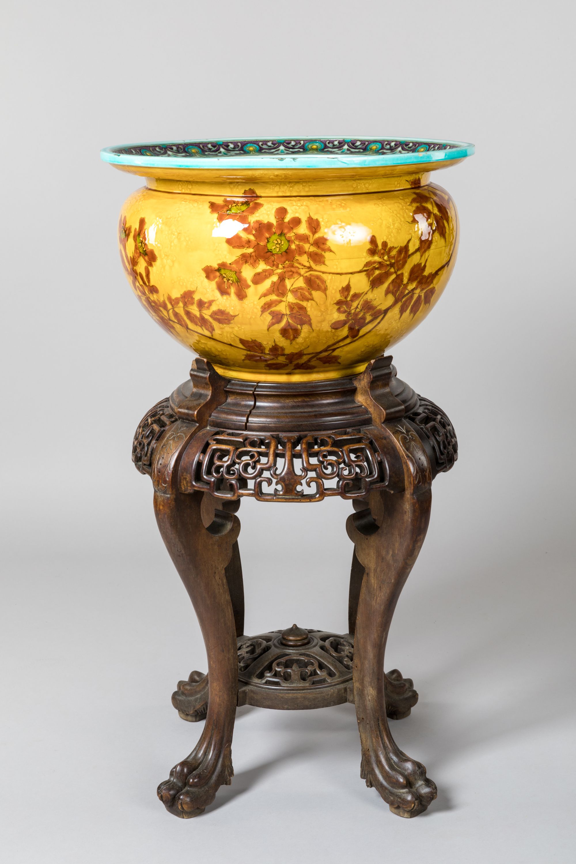 JAPANESE-INSPIRED enameled limestone BASIN and wooden STAND. After Théodore DECK, by MILET, DIFFLOTH and VIARDOT. The basin signed by Diffloth and Milet, Sèvres. Provenance: according to the owner's family, ordered to Viardot by Charles Quartero (born in Medea in 1866), landowner in Cherchell (Algeria). By descent.