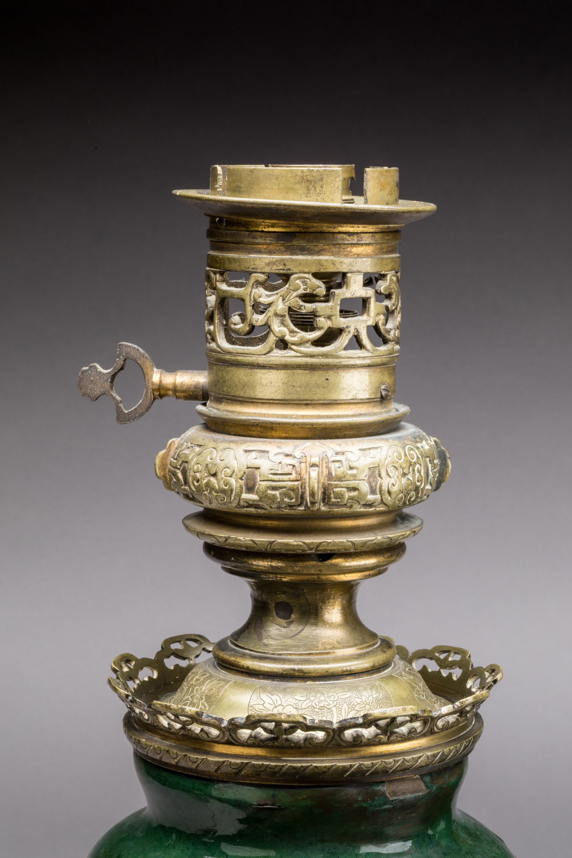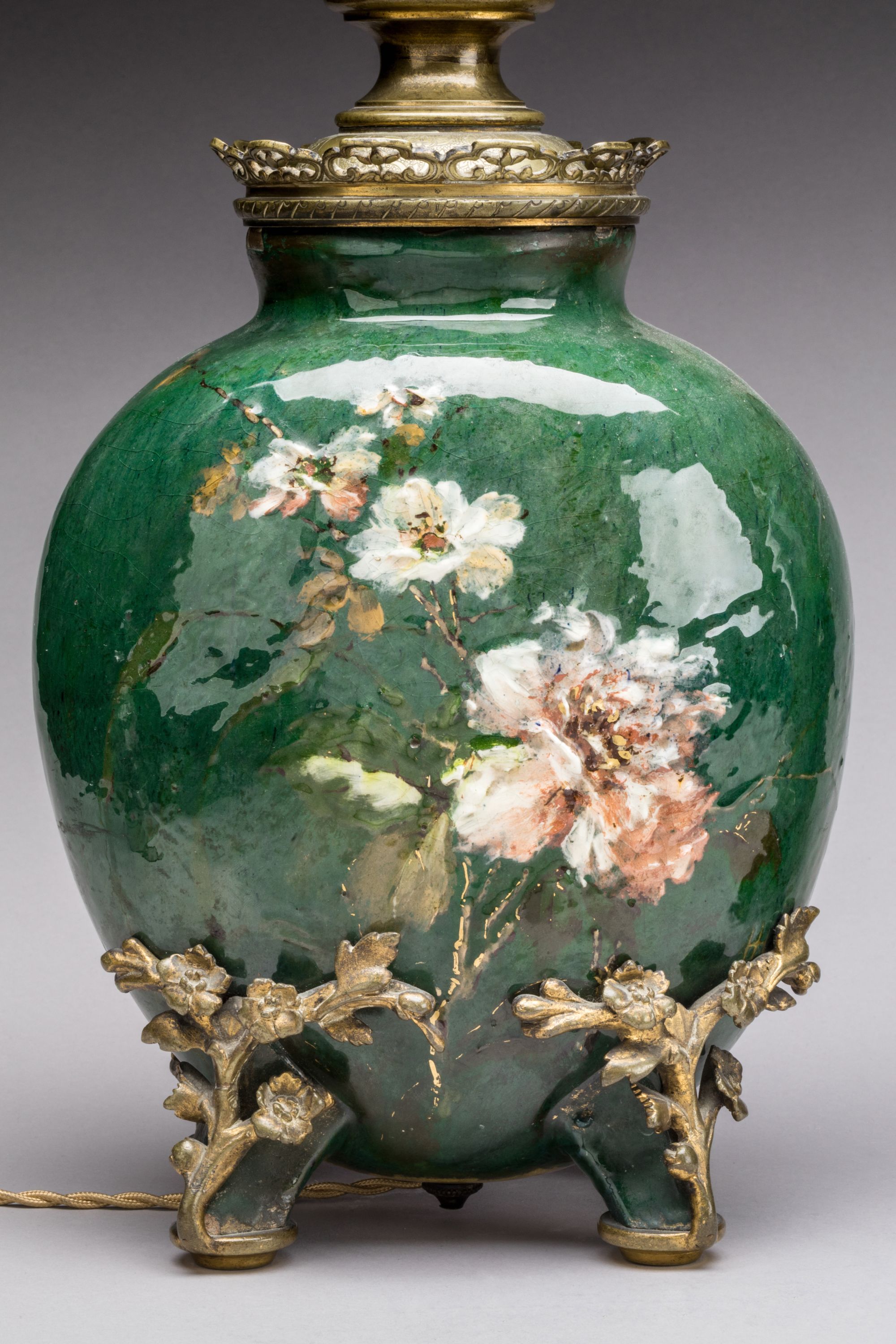 Décor de fleurs de cerisier sur un fond vert, en forme de gourde reposant sur quatre petits pieds. Spectaculaire MONTURE en bronze à motifs de branches fleuries de cerisier enveloppant chacun des pieds. Le col monté pour un éclairage à l'huile avec des cuivres gravés de fleurs de cerisiers et à motifs de chinoiseries.
