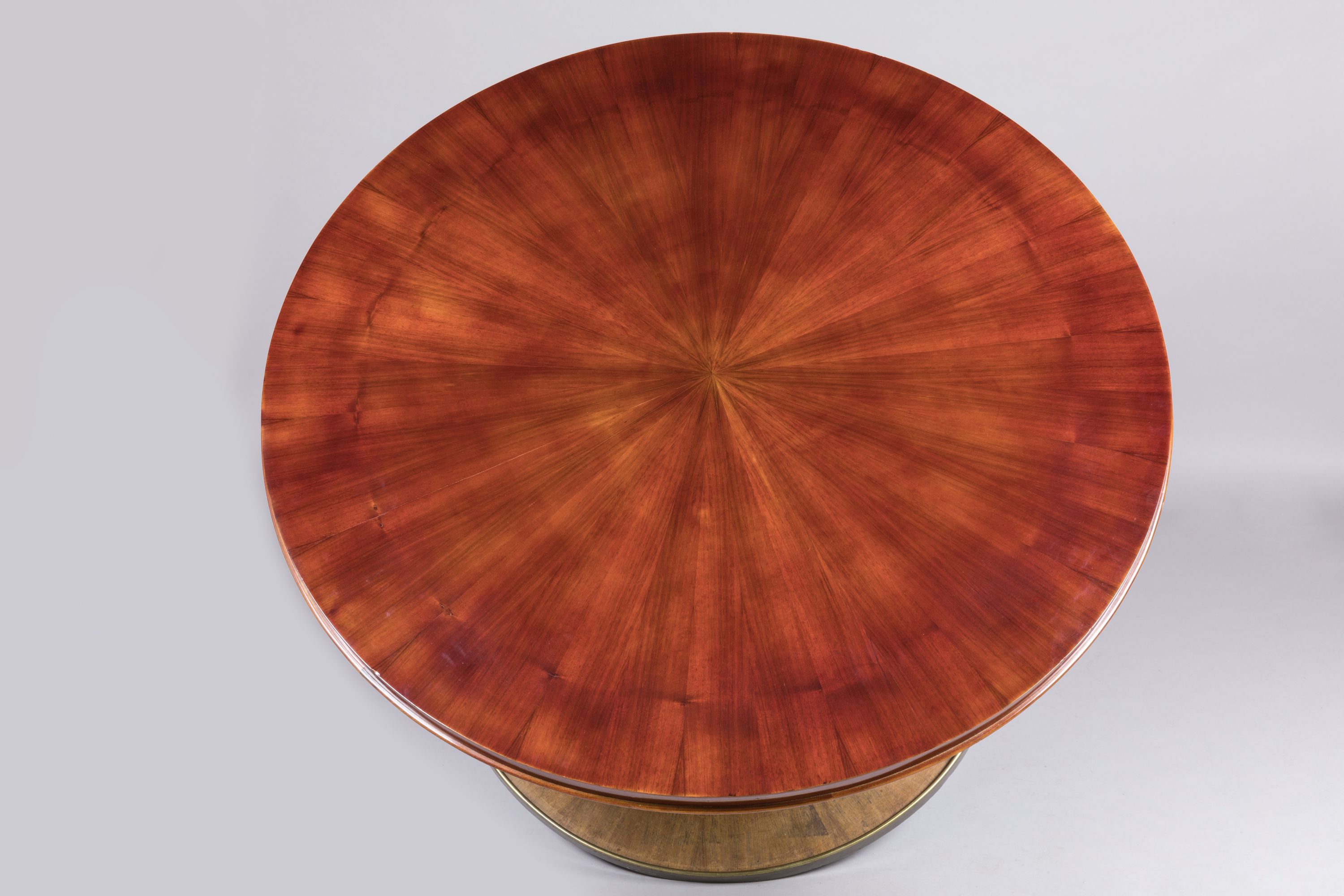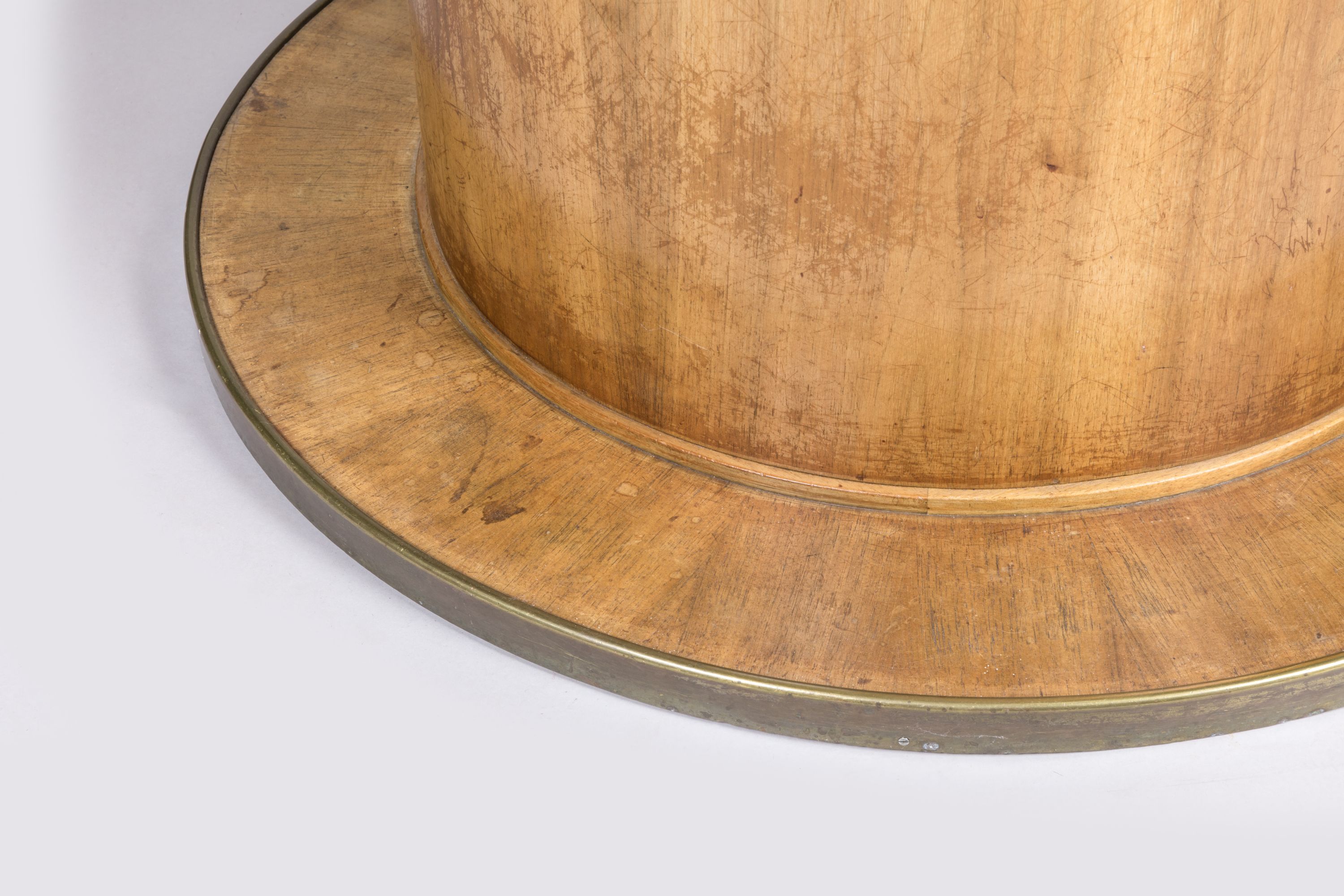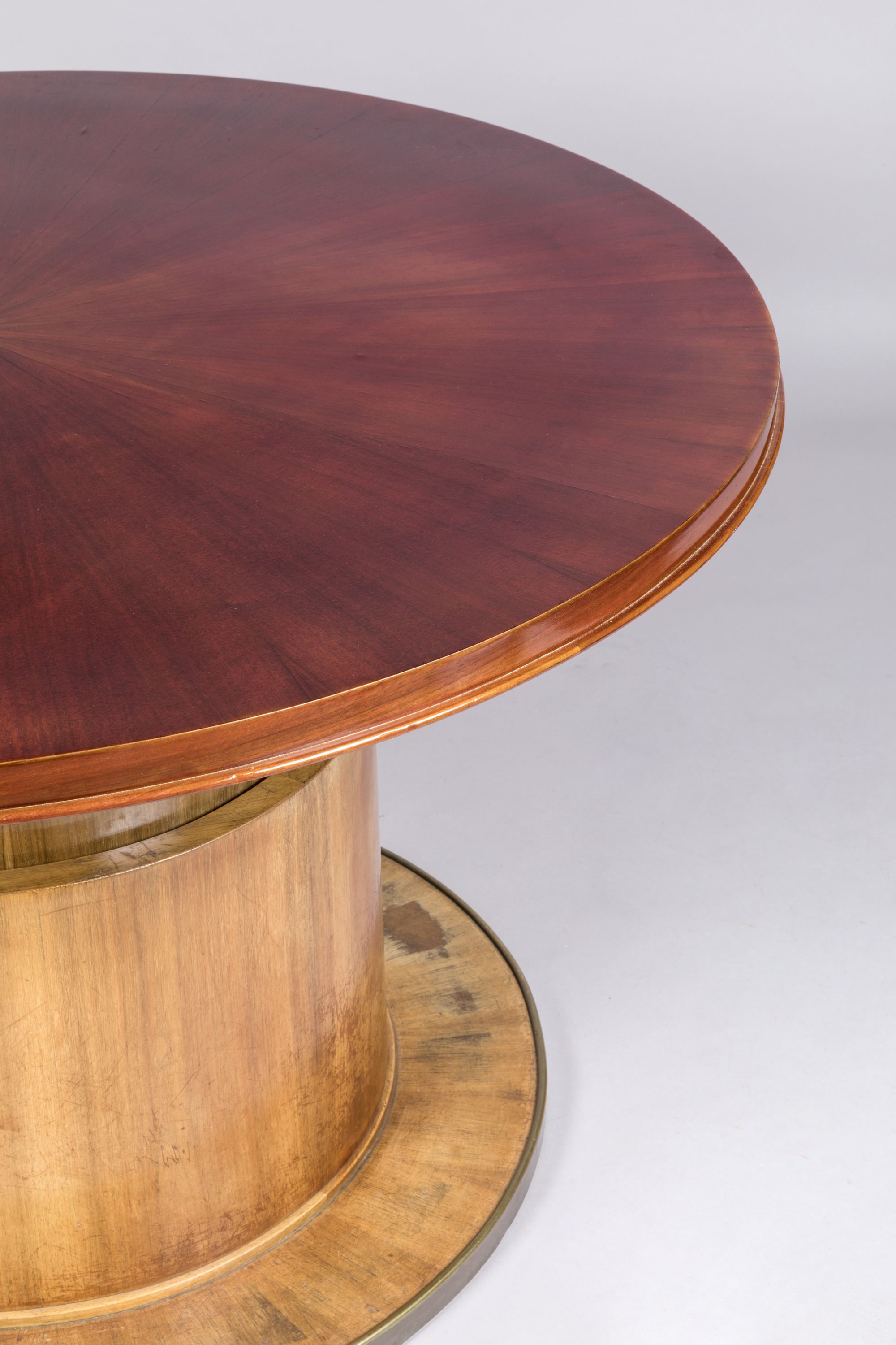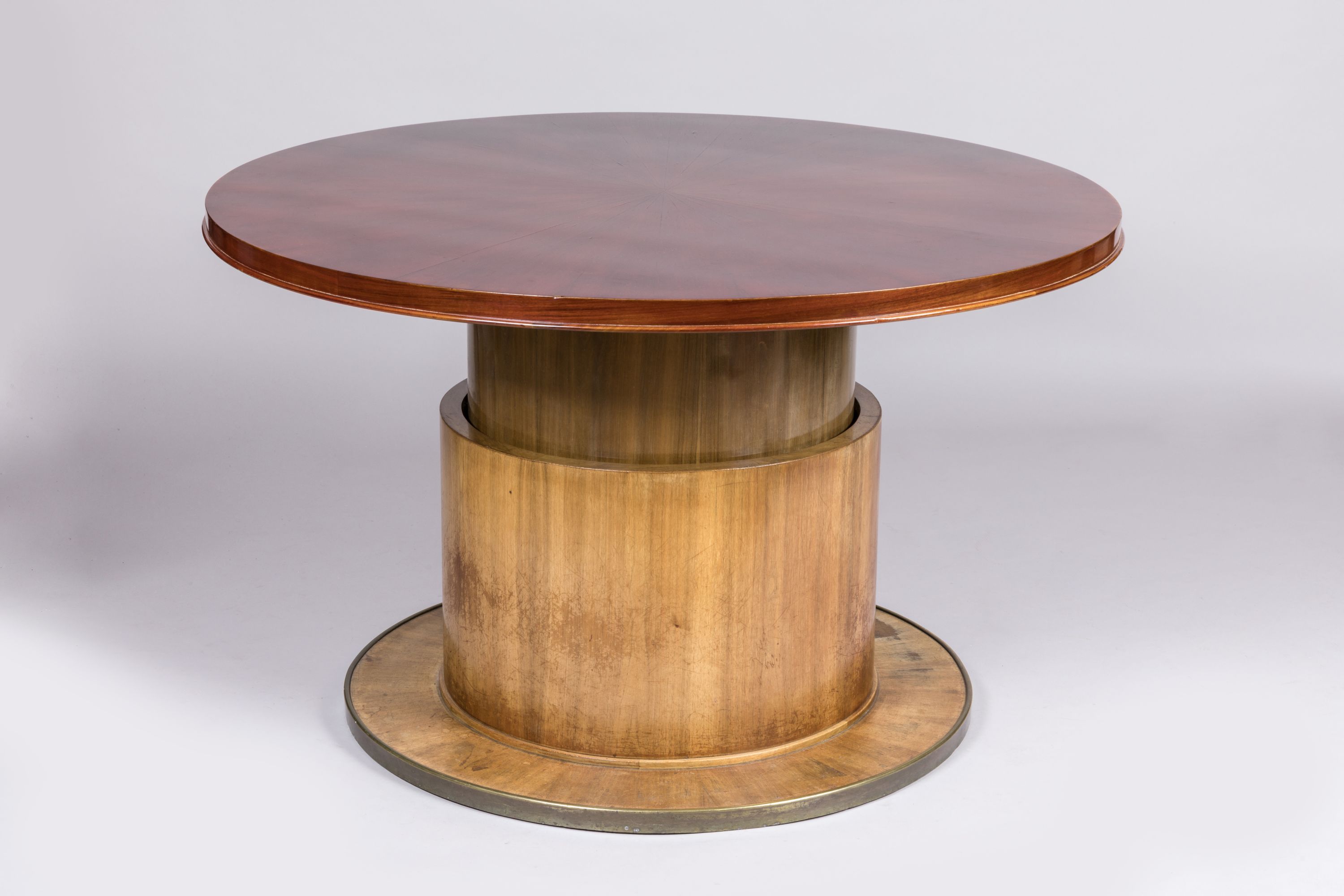 en placage de noyer. Le plateau à marqueterie rayonnante s'élève et s'abaisse dans un fût central reposant sur une base circulaire ceinte d'une lingotière en bronze.