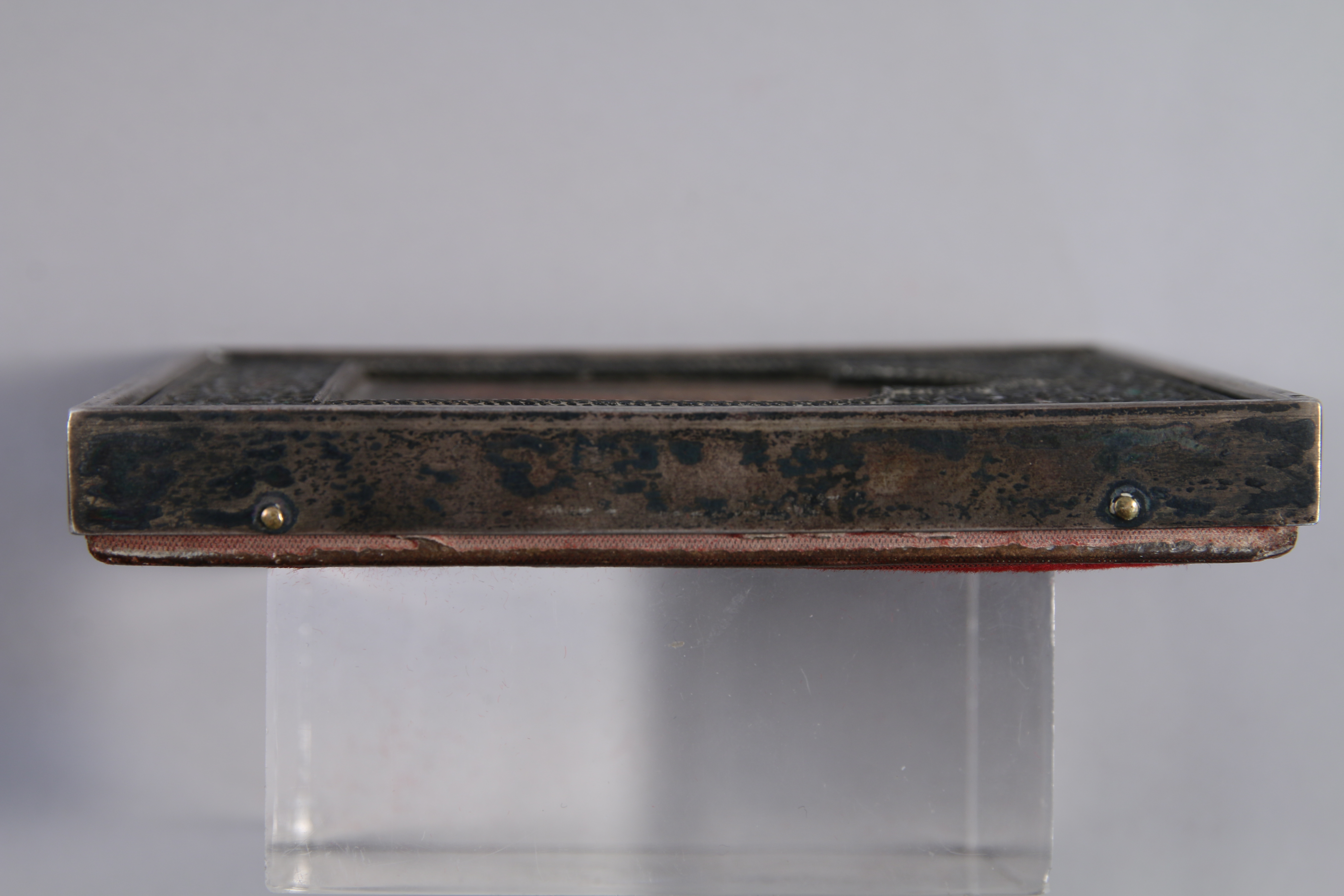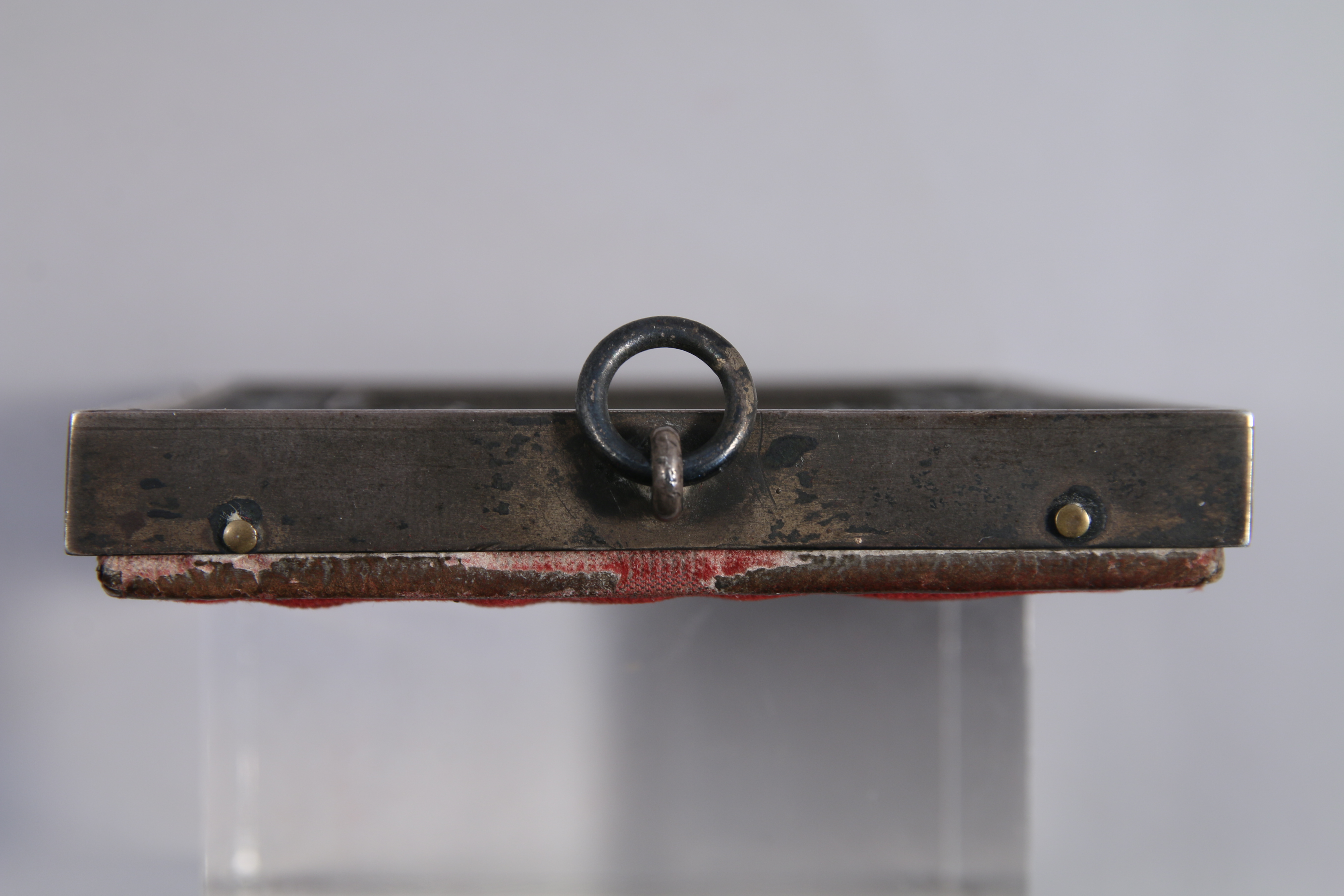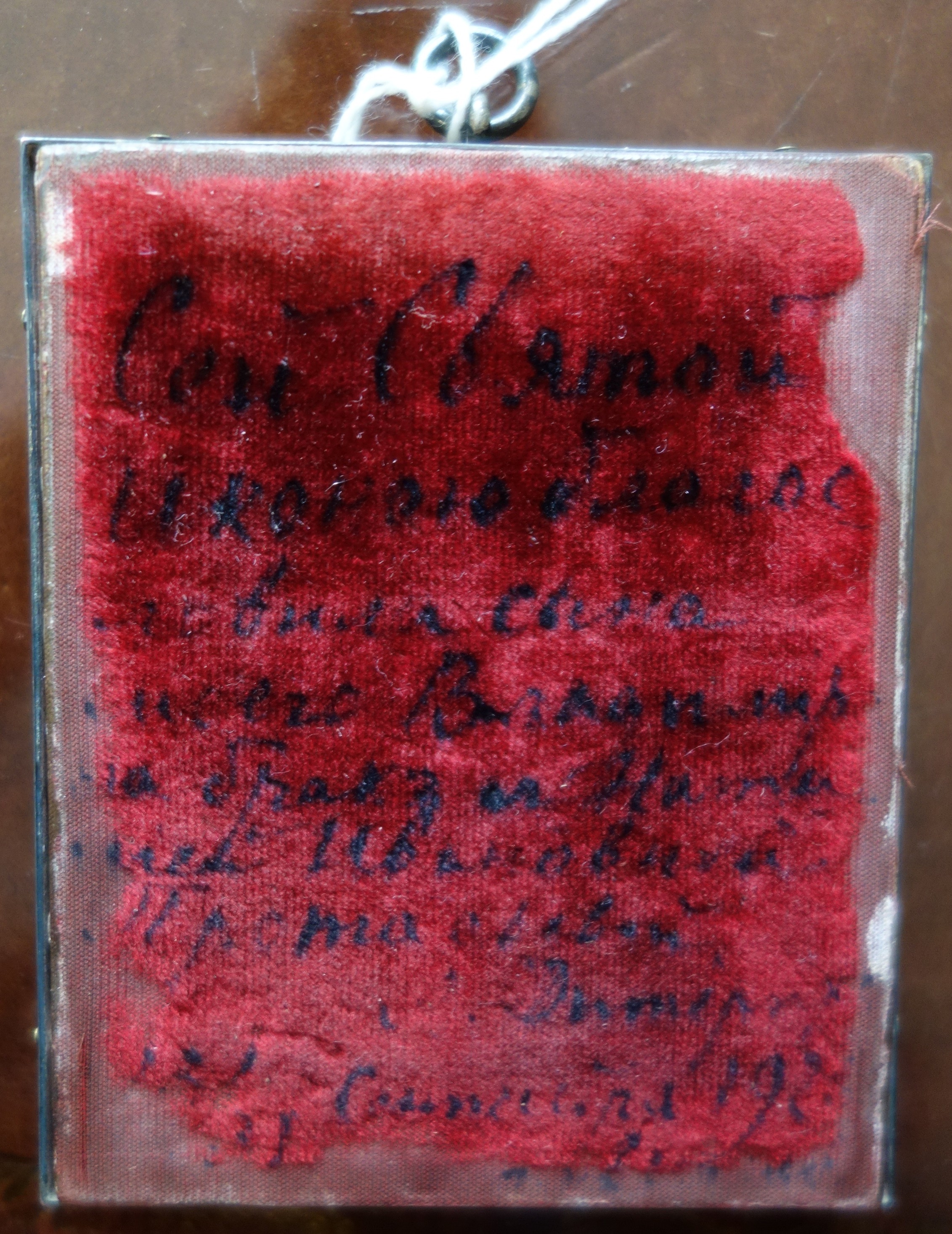 Le dos recouvert de velours rouge usé comportant une inscription manuscrite en cyrillique indiquant que cette icône a été offerte à un fils Vladimir à l'occasion de son mariage en 1926 (?).